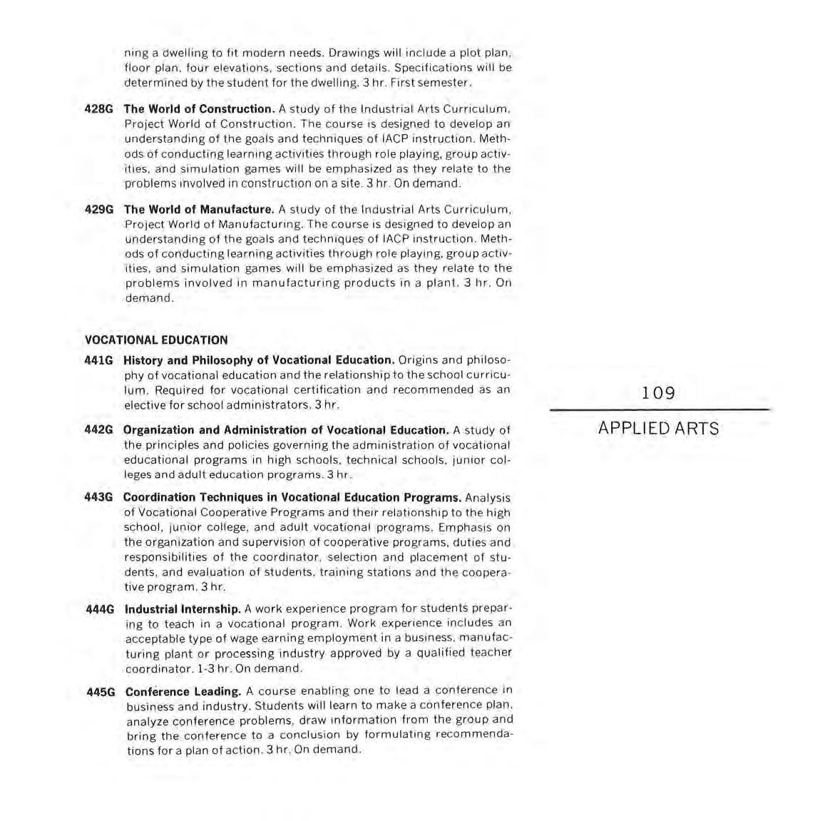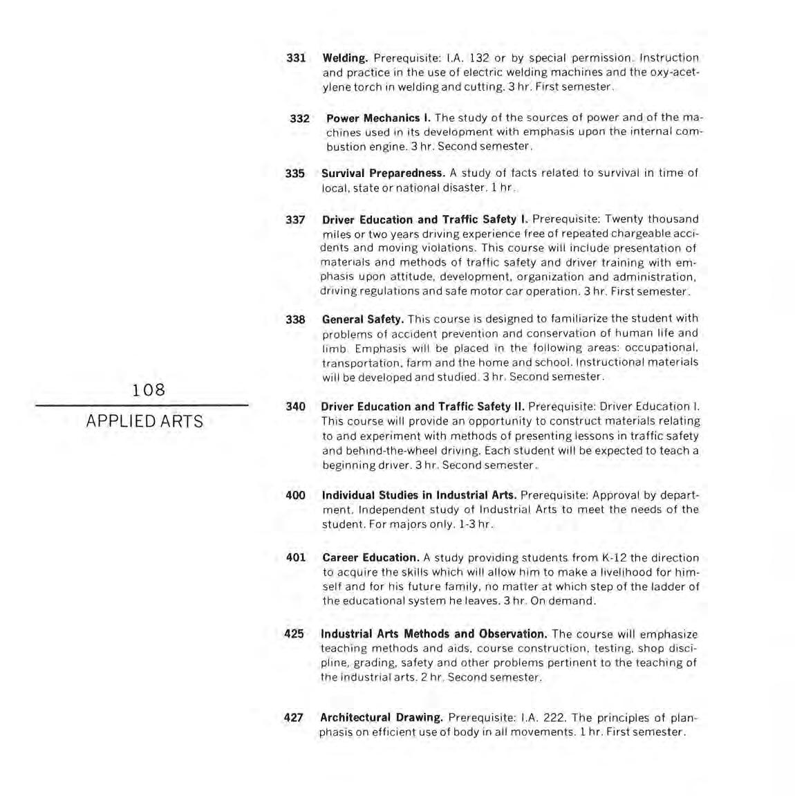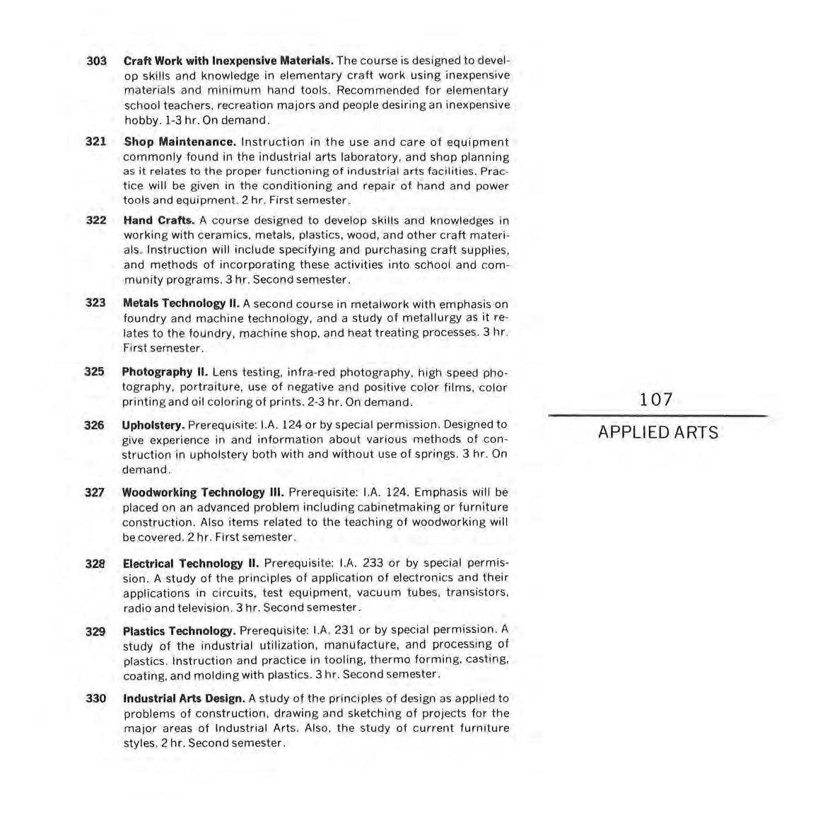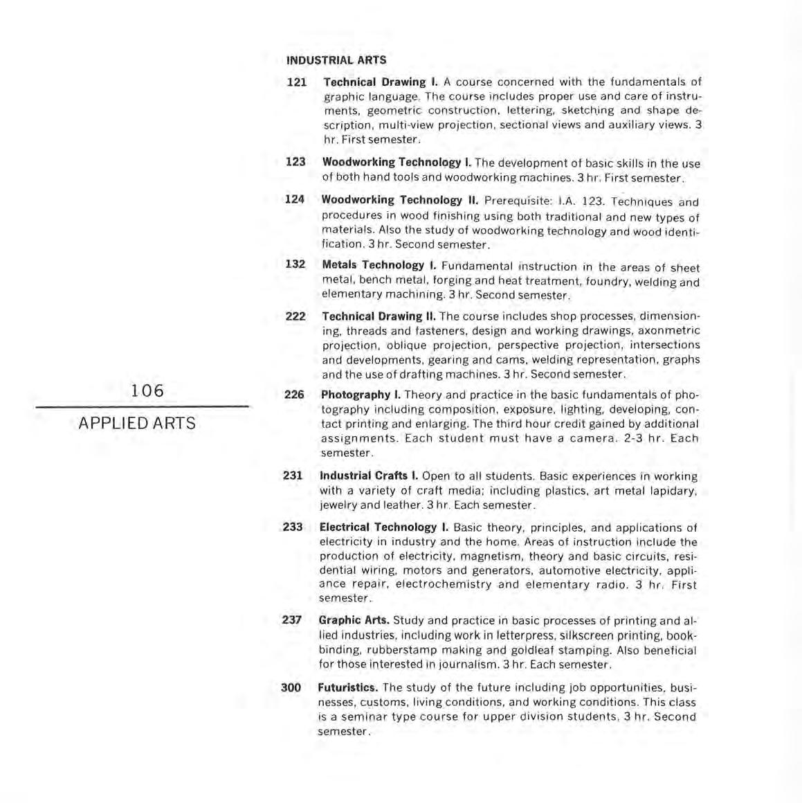 INDUSTRIAL ARTS. The Industrial Arts Building was opened in 1960 and named for A. V Larson, who had served as Chairman of the Industrial Arts Department for many years This facility is used to provide training and equipment in power mechanics, electricity-electronics, industrial crafts, woodworking, metal working, drafting, graphic arts, photogr a phy, and related areas .
