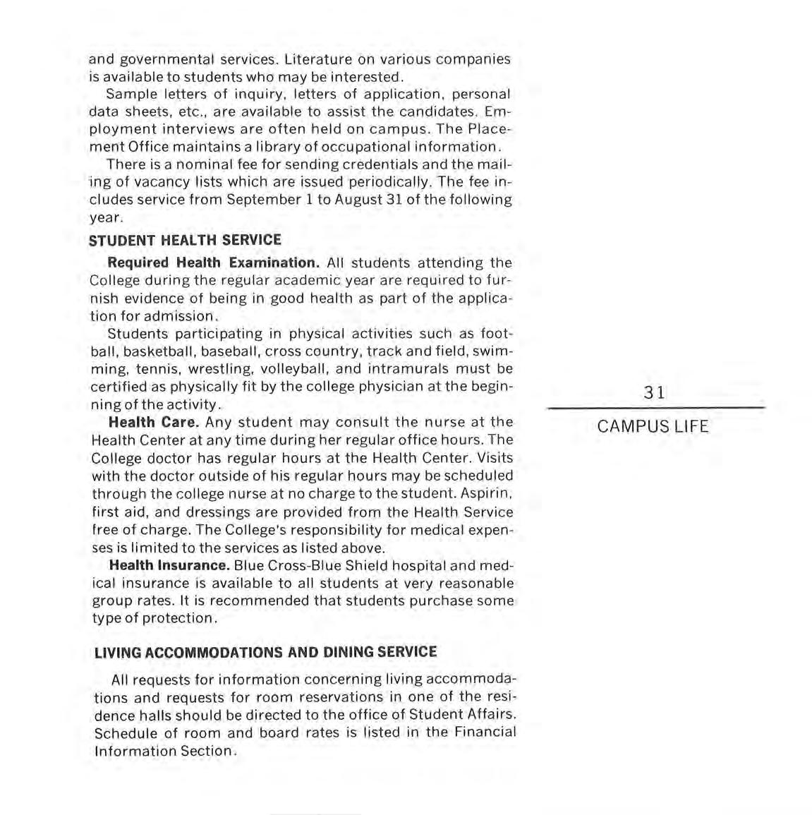 HEALTH CENTER. The Student He alth Service, which provides first aid treatment and hospitilization for students needing emergency medical care, operates in the Health Center . A registered nurse is in residence at the Center and works under the direction of the College physician.