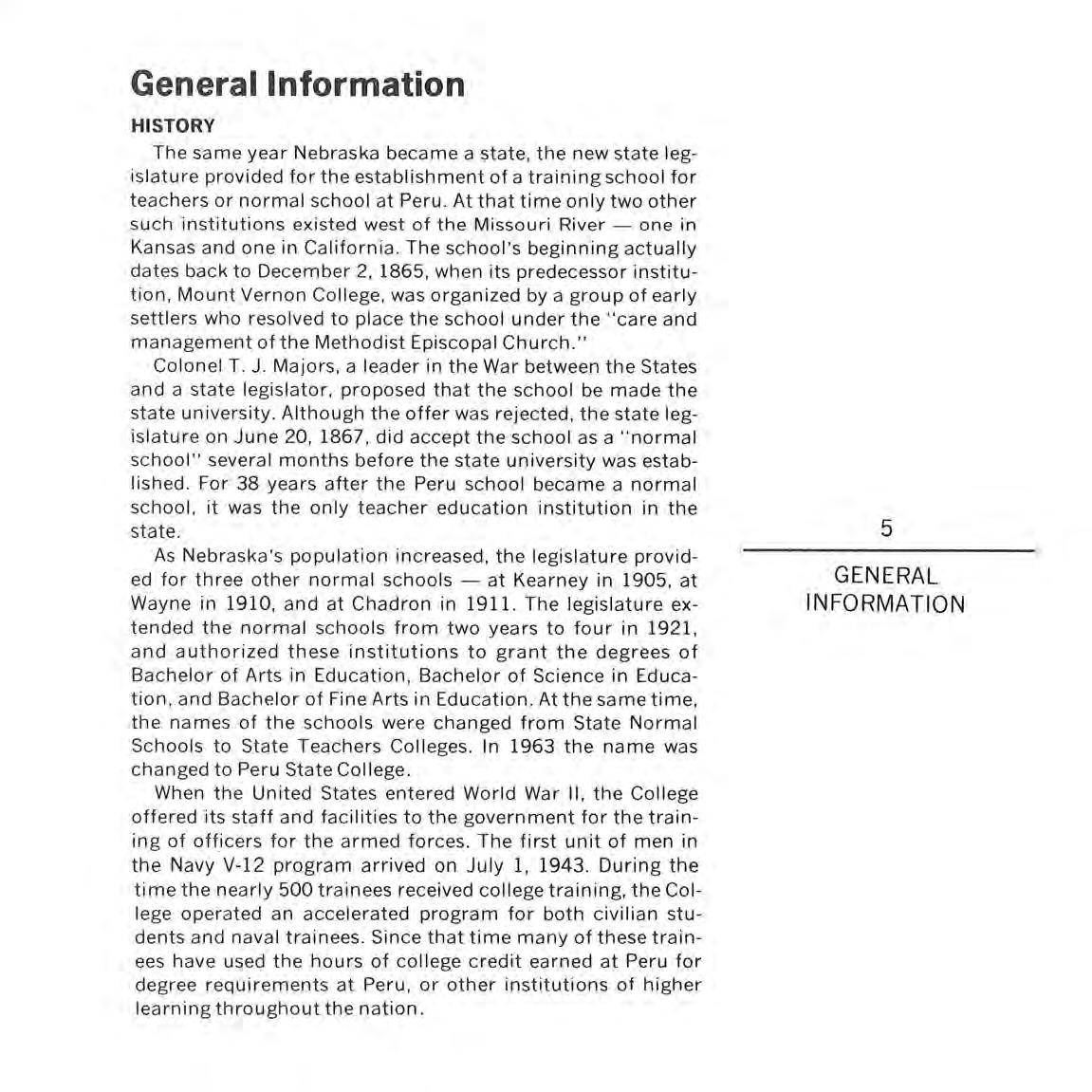 The same year Nebraska became a state, the new state legi s lature provided for the establishment of a training school for teachers or normal school at Peru. At that time only two other such institutions existed west of the Missouri River - one in Kansas and one in California . The school's beginning actually dates back to December 2, 1865, when its predecessor institution, Mount Vernon College, was organized by a group of early sett lers who resolved to place the school under the "care and management of the Methodist Episcopal Church . "