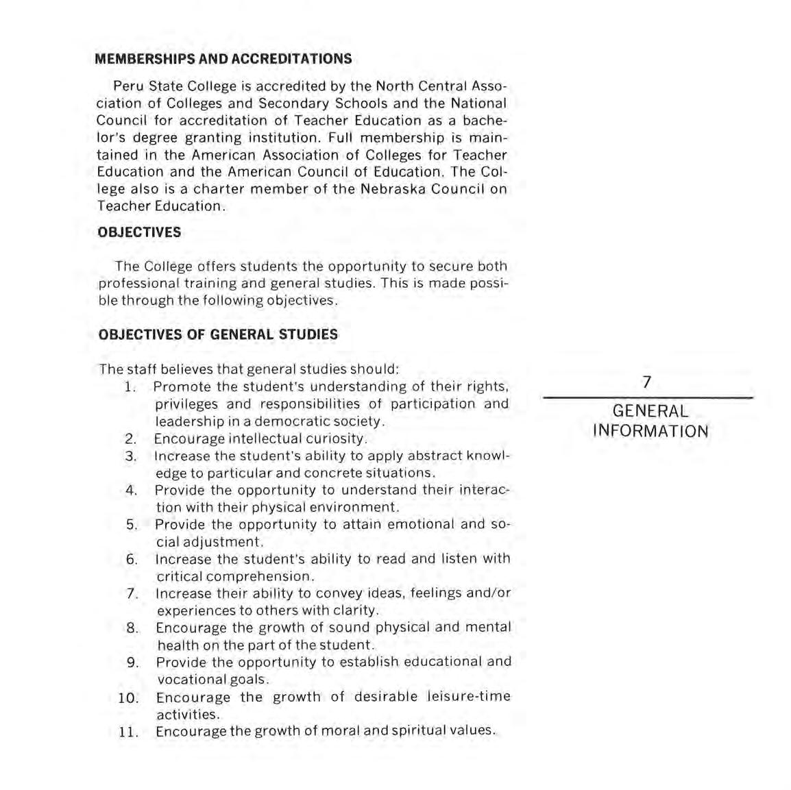 Peru State College is accredited by the North Central Association of Colleges and Secondary Schools and the National Council for accreditation of Teacher Education as a bachelor's degree granting institution . Full membership is maintained in the American Association of Colleges for Teacher Education and the American Council of Education. The College also is a charter member of the Nebraska Council on Teacher Education.
