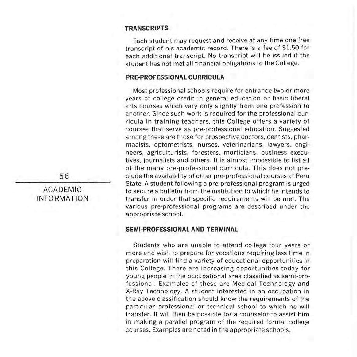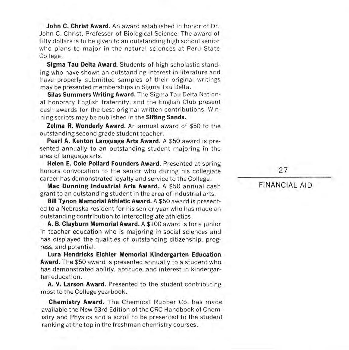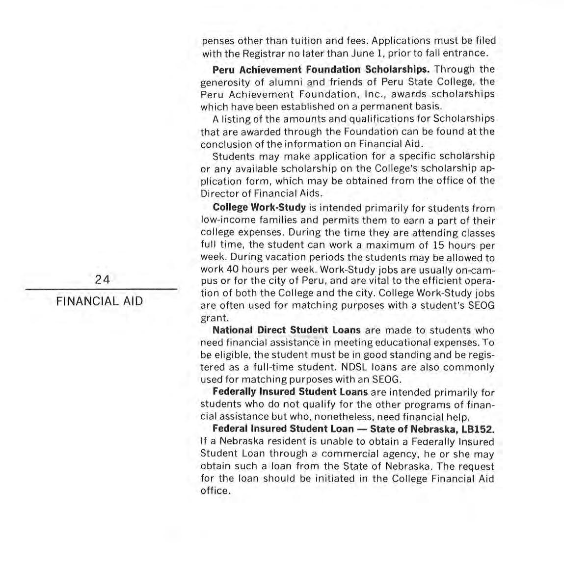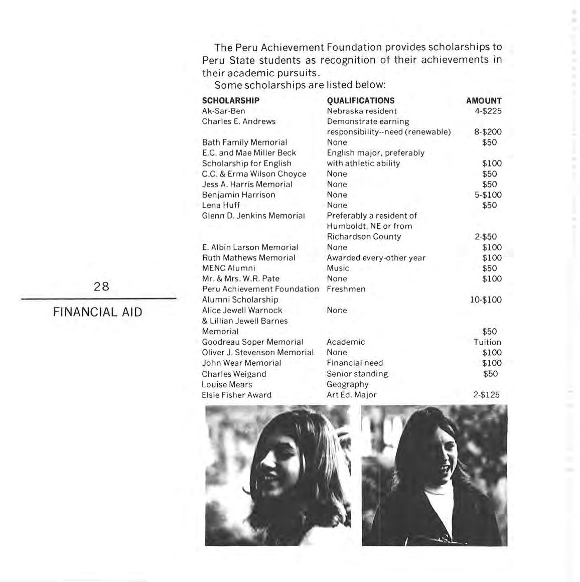 Since the beginning in 1955, the Peru Achievement Foundation has provided scho l arsh ip s; administered sc hol ars hips for various organizations, individuals and groups; furnished a ll matching funds for the National Defense Student Loan Program; provided for the furnishings of the small dining room in the Student Center; and has in other ways promoted the College .