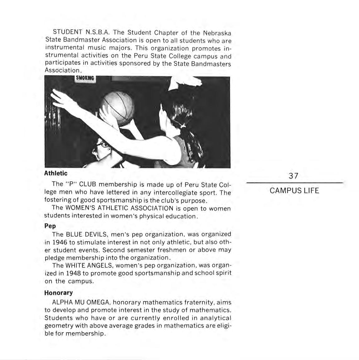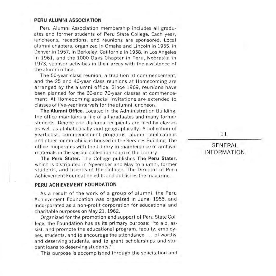 Peru Alumni Association membership includes a ll graduates and former students of Peru State College. Each year, luncheons, receptions , and reunions are sponsored. Local alumn i chapters, organized in Omaha and Lin coln in 1955, in Denver in 1957, in Berkeley, Caiifornia in 1958, in Los Angeles in 1961 , a nd the 1000 Oaks Chapter in Peru , Nebraska in 1973 , sponsor activities in their areas with the assistance of the a lumni office.