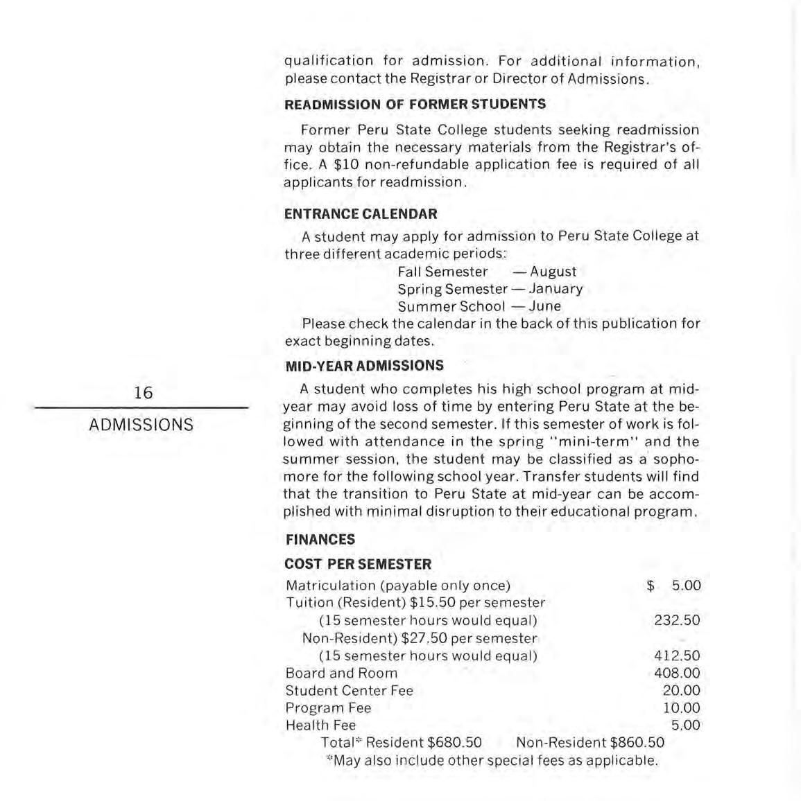 Requests for admission materials should be directed to the Director of Admissions, Peru State College, Peru , Nebraska, 68421.