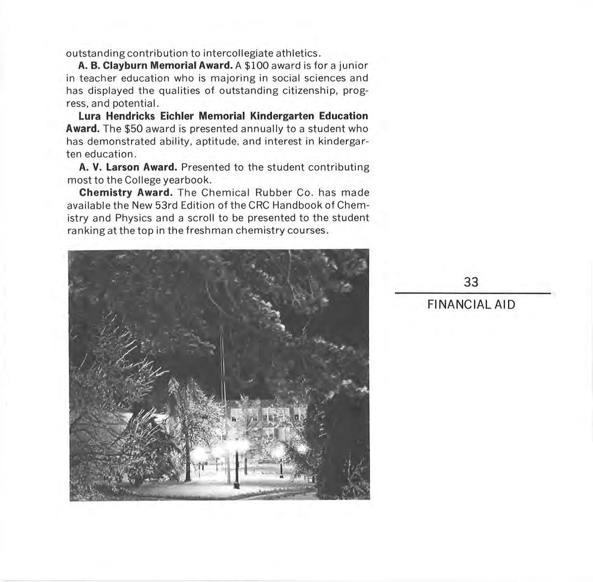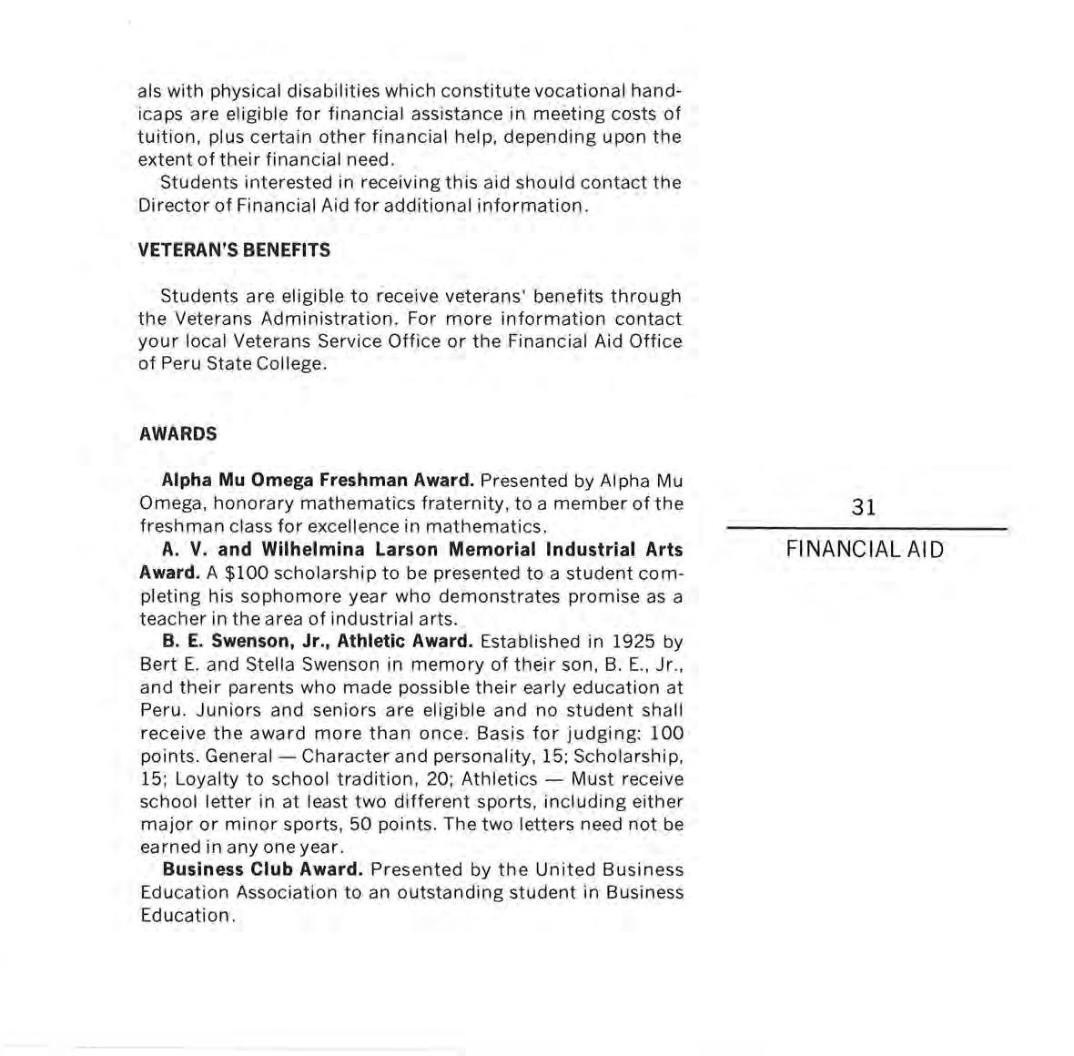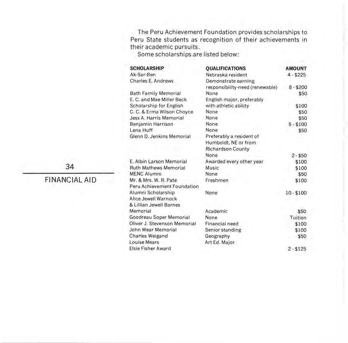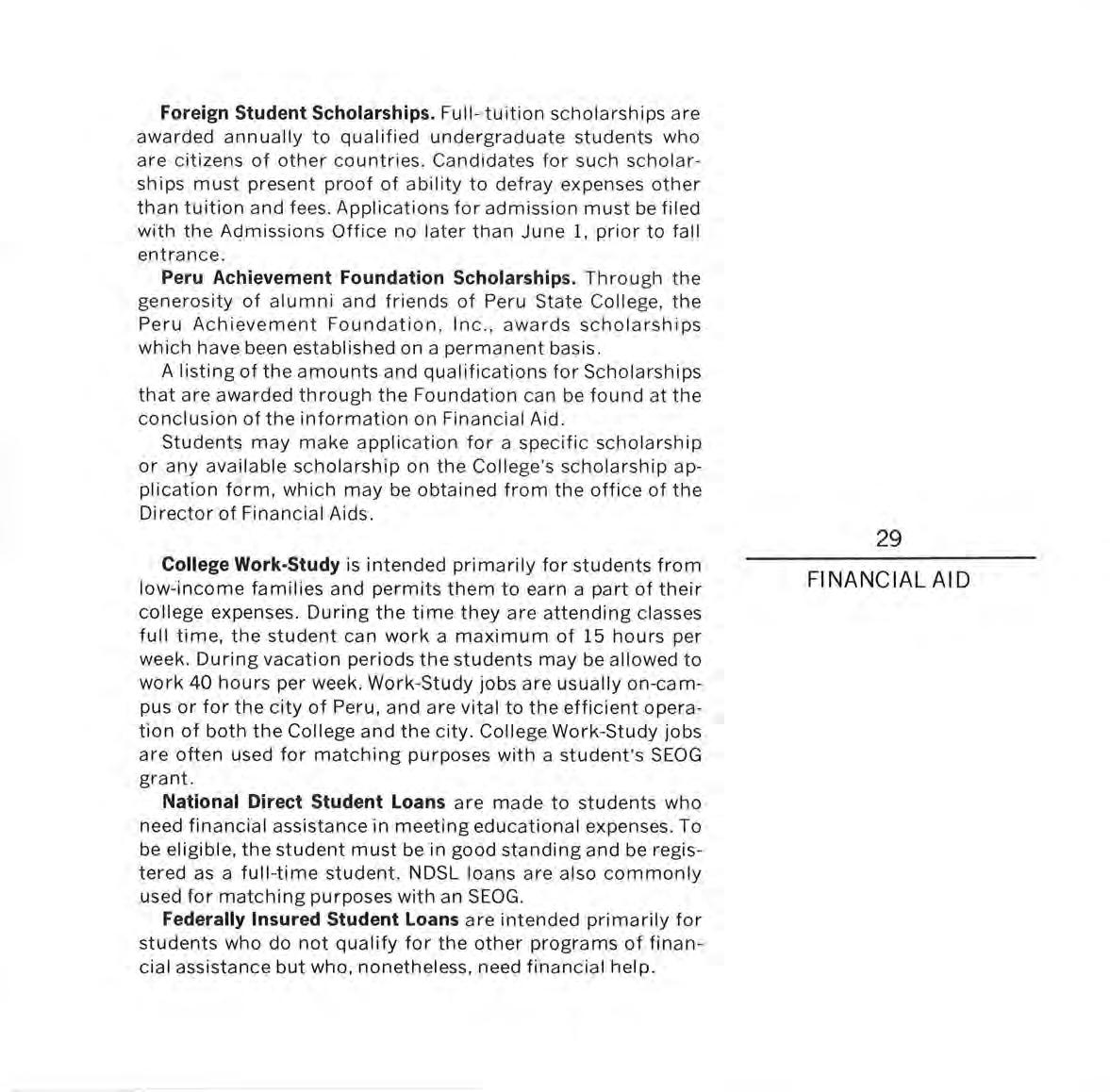 Since the beg innin g in 1955, the Peru Achievement Foundat ion has provided scho l arsh i ps; adm ini stered scho l arsh ip s for var i ous organ izations, indivi dua l s and groups ; furnished a ll match in g funds for the National Defense Student Loan Program; provided for t h e furnishings of the sma ll dining room in the Student Center; and has in other ways promoted the Co ll ege
