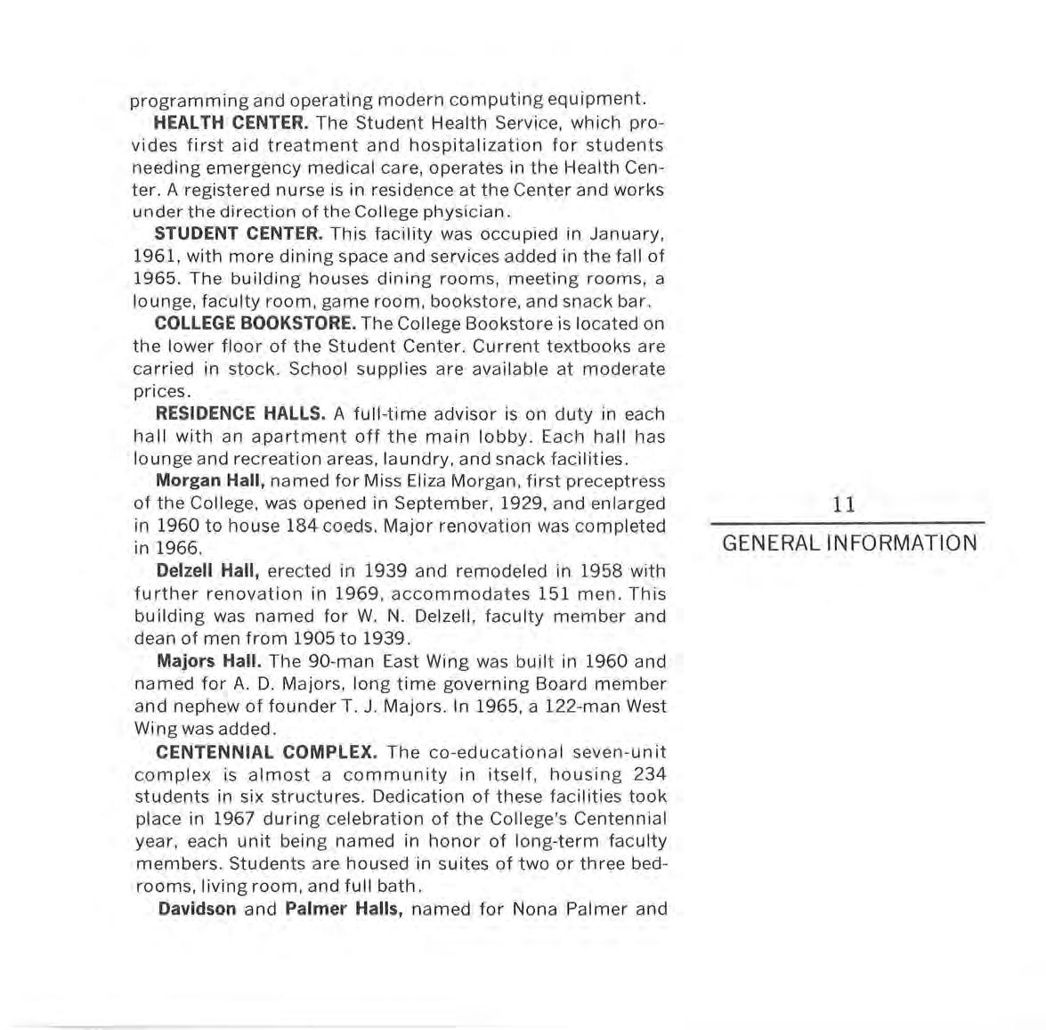 Morgan Hall, named for Miss Eli za Morgan, first preceptress of the College, was opened in September , 1929 , and en larged in 1960 to house 184 coeds . Major renovation was comp l eted in 1966