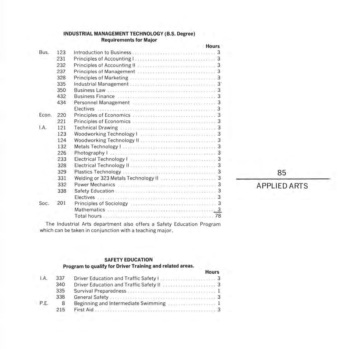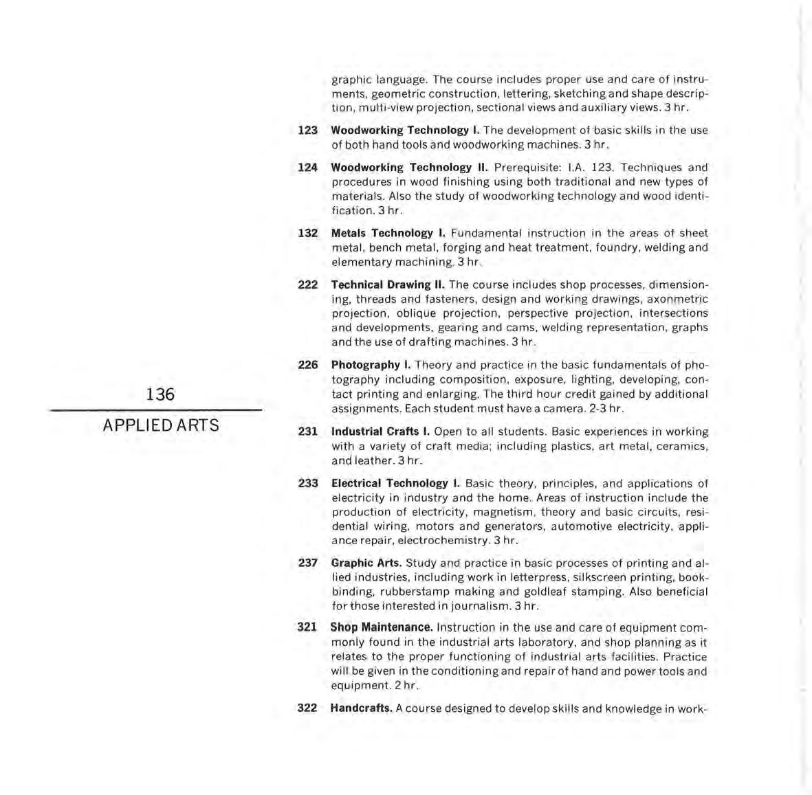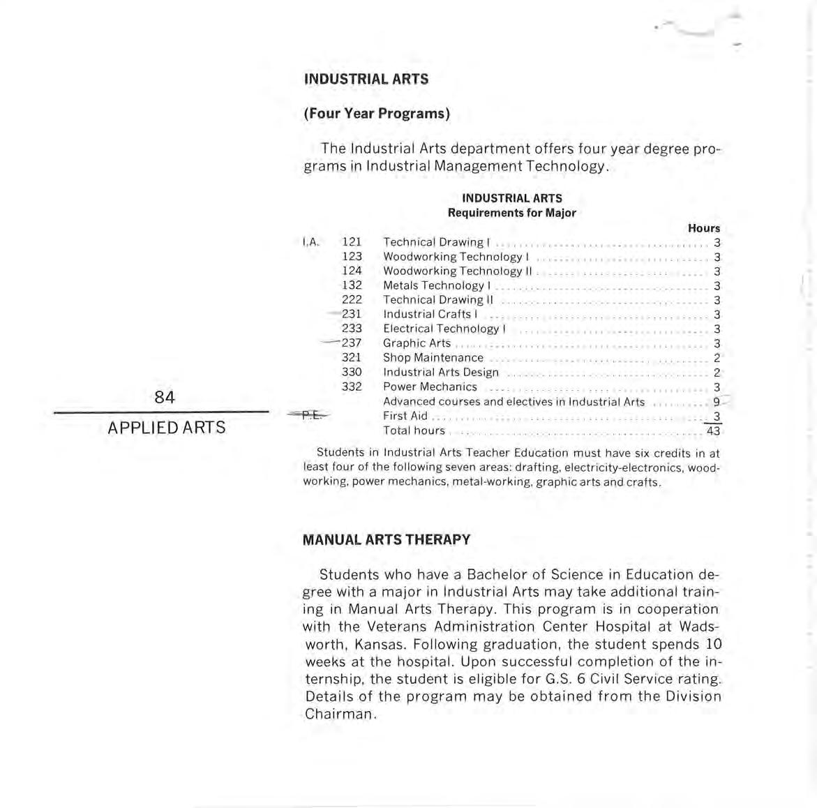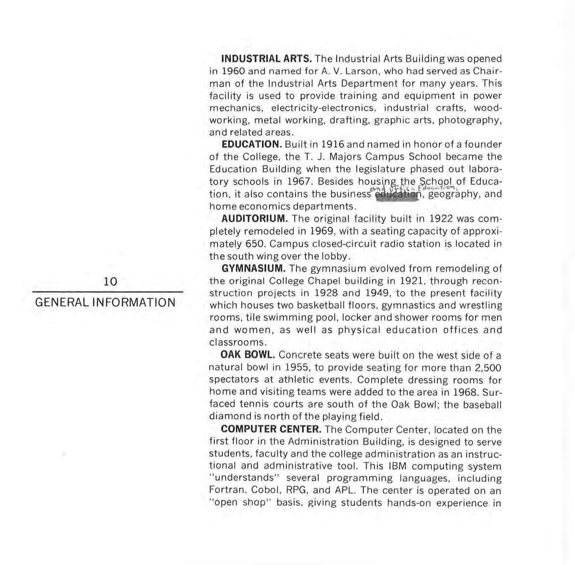 INDUSTRIAL ARTS. The Industrial Arts Building was opened in 1960 and named for A. V. Larson, who had served as Chairman of the Industrial Arts Department for many years. This facility is used to provide training and equipment in power mechanics, electricity-electronics, industrial crafts, woodworking, metal working, drafting, graphic arts, photography, and related areas.