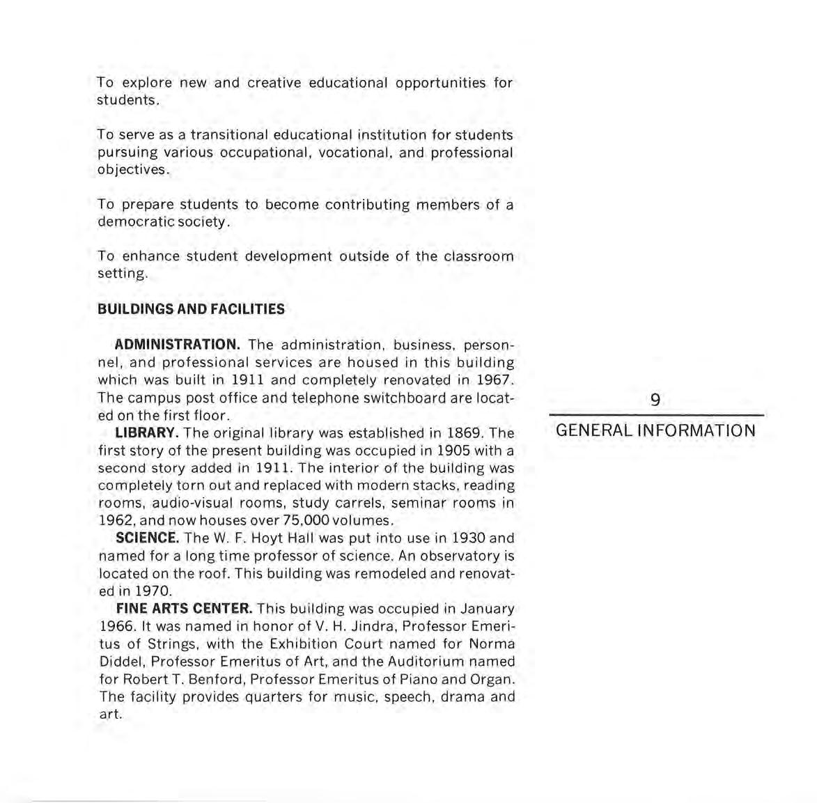 FINE ARTS CENTER. This building was occupied in January 1966. It was named in honor of V. H. Jindra, Professor Emeritus of Strings, with the Exhibition Court named for Norma Diddel, Professor Emeritus of Art, and the Auditorium named for Robert T. Benford, Professor Emeritus of Piano and Organ. The facility provides quarters for music, speech, drama and art.