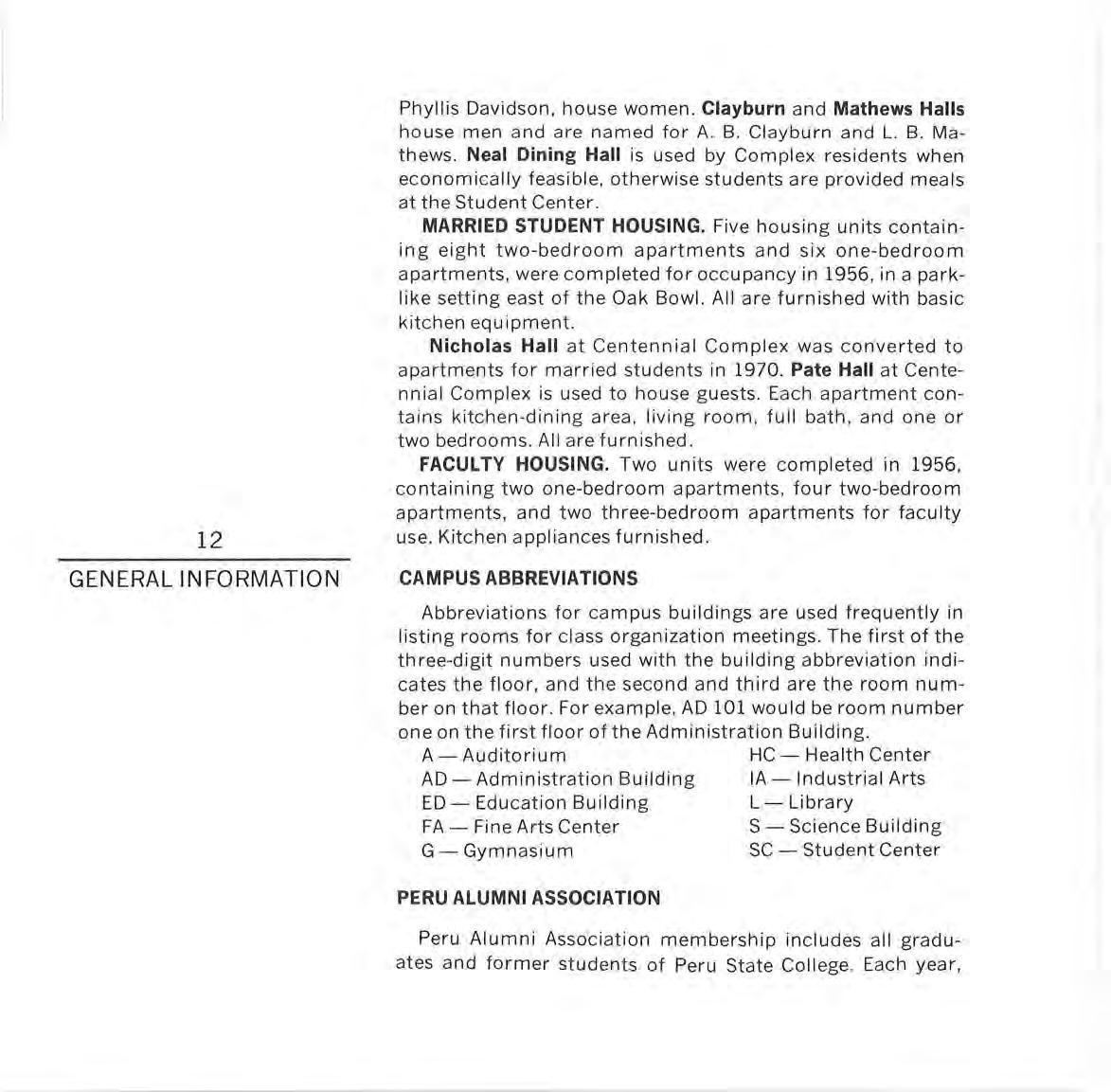 Nicholas Hall at Centennial Complex was converted to apartments for married students in 1970. Pate Hall at Centennial Complex is used to house guests. Each apartment contains kitchen-dining area, living room, full bath, and one or two bedrooms . All are furnished.