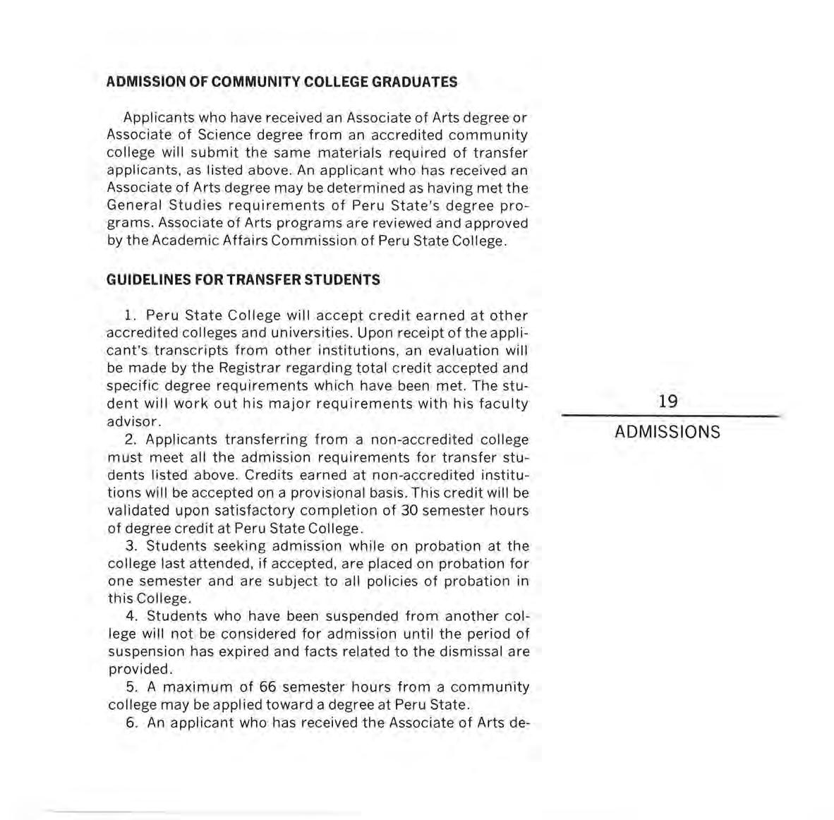 Peru State College offers an "open admission" policy which implies that admission is open to all graduates of an accredited high school. Although no specific distribution of entrance units is required, it is recommended that students enroll in college preparatory courses in high school.