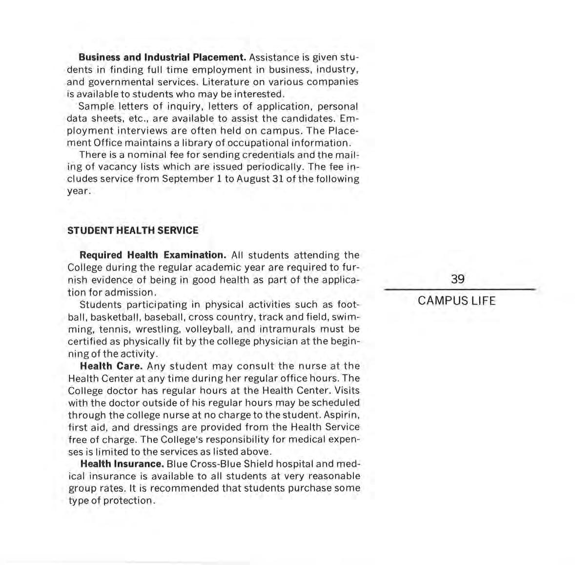 HEALTH CENTER. The Student He a lth Serv ice, which provides first a id treatment and hospitalization for students needing emergency medical care, operates in the Health Ce nter. A registered nurse is in residence at the Center and works under the direction of the College physician.