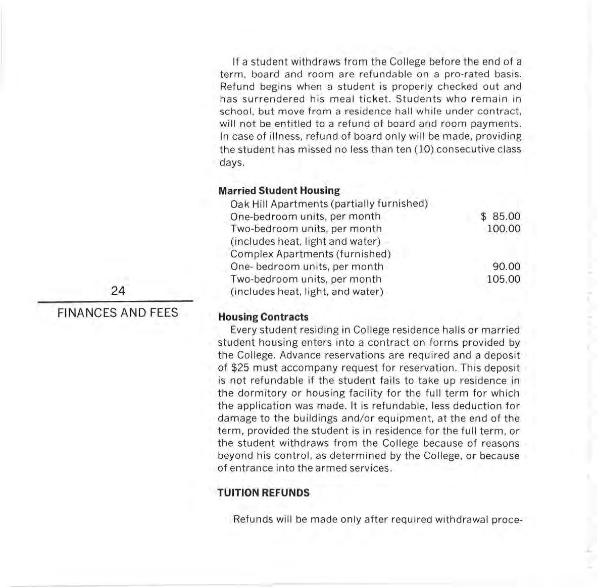 MARRIED STUDENT HOUSING. Five housing units containing eight two-bedroom apartments and six one-bedroom apartments, were completed for occupancy in 1956 , in a parklike setting east of the Oak Bowl. All are furnished with basic kitchen equipment.
