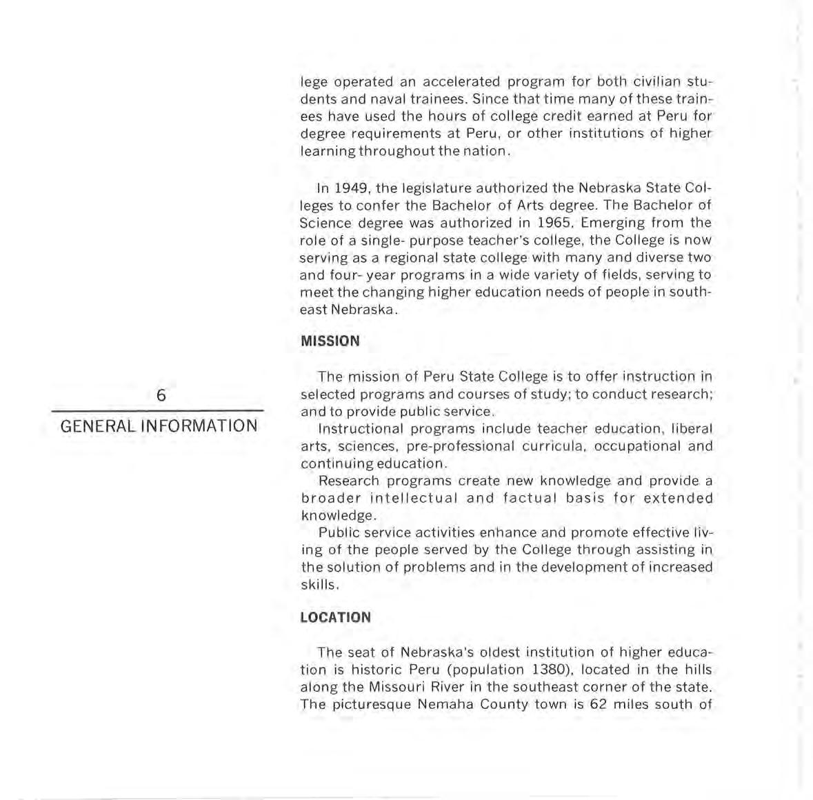 In 1949 , the l eg islature a uth orized the Nebraska State Co ll eges to confer the Bache l or of Arts degree. The Bache l or of Sc i ence degree was authorized in 1965. Emerg in g from the ro l e of a sing l e- purpose teacher ' s co ll ege, the Col l ege is now serving as a regional state college with many and diverse two and four- year programs in a wide variety of fields, serving to m eet the c h ang in g hi g h er ed u cat ion needs of peop l e in southeast Nebraska.