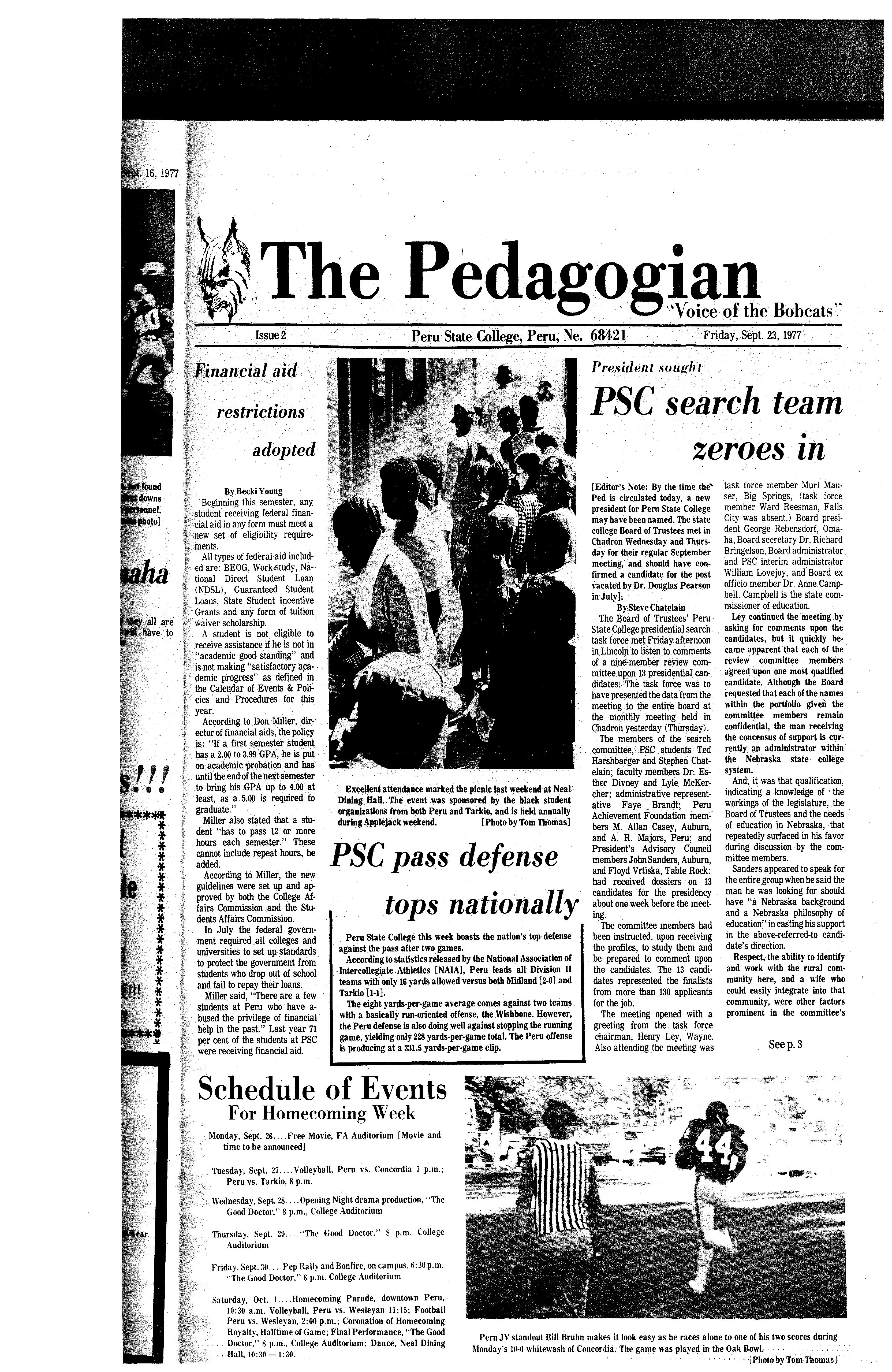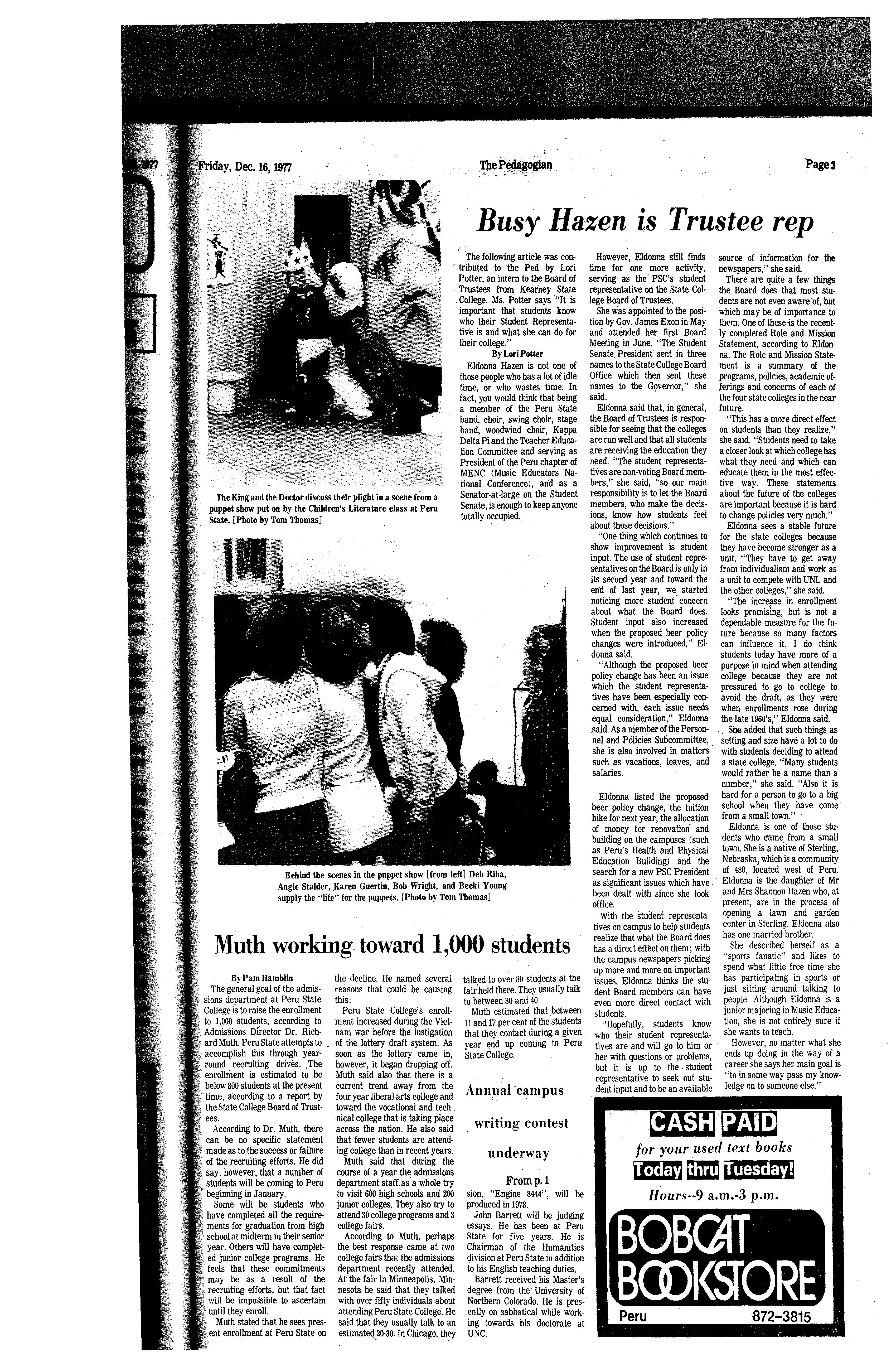 Assistant editor Lee Rademacher is also a JunIOr from Auburn. She was news editor last fall on the Ped, and is editor of the Peru State literary magazine, the Sifting Sands: Diane Uher, a '76 graduate of Western (Nebr.) High School, will serve as news editor. Miss Uher was an important of the Ped· staff throughout the. entire last year.