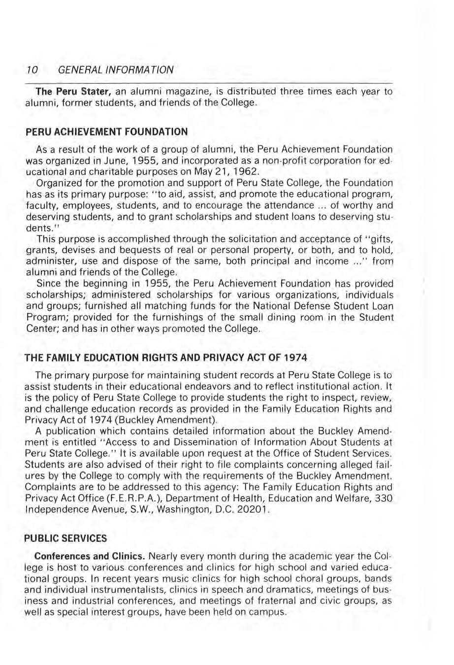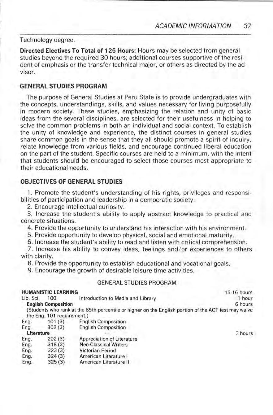The purpos e of General Studies at Peru State is to provide undergraduate s with the concepts, understandings, skills, and values necessary for living purposefully in modern society. These studies, emphasizing the relation and unity of basic ideas from the several disciplines, are selected for their usefulness in helping to solve the common problems in both an individual and social context. To establish the unity of knowledge and experience, the distinct courses in general studies share common goals in the sense that they all should promote a spirit of inquiry, rel ate knowledge from various fields, and encourage continued liberal education on the part of the student. Specific courses are held to a minimum, with the intent that students should be encouraged to select those courses most appropriate to their educa tional needs.