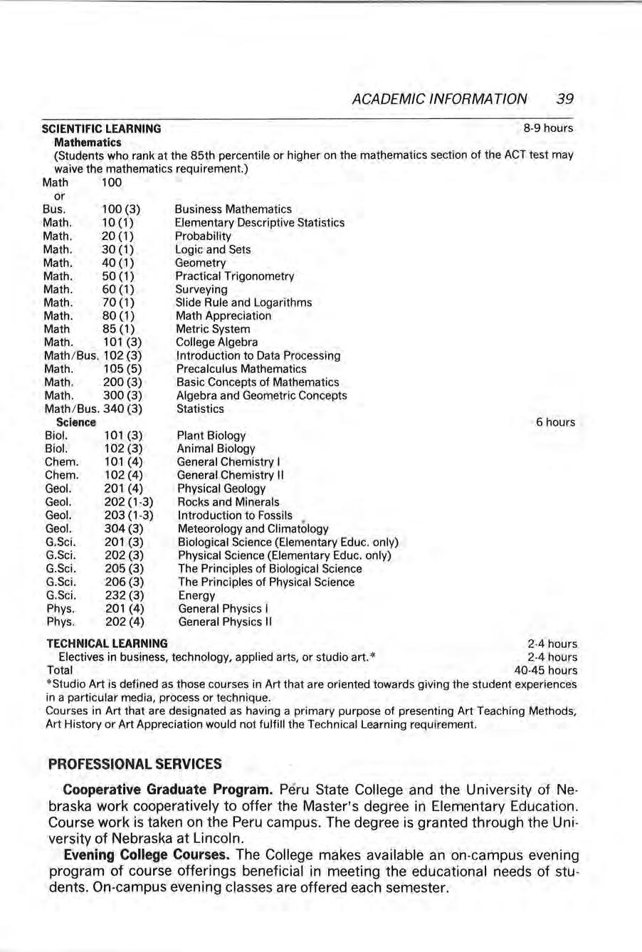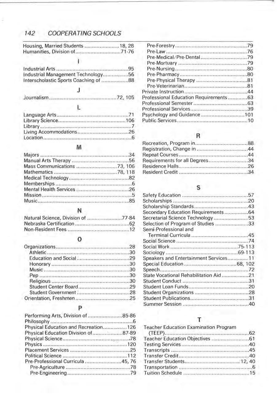 142 COOPERATING SCHOOLS Housing, Married Students 18, 28 Pre-Forestry 79 Humanities , Division of.. 71-76 Pre•Law 76 Pre •Medical / Pre•Dental 79 Pre-Mortuary ...... ............... . .. ..... ... ...... .. .... .. 79 Industrial Arts 95 Pre -Nursing .. .. . .. ............... ........... .... ........... 80 Industrial Management Techno logy 56 Pre Pharmacy 80 Interscho lastic Sports Coaching of 88 Pre-Physical Therapy 81 J Pre Veterinarian 81 Private Instruction 44 Journalism ...... .... ... .. .... .. .......... .... .. .. ...... 72, 105 Professional Education Requirements 63 L Professiona l Semester 63 Professional Services 39 Language Arts 71 Psychology and Guidance 101 Library Science ....... ........ ... .. .... .... ...... . ...... .... 106 Public Service s 10 Library ..... .. ...... .. .... .......................................... 7 Living Accommodation s 26 Location 6 R M Recreation, Program in 88 Registration, Change in .44 Majors 34 Repeat Courses .44 Manual Arts Therapy 56 Requirement s for all Degre es 34 Mas s Commun ic ations ...... ..... .. ......... ..... 73, 106 Residence Halls 26 Mathematics 78, 118 Resident Credit .... ... .... ......................... ... ....... 34 Medica l Technology 82 Memberships 6 Mental Health Services 26 s Mission 5 Safety Education 5 7 Music 85 Scho larships 20 N Scho larship Standards .... .. ....................... ....... 43 Secondary Education Requirements 64 Natural Science, Division of 77 ·84 Secretaria l Sc ience Technology 53 Nebraska Certification 6f Se lect ion of Program of Studies 33 Non ·Resident Fees 12 Semi•Professional and 0 Terminal Curricu la 45 Socia l Sc ience 74 Organizations ............. ........ ... ......... ................ 28 Social Work ........ .. ....... .......... ... ... ....... ... .. 75• 113 Athletic 30 Sociology 69· l 13 Education and Soc ial 29 Speakers and Entertainment Services 11 Honorary ...... ......... ... ...... .. .... .. ........ . ..... ...... 30 Special Education 68, 102 Music ...... ... ..... ...................... ...... ....... ........ 30 Speech 72 Pep 30 State Vocational Rehabilitation Aid , 21 Religious 30 Student Conduct 31 Student Center Board ........ . .. .......... . .. .......... 29 Student Loan Funds 20 Student Government ....... ............... ............. 28 Student Organi zat ions 28 Orientat ion, Freshmen 25 Student Publications 31 p Summer Ses sion .40 Performing Arts, Division of 85·86 Philosophy 6 T Physical Education and Recreation 126 Teacher Education Examination Program Physical Education Division of '. : 87-89 (TEEP) 62 Phys ic al Science , ,78 Teacher Education Objectives 61 Physics : 120 Testing Services ......................... ................... .40 Placem ent Services 25 Transcripts .45 Political Science 112 Transfer Credit 40 Pre -Professional Curricu la .45, 76 Transfer Students 12, 40 Pre•Agricu lture : 78 Transportation 6 Pre•Engineering 79 Tuition Schedu le 15