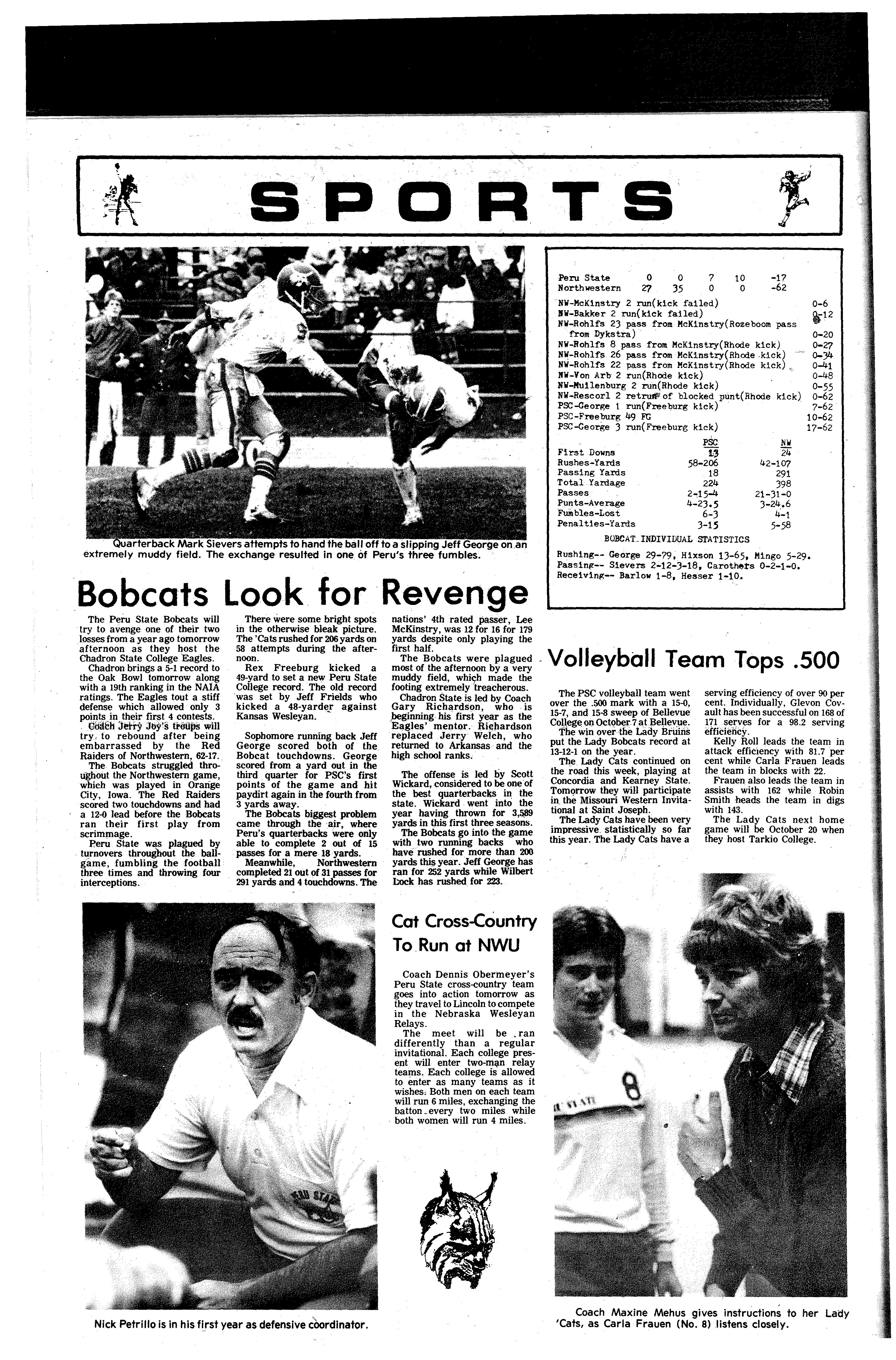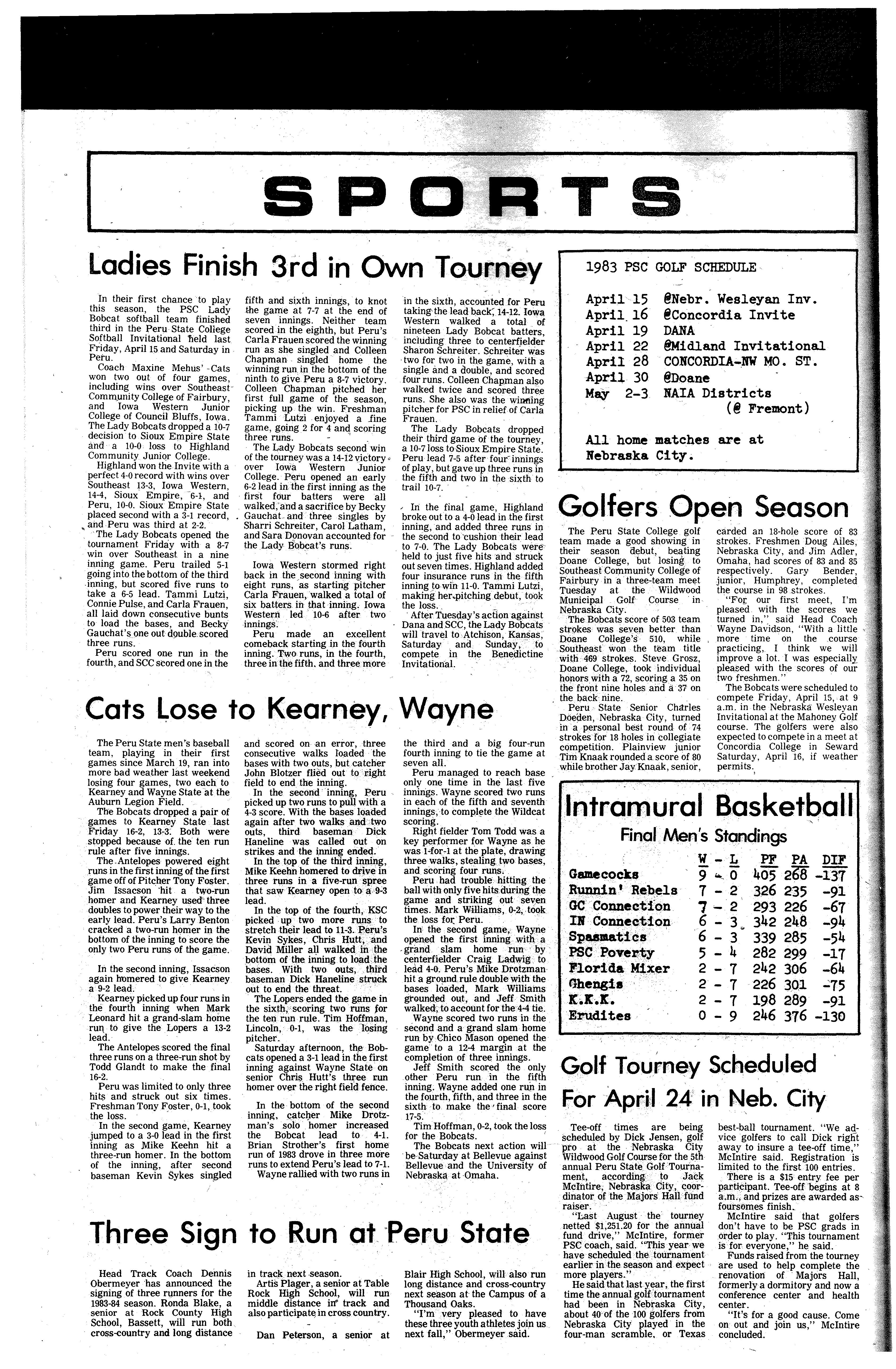 B'ri.an Strother· enjoyed a fine day at the plate as the rightfielder went three-for-five and scored three runs. Freshman John Blotzer, Plattsmouth, turned in a fine game as the designated hitter, three;::forthree at the plate, scoring fwo runs, and driving in five runs. The Bobcats pounded Viking pitchers for 18 runs on 12 hits, hit