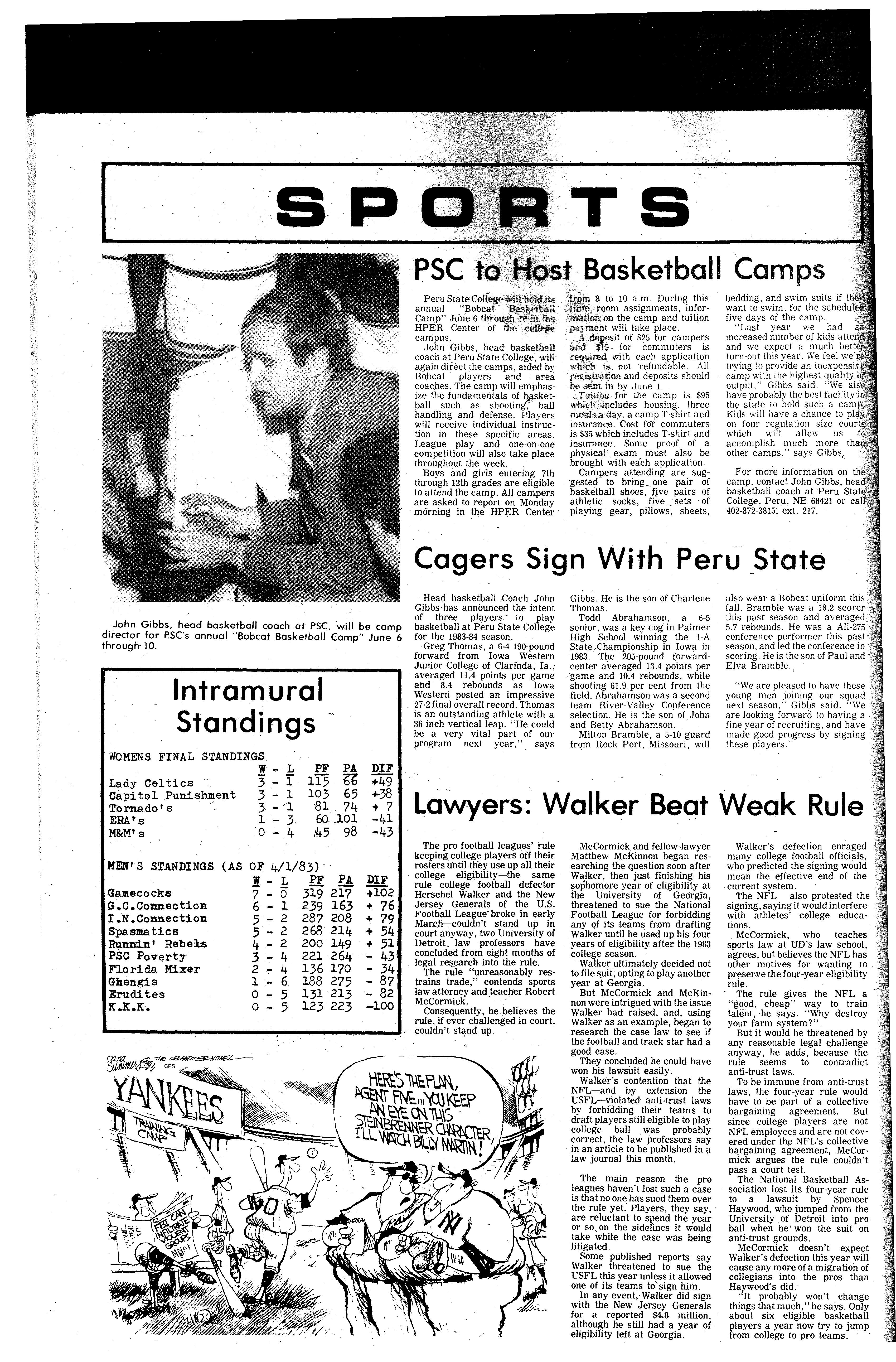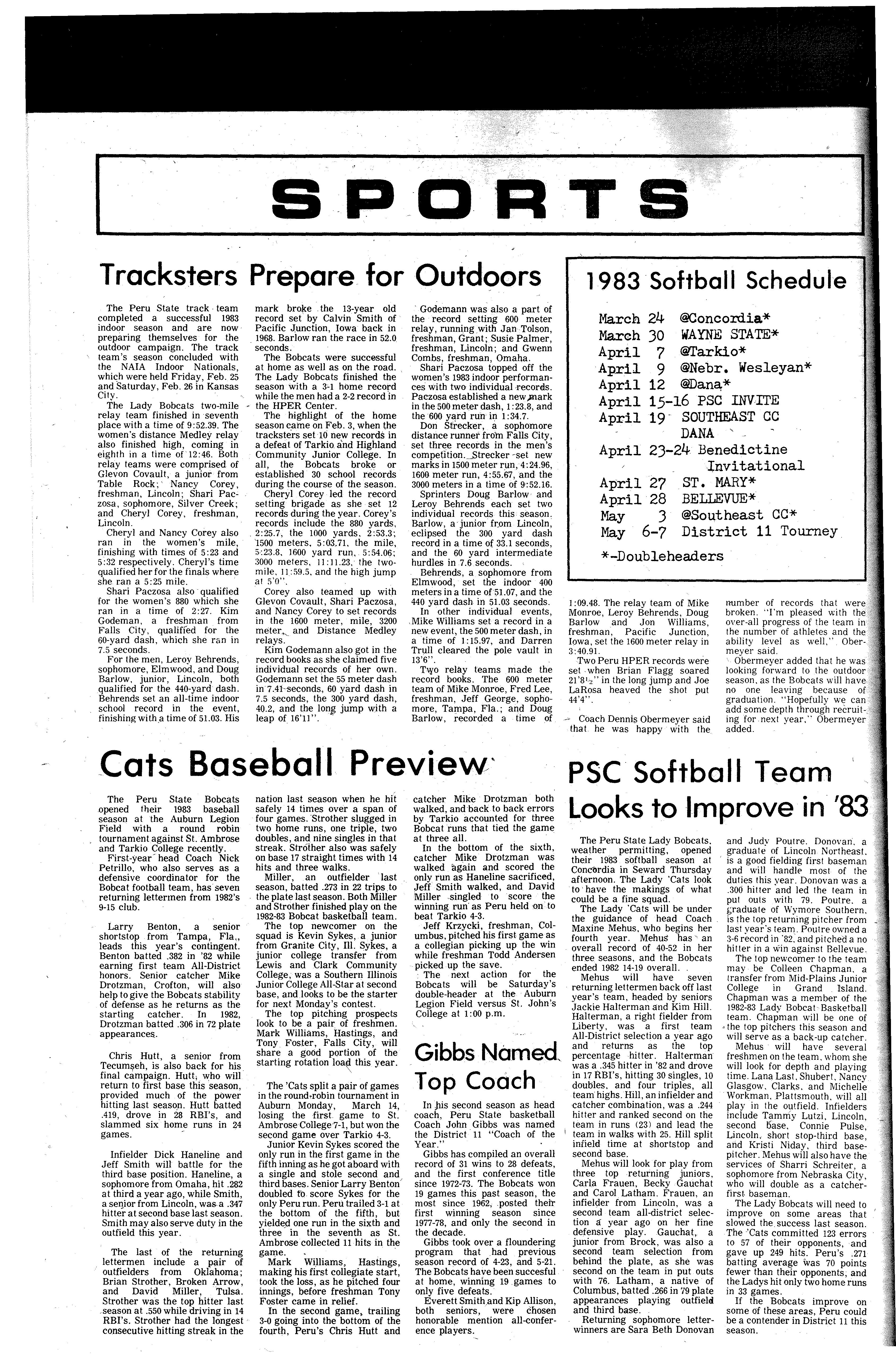 Sue Schroeder, a senior at Lewiston High School, will play both vollevball and basketball at PSC. Schroeder was a first team all-Homesteader conference selection in both volleyball and baksetball this past season. The 6-0 Schroeder was an All-State honorable mention pick in basketball ,for the Class D Tigers. Schroeder plans to major in physical education and is the daughter of Ron and Betty Schroeder, Liberty. · Joan Bartling, Syracuse High School, will play volleybal1 and softball for Coach Maxine Mebus. The 5-8 Bartling was a -spiker this past season in volleyball as she earned all-state honorable mention honors, alltourney team at the Peru State Invitational, and all-area first· team by the Maverick Media. Bartling will play first base and