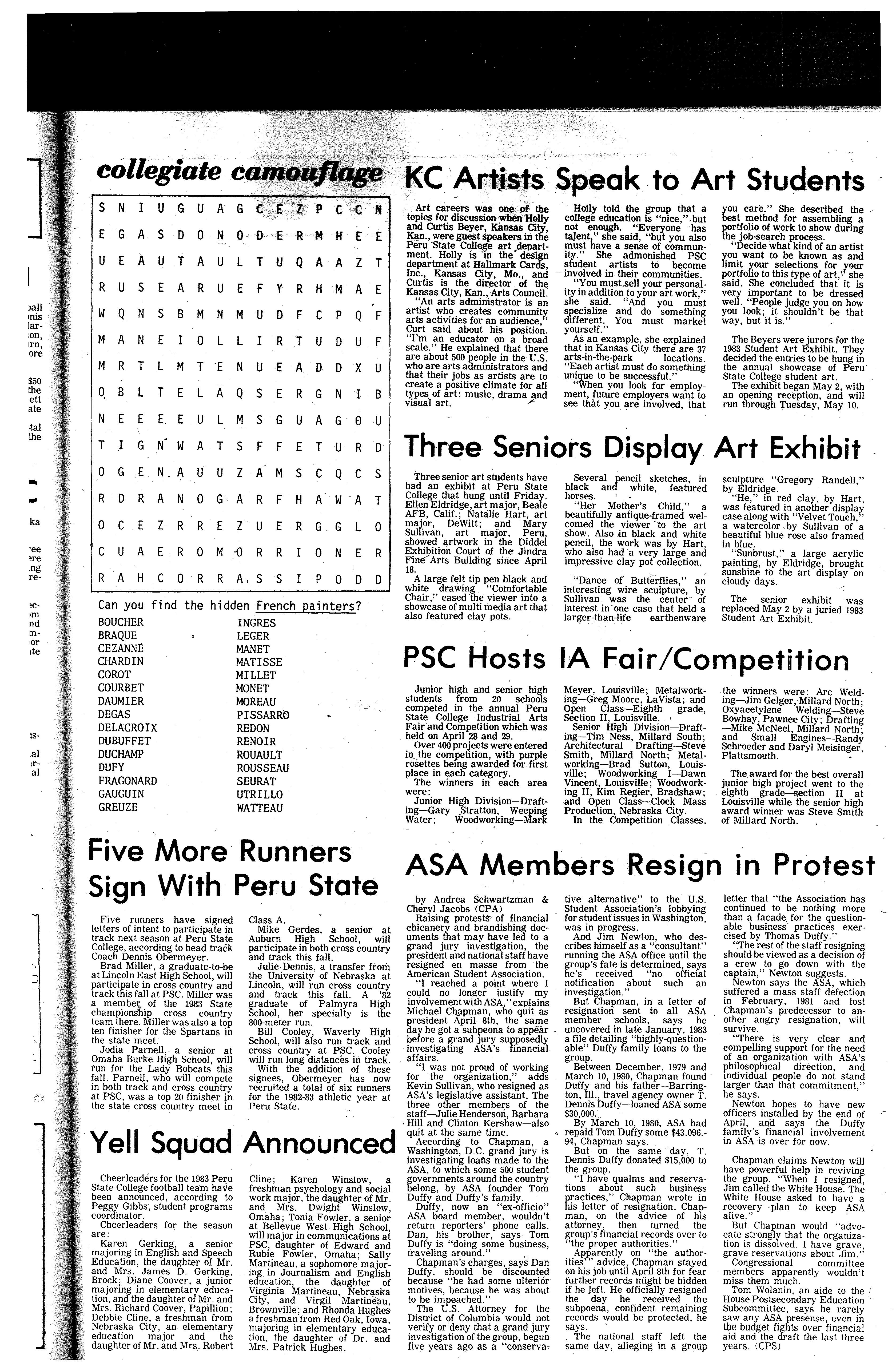 Student Senate officers and members for the 1982-83 school year are: President, Curtis Cogswell, Friend; Vice-President, David Miller, Tulsa, Okla.; Senators.,at-large, Linda Shepard, Lincoln; Rhonda Huqt, Crab Orchard; Chris Hosfelt, Massena, la.; Marsha Kentopp, Falls City; Sara Donovan, Lincoln; Rick Rummel, Omaha; Theresa Polsley, Omaha; Bob Chappel, Fairbury.