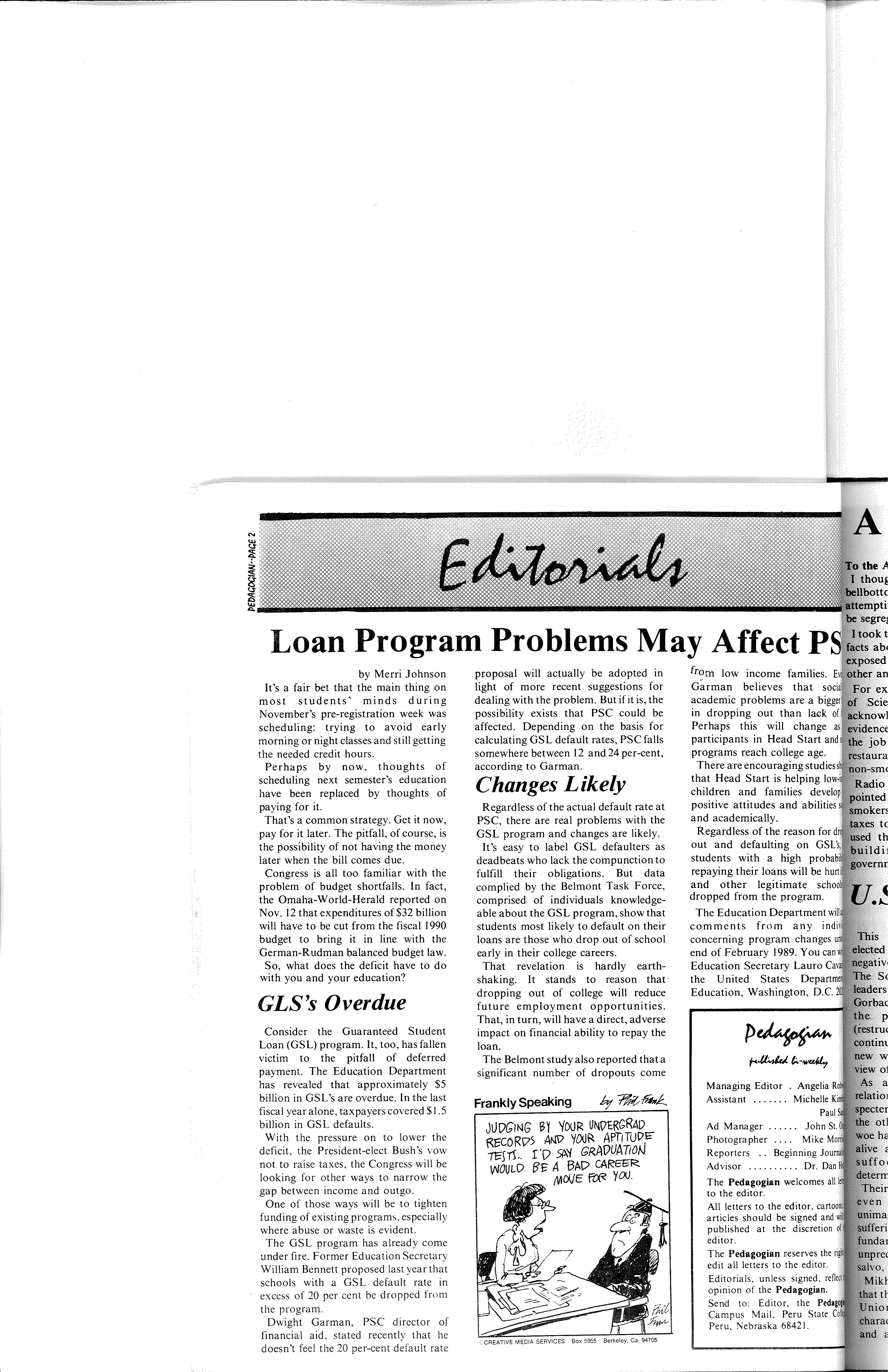 The Pedagogian reserves the righ(aS then J edit all letters to the editor. toard and Editorials, unless signed, year opinion of the Pedagogian. f3esides pr Send to: Editor, the_ other g Campus Mail, Peru State Colic . Peru. '.\lehraska 68421. Ope. IS tc lassies and