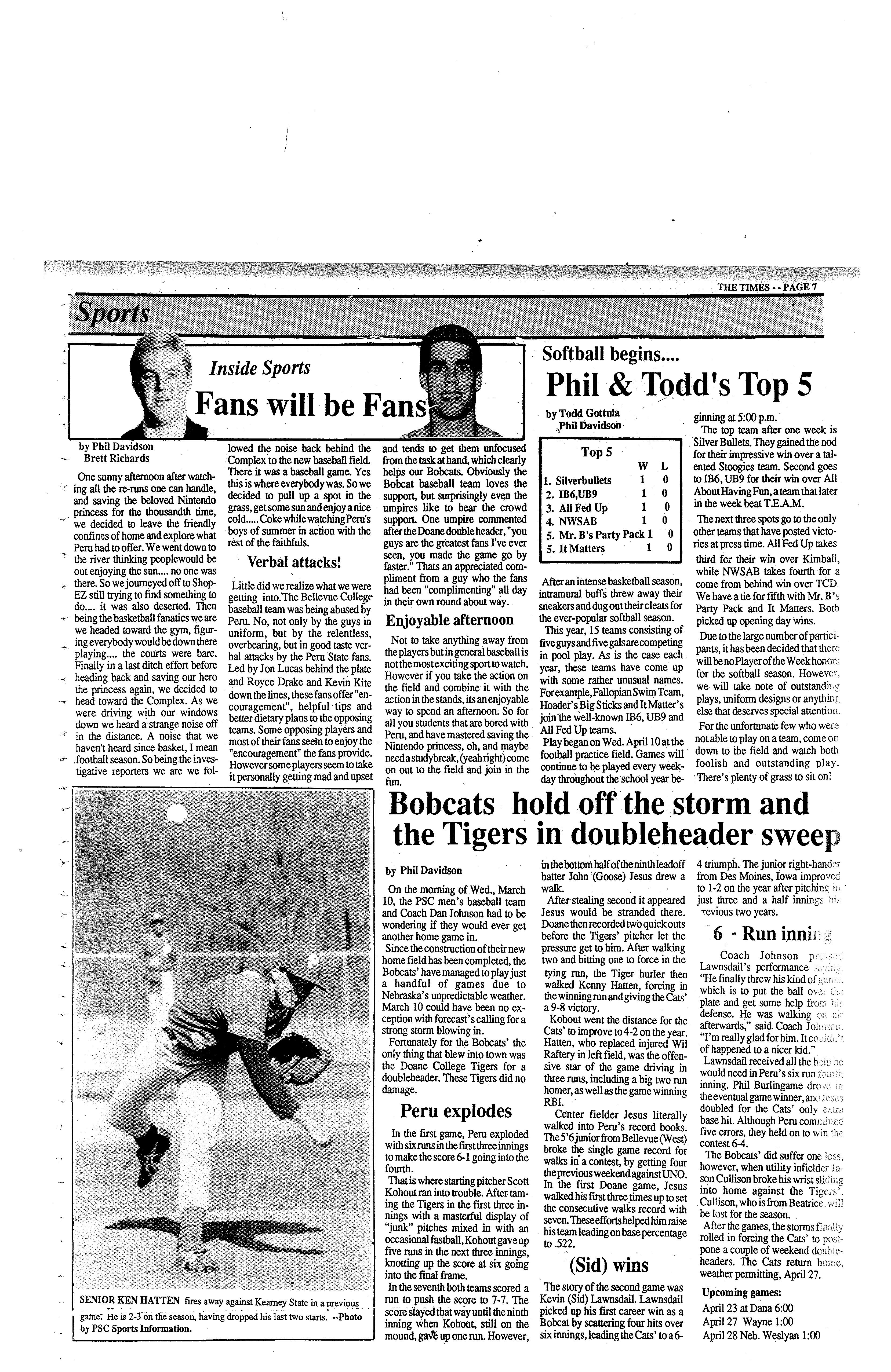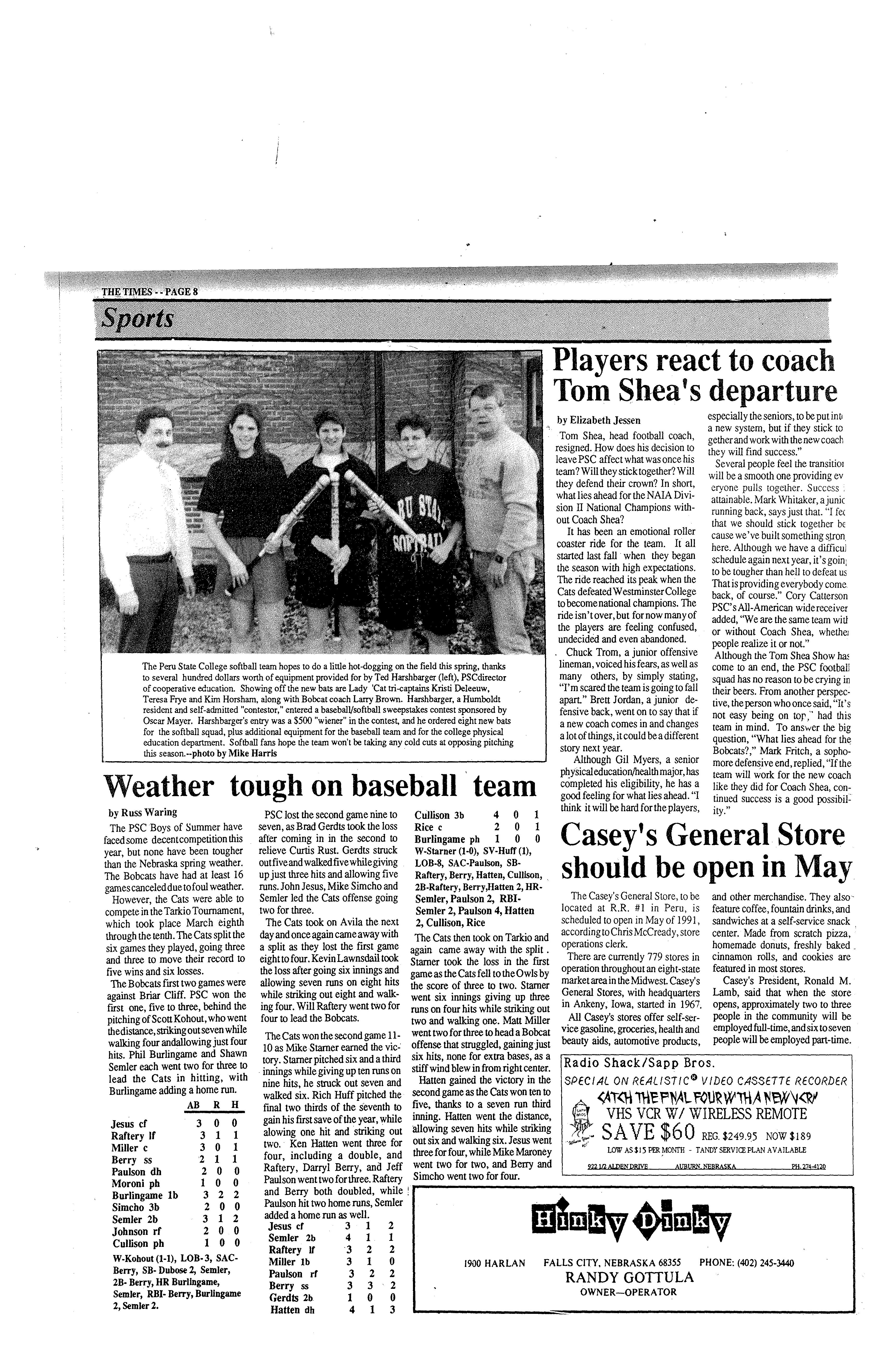 The day also saw Jerry Joy come The day was May fourth, and the , back to throw out the first pitch, Bobcat Baseball Team was to take which he did in the AWAC. He also the field, then the rain came (imag- said a few words about Peru's acine that). The Cats were looking forward toplayinginalittledifferent and stated that he still considers this atmosphere as they were going to to be home. take on the PSC Alumni Baseball Later m the evening a hog roast Team. was held at the VFW in order to The Game was rained out, but the raise money for the renovation of day was not completely ruined as the weight room, as well as the the 14 or so alumni who showed up baseball team. After that the alums to play baseball found themselves settled down to do a little remiplaying basketball in the AWAC, Discing and <2!"hing up. The soand rather well I might add. cializing seemed to mean more to