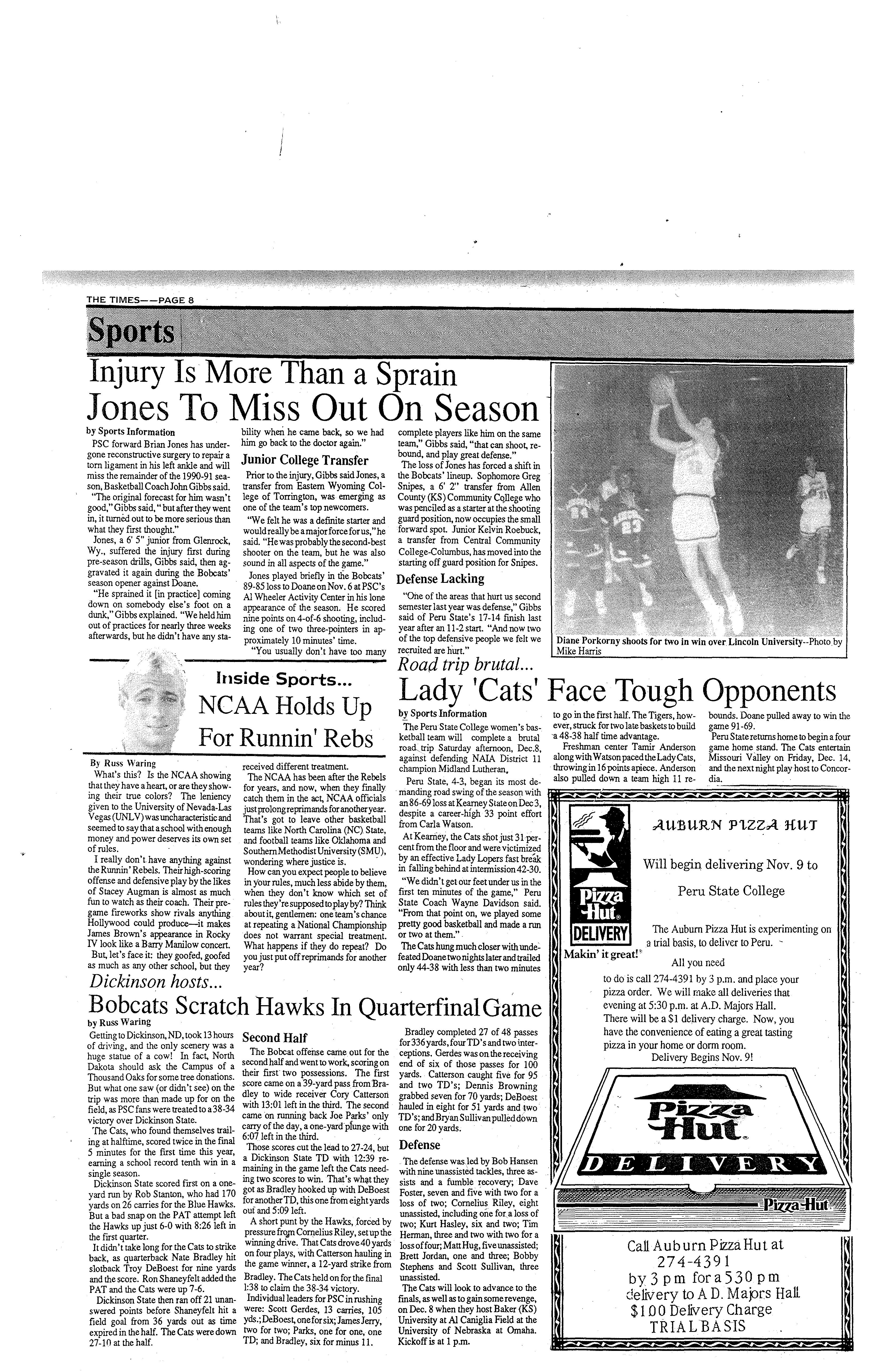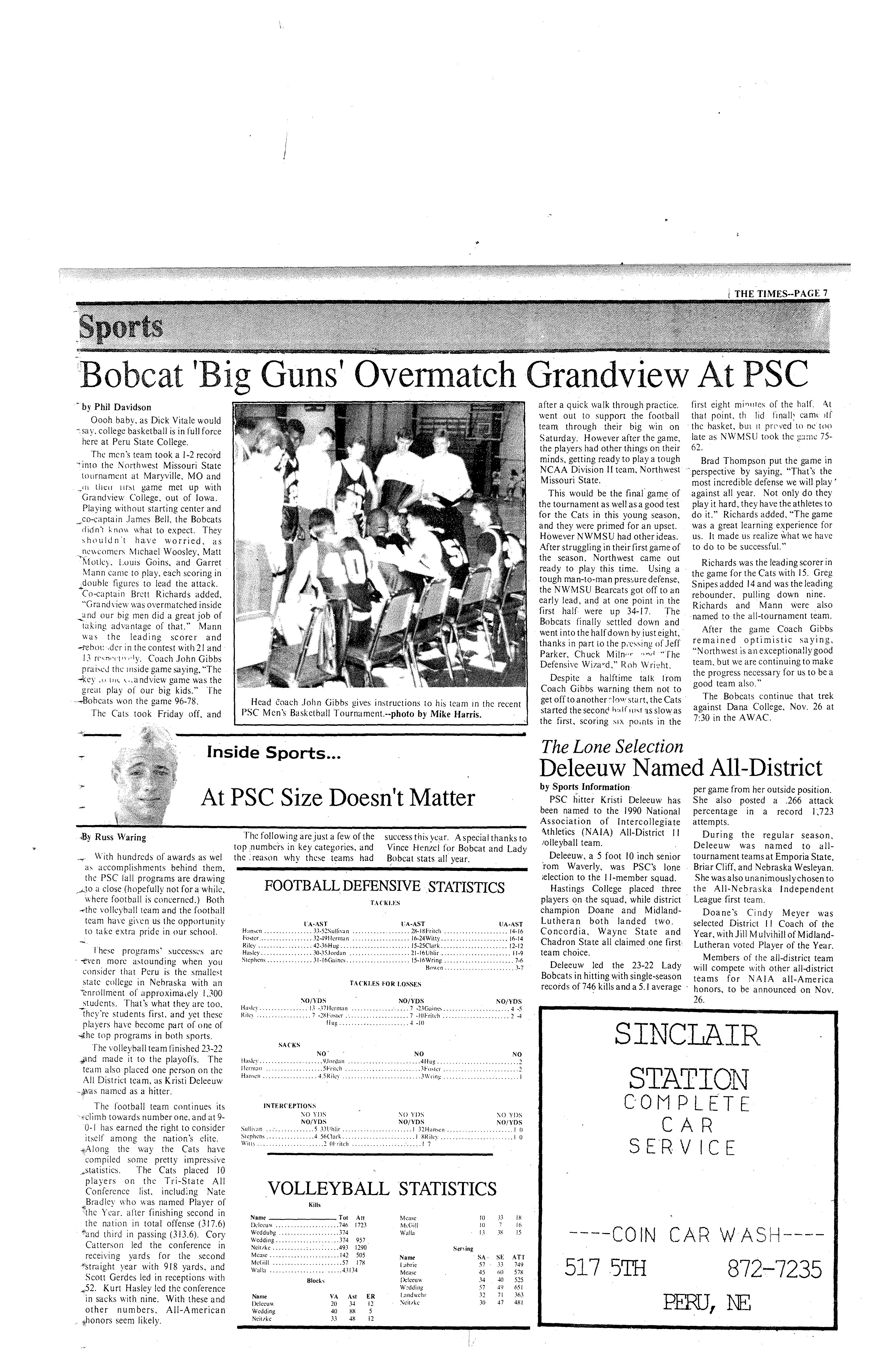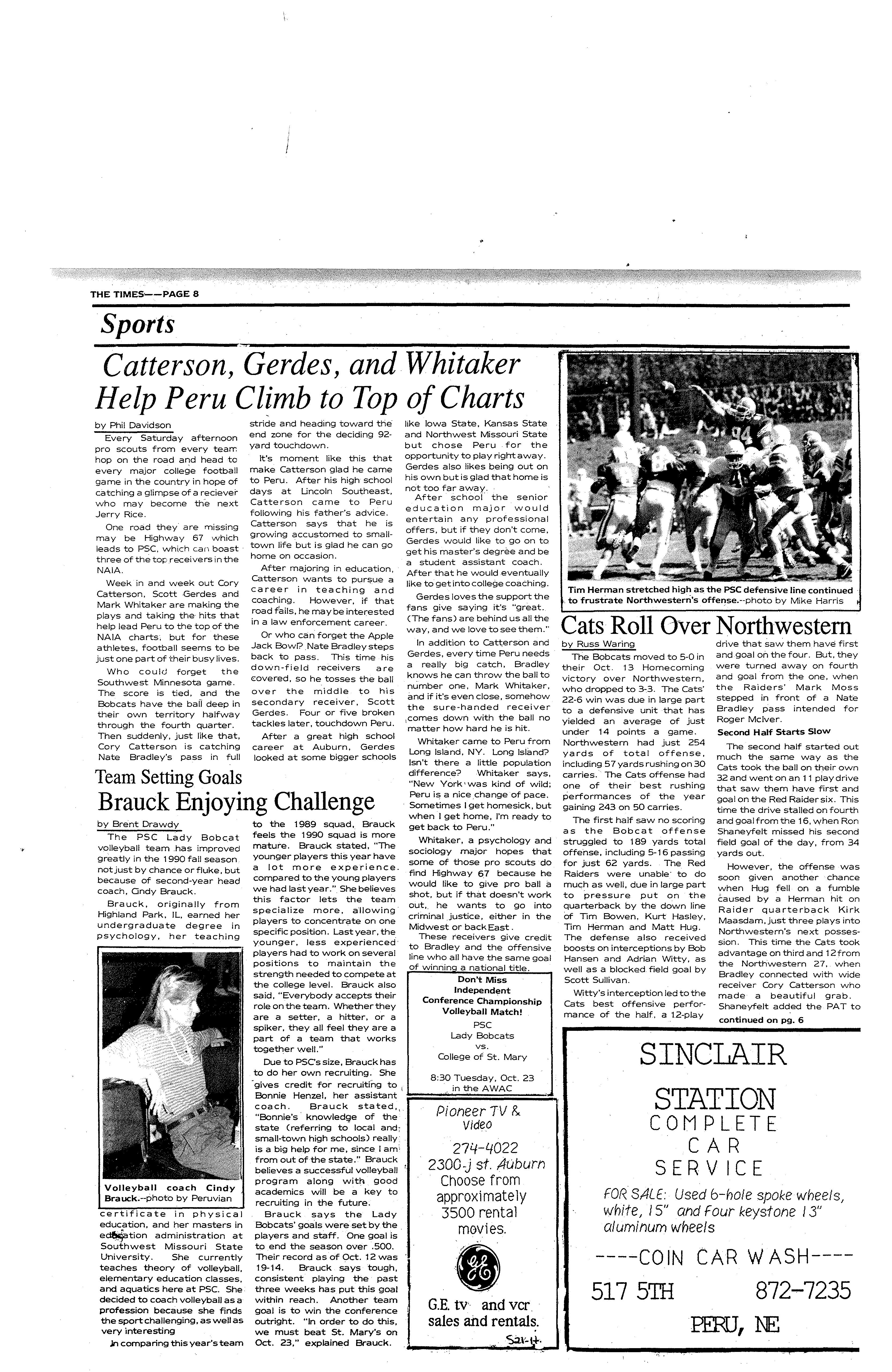 Under Coach Shea the Cats ran the run-and-shootoffense, which relies heavily on throwing the ball. Although the pass was a major factor toward the championship, Peru proved it could run the ball. Against Baker in the national semi-final game, the Bobcats were forced to run as Baker came out with as many as eight men defending the pass. We all know that strategy didn't work, as the Cats established the run and ran over Baker.