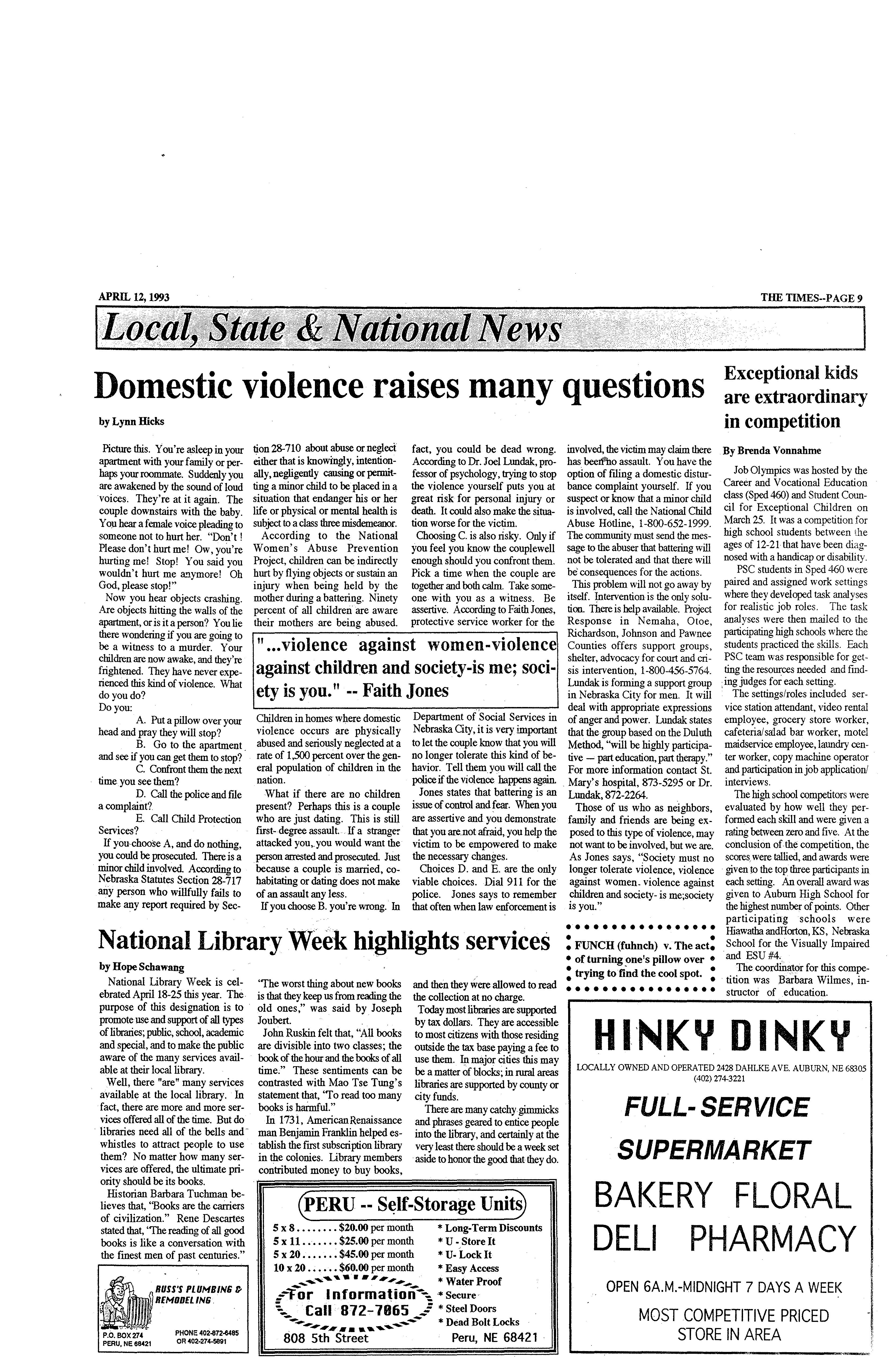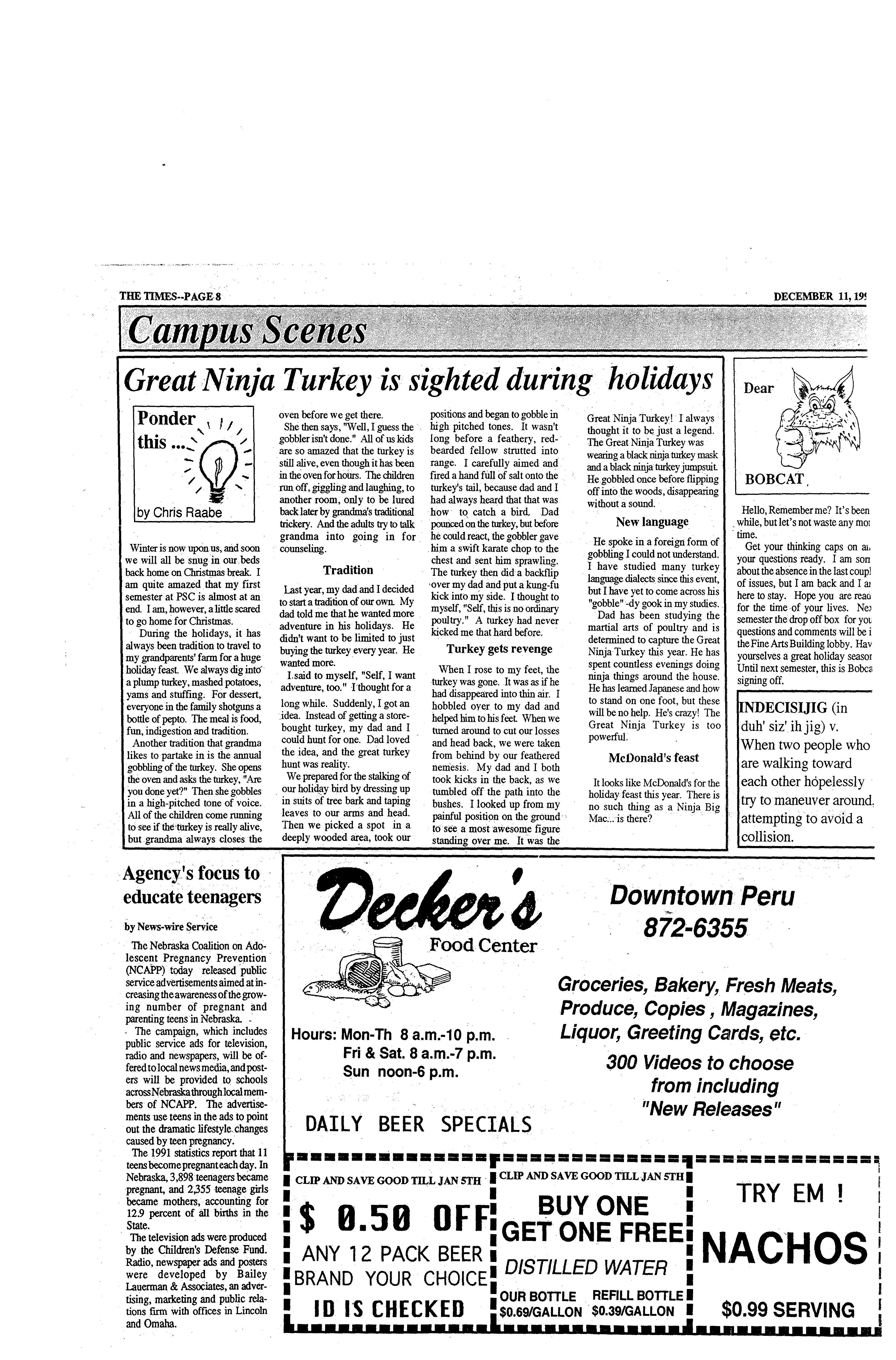 Doane College, Hastings College, Midland College, Peru State, and Wayne State College. The Times Editor-in-Chief, Todd Gottula, received two awards for best hard news story and besteditorial. Gottulaalsoreceived awards for best feature photo, best photo spread, and best sports photo. The best general cartoon award went to Scott Holmes and Ray Topscher foctheircartoon "Bobcatman." Barbara J. Balm, assistant editor, ·won awards in the editorial, feature, and hard news categories.· Other PSC students who were recognized were Alan Ferguson, Tim Bailey, and Greg Fiddelke.