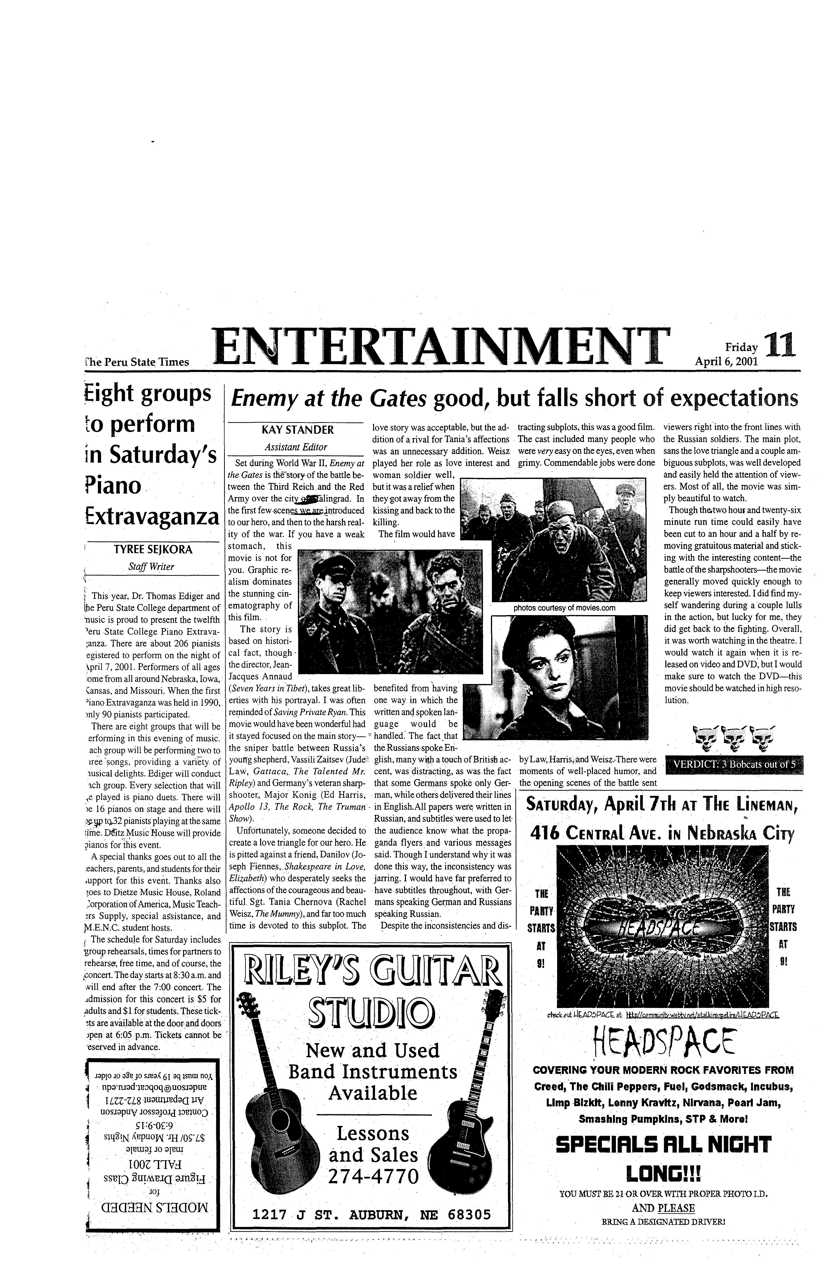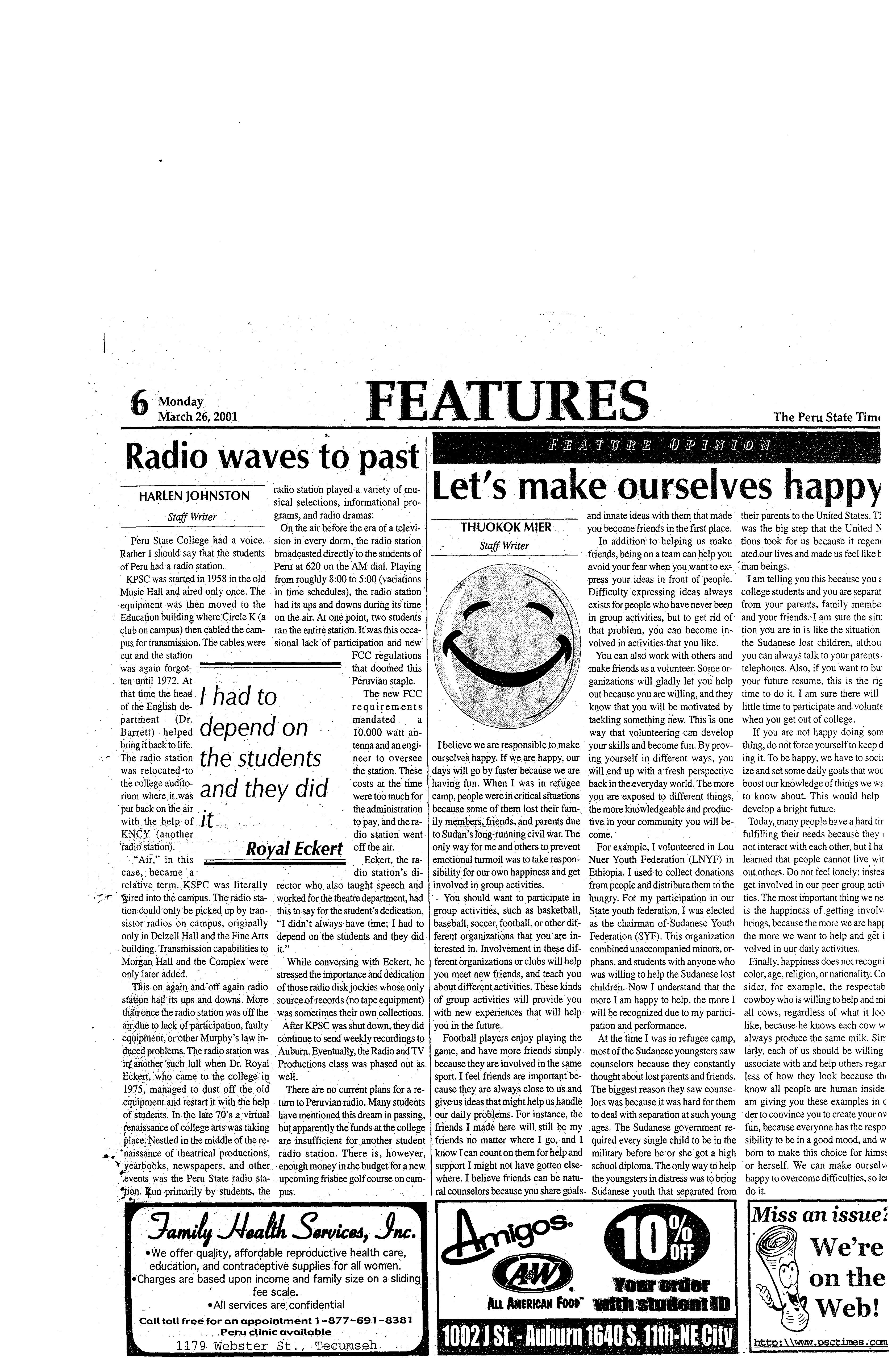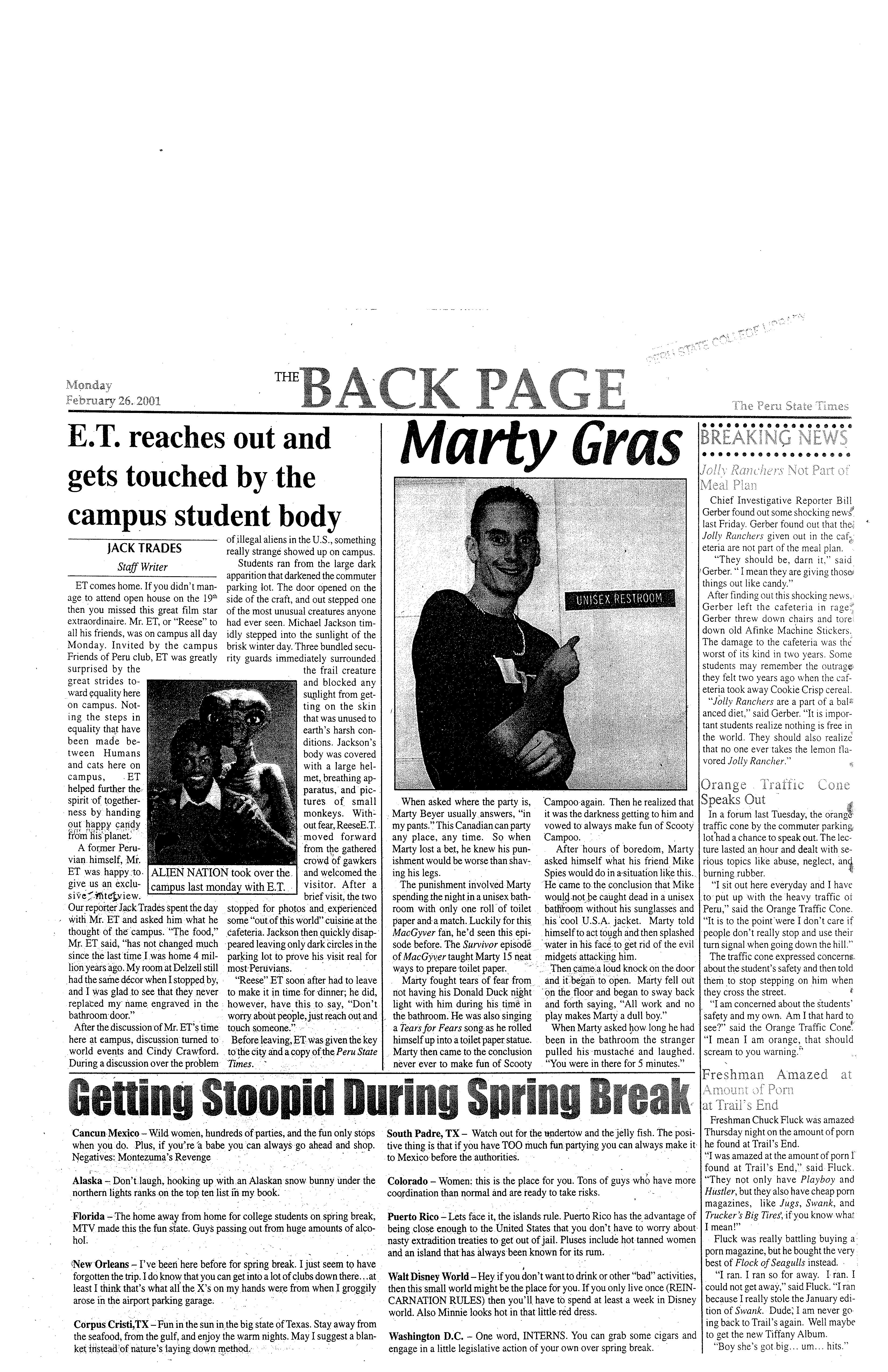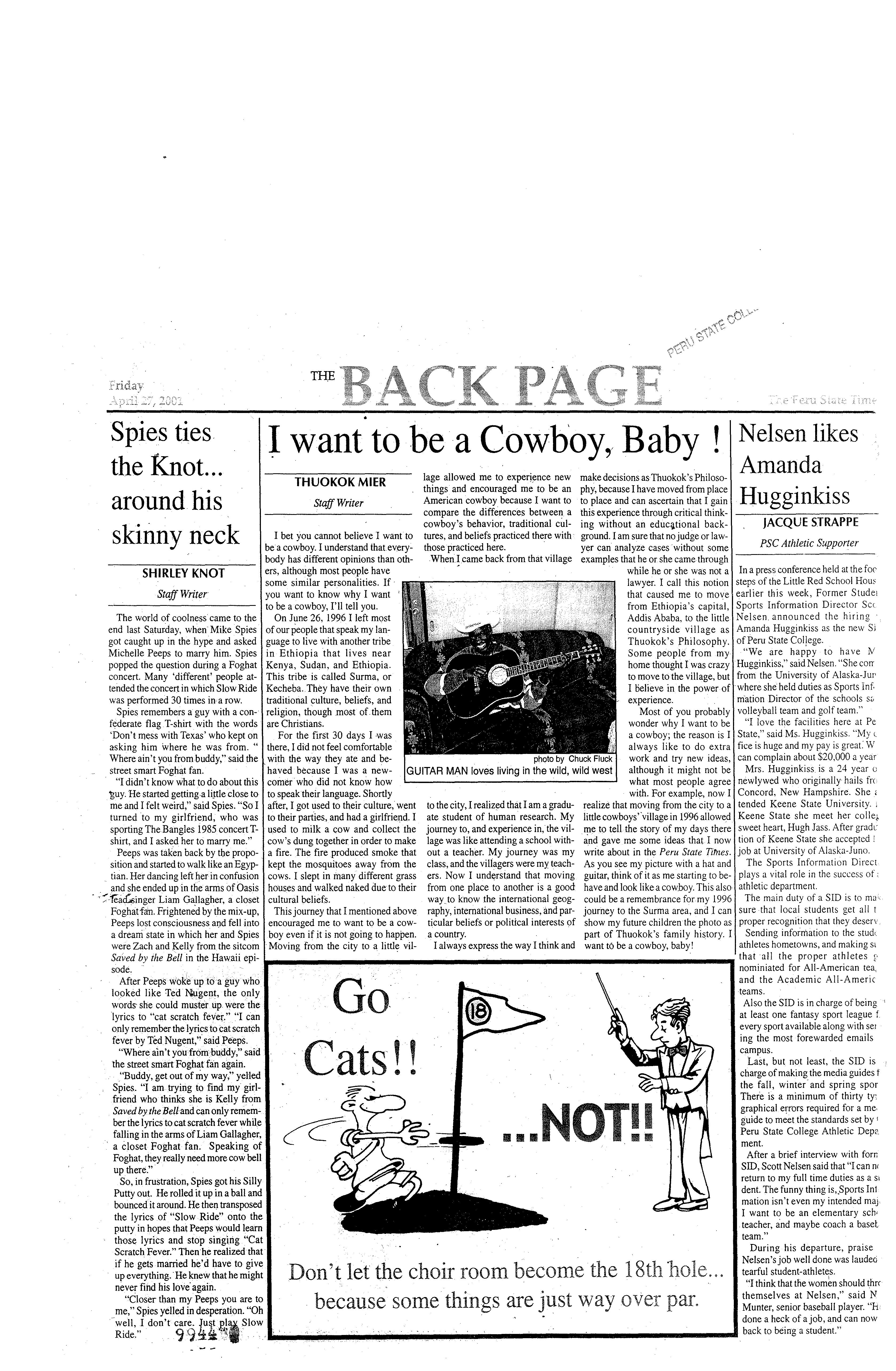 Some people from my "We are happy to have lV popped the question during a Foghat Kenya, Sud<).n, and Ethiopia. home thought I was crazy Hugginkiss," said Nelsen. "She corr concert. Many 'different' people at- This tribe is called Surma, or to move to the village, but from the University of Alaska-Jup tended the concert in which Slow Ride Kecheba They have their own I oelieve in the power of ·where she held duties as Sports Inf. was performed 30 times in a row. traditional culture, beliefs, and , experience. mation Director of the schools Spies remembers a guy with a con- religion, though most of them Most of you probably volleyball team and golf team." federate flag T-shirt with the words 11re Christians. wonder why I want to be "I love the facilities here at Pe 'Don't mess with Texas' who kept on For the first 30 days I was a cowboy; the reason is I State," said Ms. Hugginkiss. "My c asking him where he was from. " there, I did not feel comfortable always like to do extra fice is huge and my pay is great: W Where ain't you from buddy," said the with the way they ate and be- photo by Chuck Fluck work and try new ideas, can complain about $20,000 a year street smart Foghat fan. haved because I was a new- GUITAR MAN loves living in the wild, wild west although it might not be Mrs. Hugginkiss is a 24 year o "I didn't know what to do about this comer who did not know how what most people agree newlywed who originally hails fn 'guy. He started getting.a liJlle close to to speak their language. Shortly with. For example, now I Concord, New Hampshire. She < me and I felt weird," said Spies. "So I after, I got used to their culture, went to the city, I realized that I am a gradu- realize that moving from the city to a tended Keene State University. ; turned to my girlfriend, who was to their parties, and had a girlfriend. I ate student of human research. My littlecowboys''villagein 1996allowed Keene State she meet her co sporting The Bangles 1985 concert T- used to milk a cow and collect the journey to, and experience in, the vii- me to tell the story of my days there sweet heart, Hugh Jass. After gradt: shirt, and I asked her to marry me." cow's dung together in order to make !age was like attending a school with- and gave me some ideas that I now tion of Keene State she accepted ! Peeps was taken back by tbe propo- a fire. The fire produced smoke that out a teacher. My journey was my write about in the Peru State Ti'11es. job at University of Alaska-Juno. sition and started to walk like anEgyp- kept the mosquitoes away from the class, and the villagers were my teach- As you see my picture with a hat and The Sports Information Direct tian. Her dancing left her in confusion cows. I slept in many different grass ers. Now I understand that moving guitar, think of it as me starting to be- plays a vital role in the success of: and she ended up in the arms of Oasis houses and walked naked due to their from one place to another is a good have and look like a cowboy. This also athletic department.
