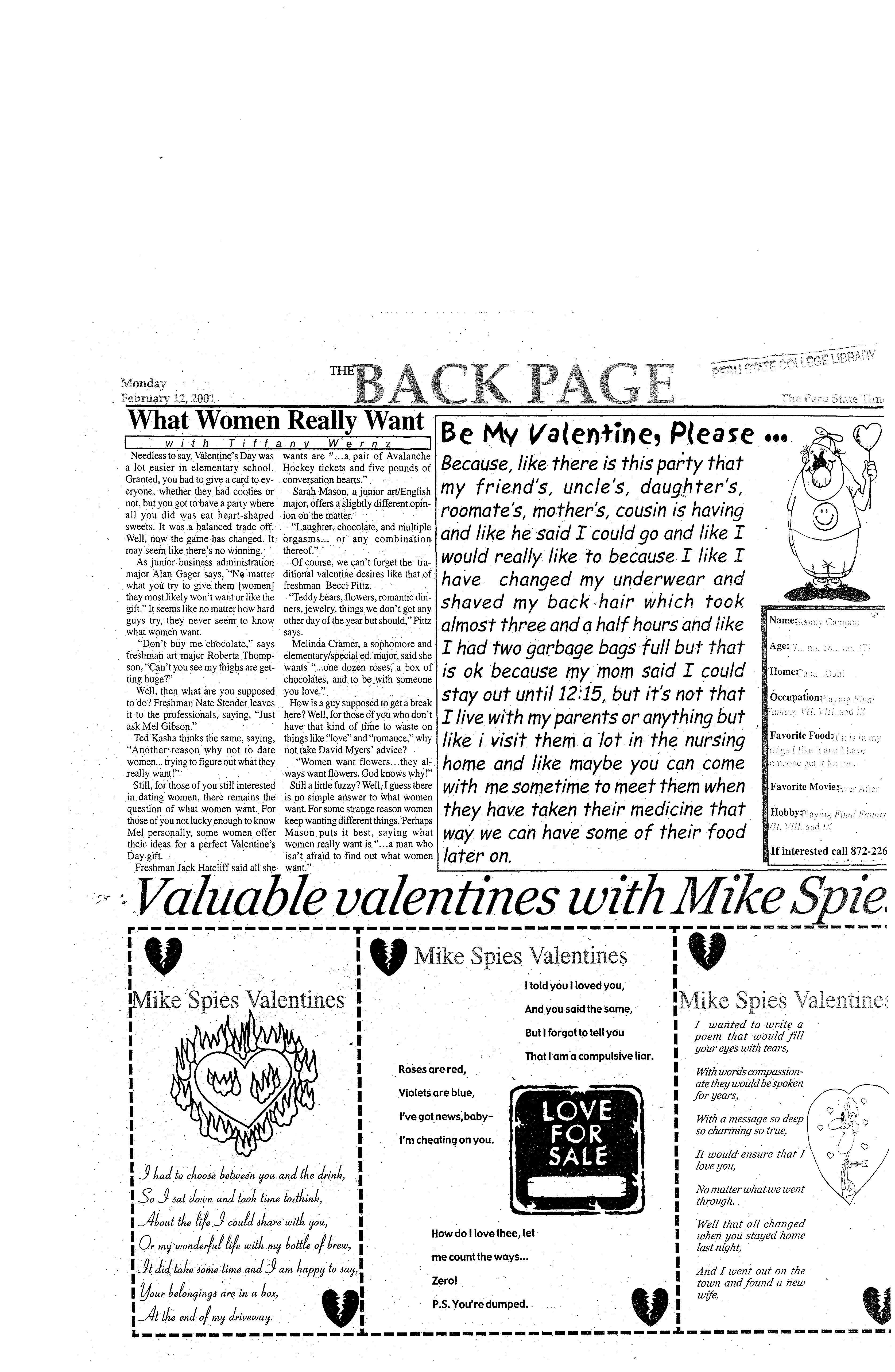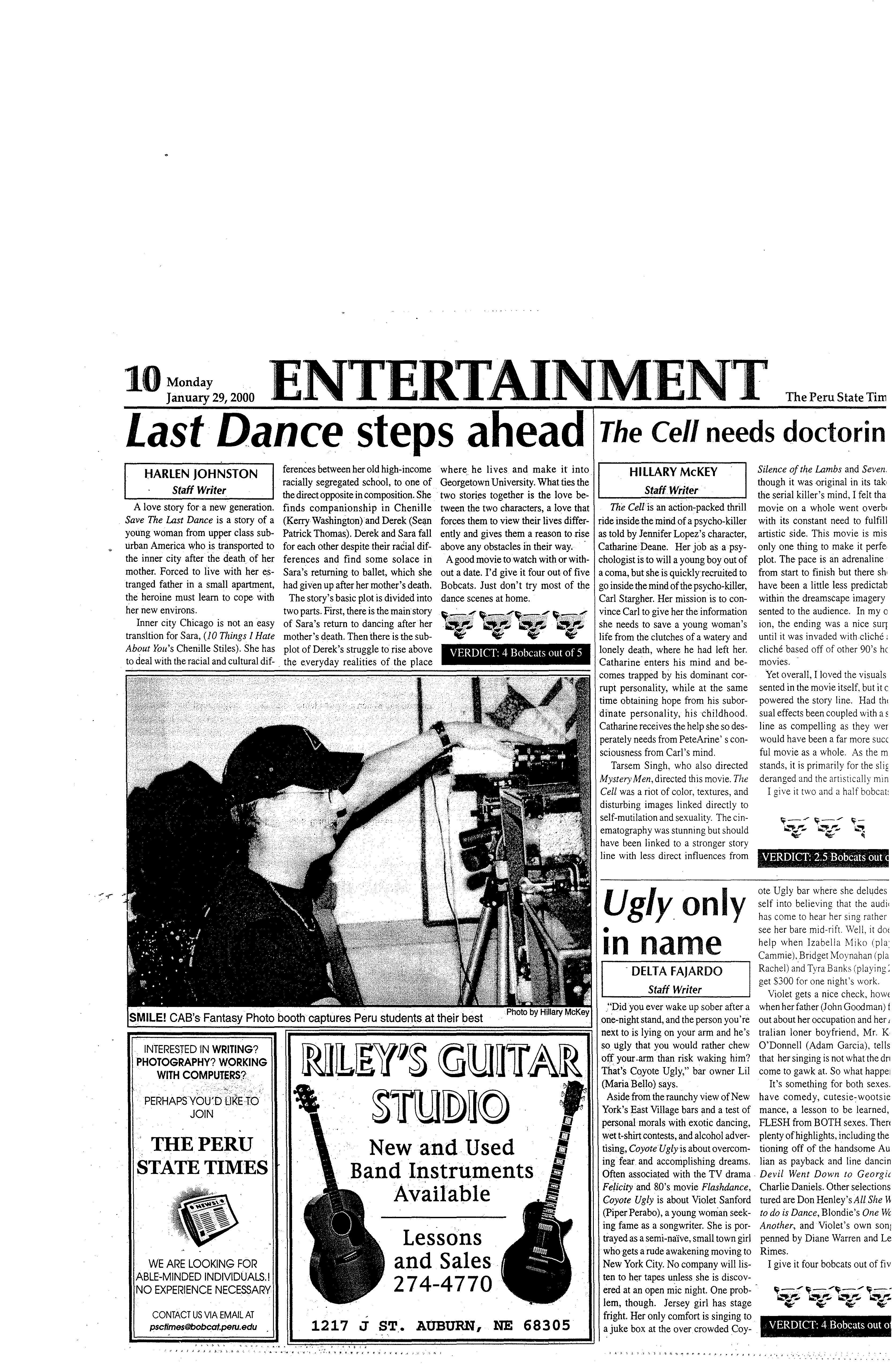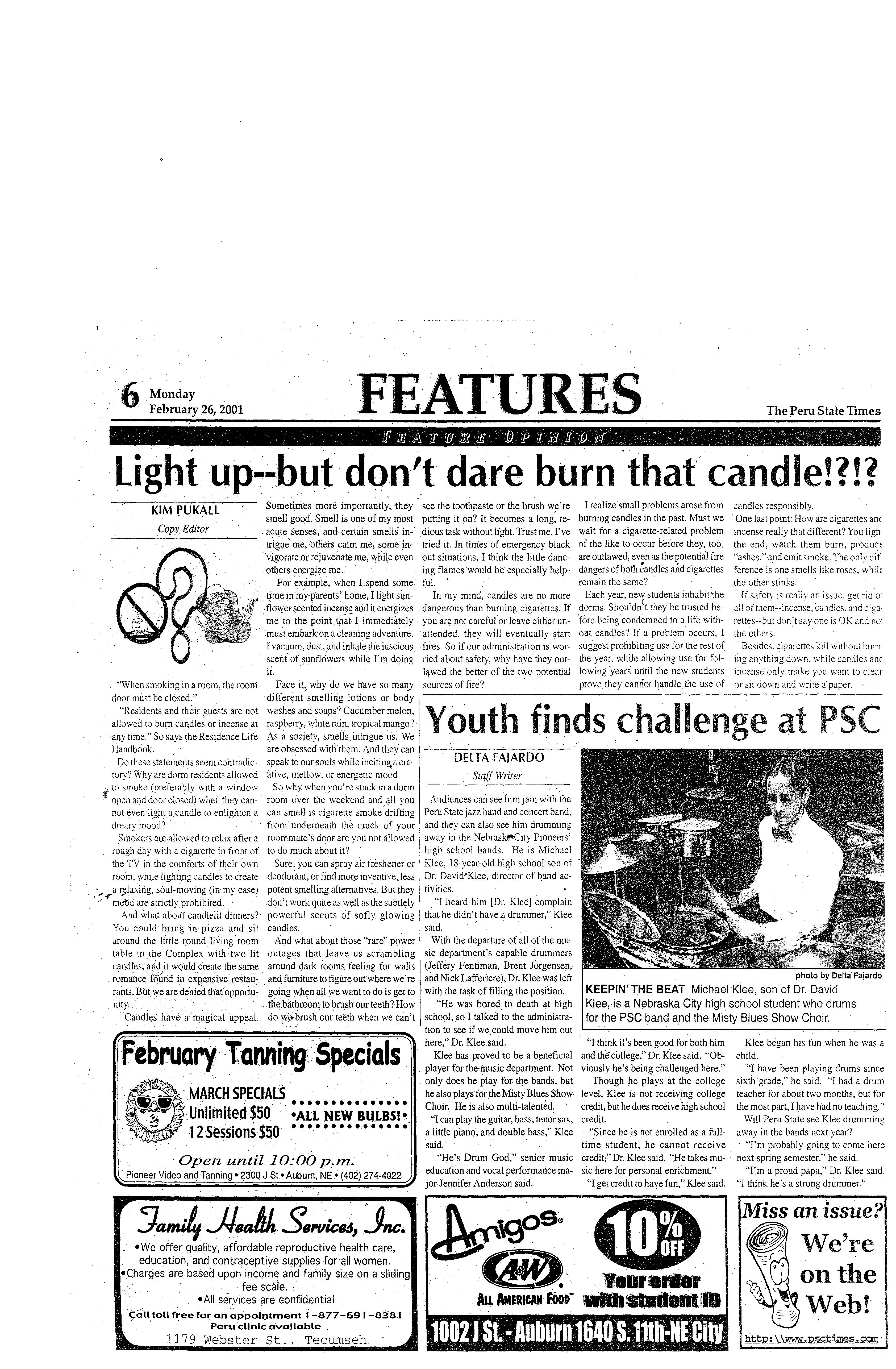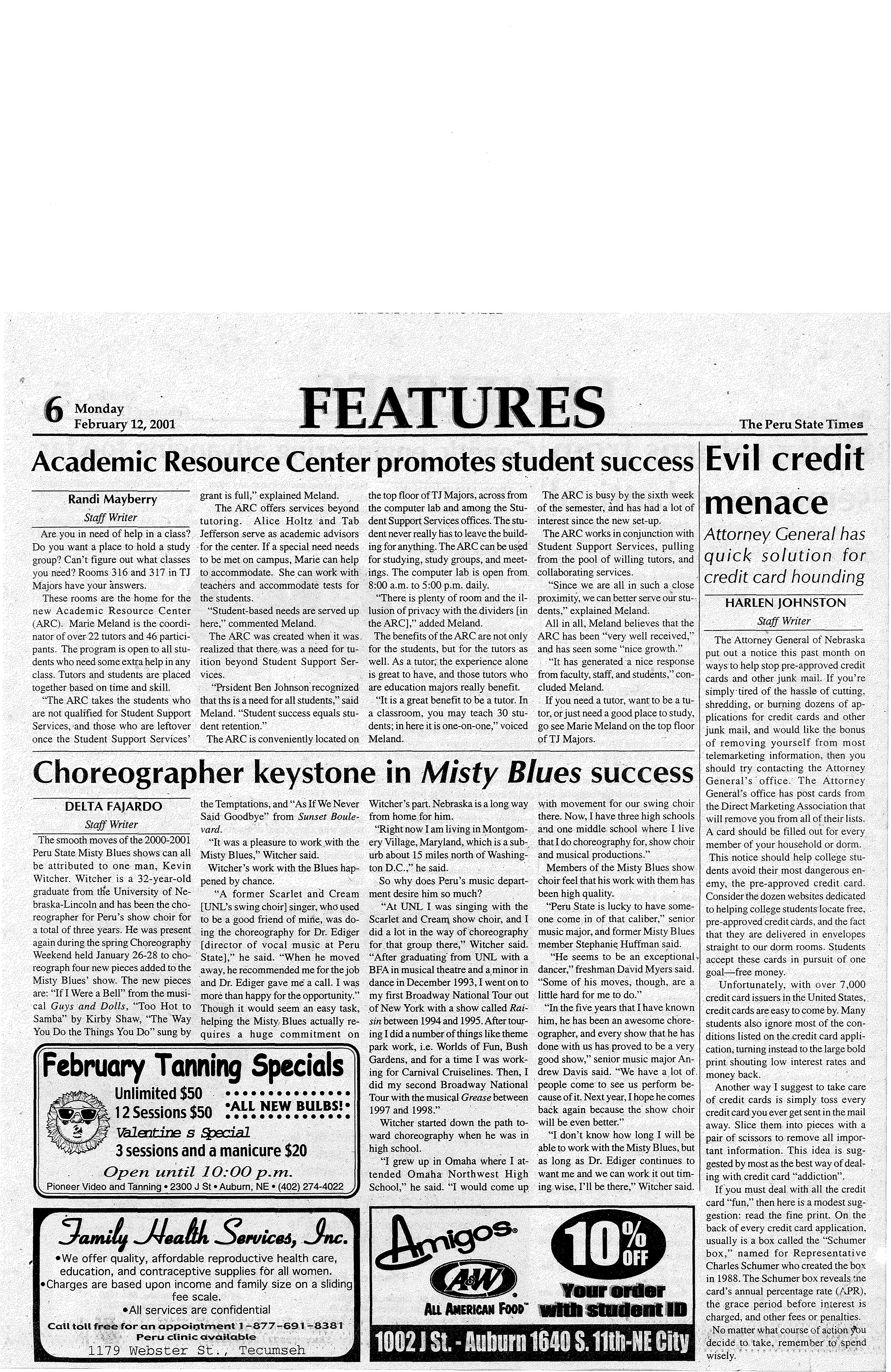 Some people from my "We are happy to have lV popped the question during a Foghat Kenya, Sud<).n, and Ethiopia. home thought I was crazy Hugginkiss," said Nelsen. "She corr concert. Many 'different' people at- This tribe is called Surma, or to move to the village, but from the University of Alaska-Jup tended the concert in which Slow Ride Kecheba They have their own I oelieve in the power of ·where she held duties as Sports Inf. was performed 30 times in a row. traditional culture, beliefs, and , experience. mation Director of the schools Spies remembers a guy with a con- religion, though most of them Most of you probably volleyball team and golf team." federate flag T-shirt with the words 11re Christians. wonder why I want to be "I love the facilities here at Pe 'Don't mess with Texas' who kept on For the first 30 days I was a cowboy; the reason is I State," said Ms. Hugginkiss. "My c asking him where he was from. " there, I did not feel comfortable always like to do extra fice is huge and my pay is great: W Where ain't you from buddy," said the with the way they ate and be- photo by Chuck Fluck work and try new ideas, can complain about $20,000 a year street smart Foghat fan. haved because I was a new- GUITAR MAN loves living in the wild, wild west although it might not be Mrs. Hugginkiss is a 24 year o "I didn't know what to do about this comer who did not know how what most people agree newlywed who originally hails fn 'guy. He started getting.a liJlle close to to speak their language. Shortly with. For example, now I Concord, New Hampshire. She < me and I felt weird," said Spies. "So I after, I got used to their culture, went to the city, I realized that I am a gradu- realize that moving from the city to a tended Keene State University. ; turned to my girlfriend, who was to their parties, and had a girlfriend. I ate student of human research. My littlecowboys''villagein 1996allowed Keene State she meet her co sporting The Bangles 1985 concert T- used to milk a cow and collect the journey to, and experience in, the vii- me to tell the story of my days there sweet heart, Hugh Jass. After gradt: shirt, and I asked her to marry me." cow's dung together in order to make !age was like attending a school with- and gave me some ideas that I now tion of Keene State she accepted ! Peeps was taken back by tbe propo- a fire. The fire produced smoke that out a teacher. My journey was my write about in the Peru State Ti'11es. job at University of Alaska-Juno. sition and started to walk like anEgyp- kept the mosquitoes away from the class, and the villagers were my teach- As you see my picture with a hat and The Sports Information Direct tian. Her dancing left her in confusion cows. I slept in many different grass ers. Now I understand that moving guitar, think of it as me starting to be- plays a vital role in the success of: and she ended up in the arms of Oasis houses and walked naked due to their from one place to another is a good have and look like a cowboy. This also athletic department.