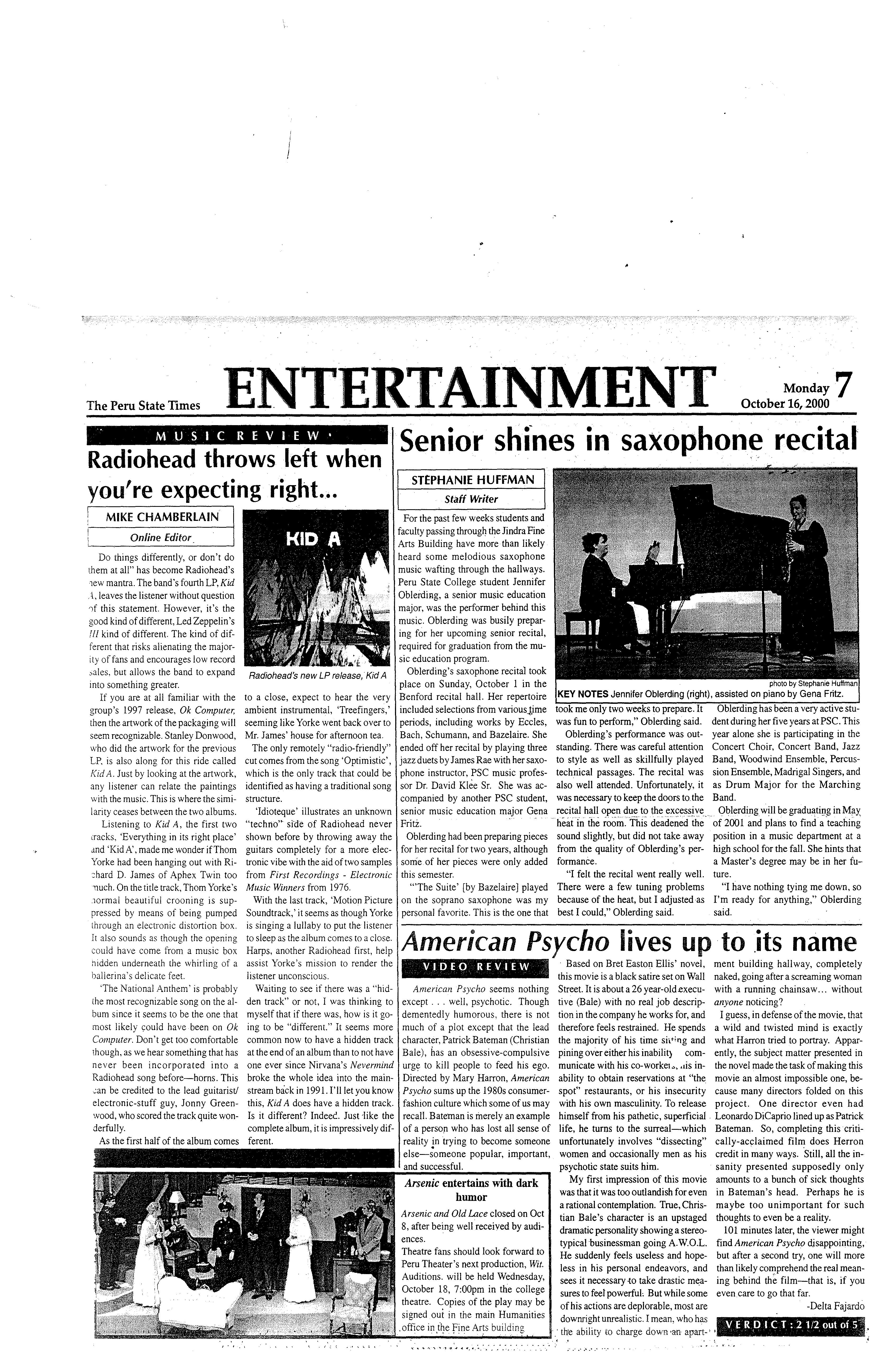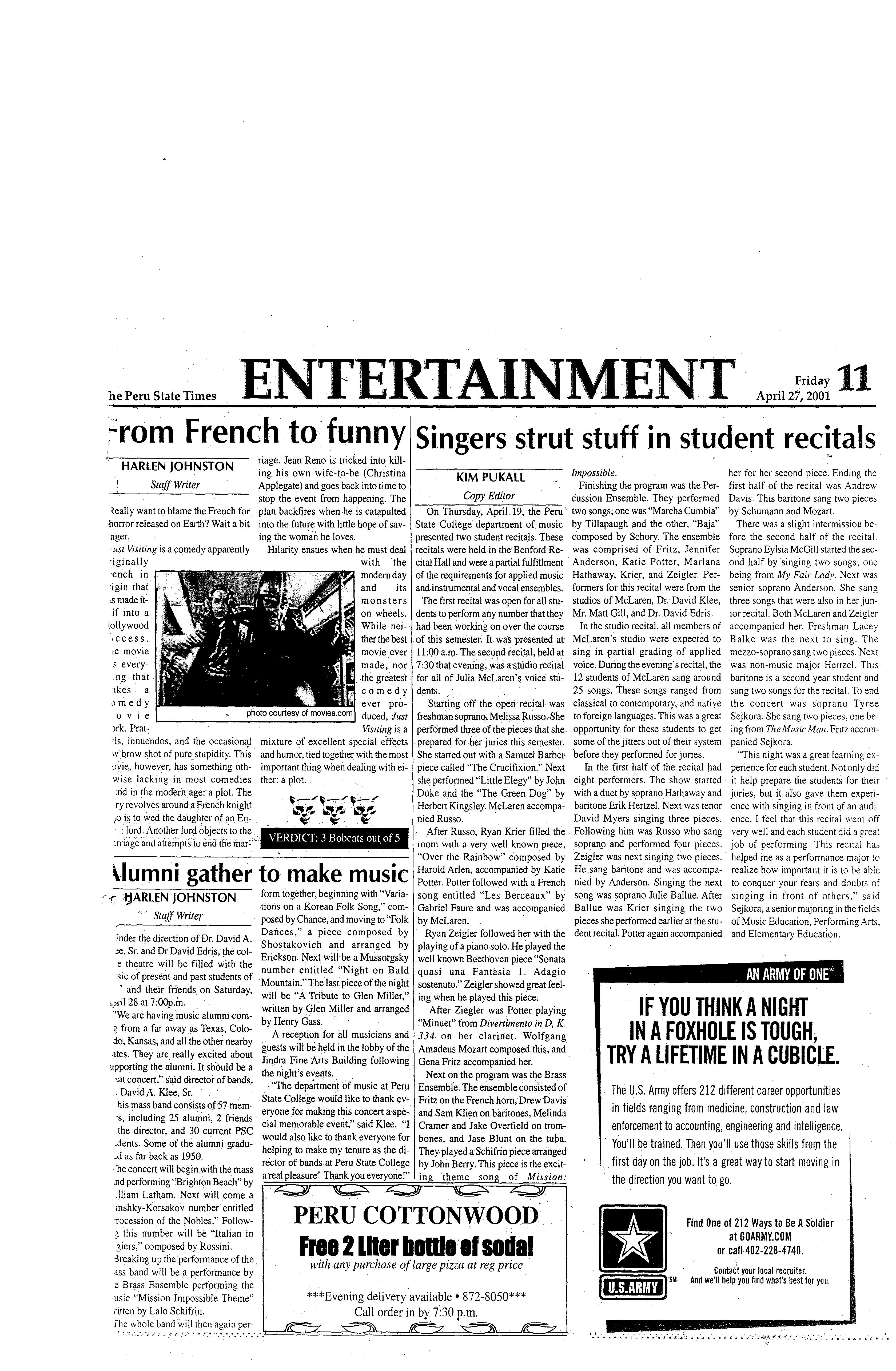 1 • HARLEN JOHNSTON riage. Jean Reno is tricked into kill- · · ing his own wife-t.o-be (Christina KIM PU KALL Impossible. her for her second piece. Ending the Staff Writer Applegate) and goes back into time to Finishing the program was the Per- first half of the recital was Andrew stop the event from happening. The Copy Editor cussion Ensemble. They performed Davis. This baritone sang two pieces {eally want to blame the French for plan backfires when he is catapulted On Thursday, April 19, the Peru' two songs; one was "Marcha Cumbia" by Schumann and Mozart. horror released on Earth? Wait a bit into the future with little hope of sav- State College department of music by Tillapaugh and the other, "Baja" There was a slight intermission benger. ing the woman he loves. presented two student recitals. These composed by Schory. The ensemble fore the second half of the recital. ust Visiting is a comedy apparently ·iginally ench in ·igin that smadeit-