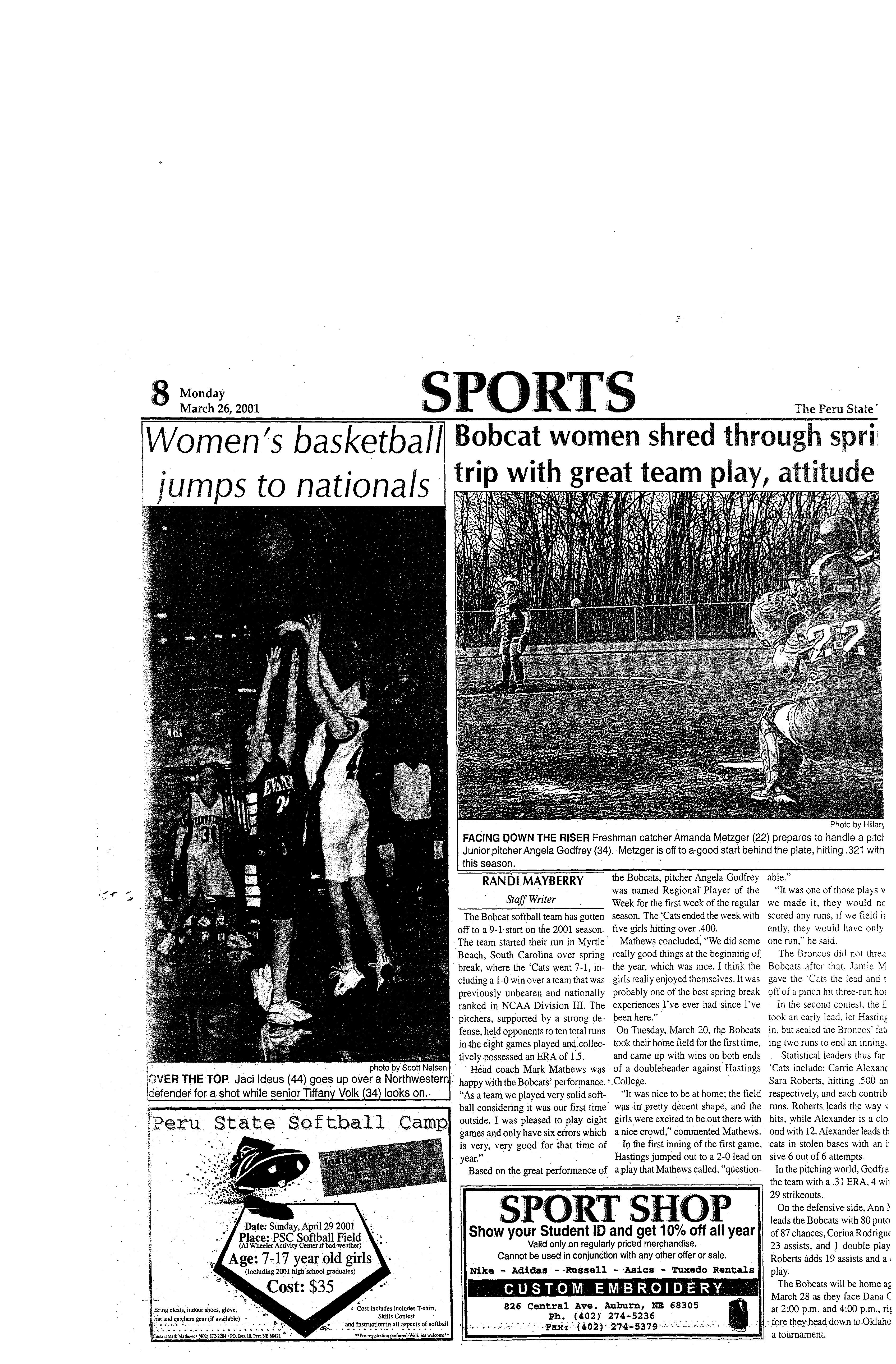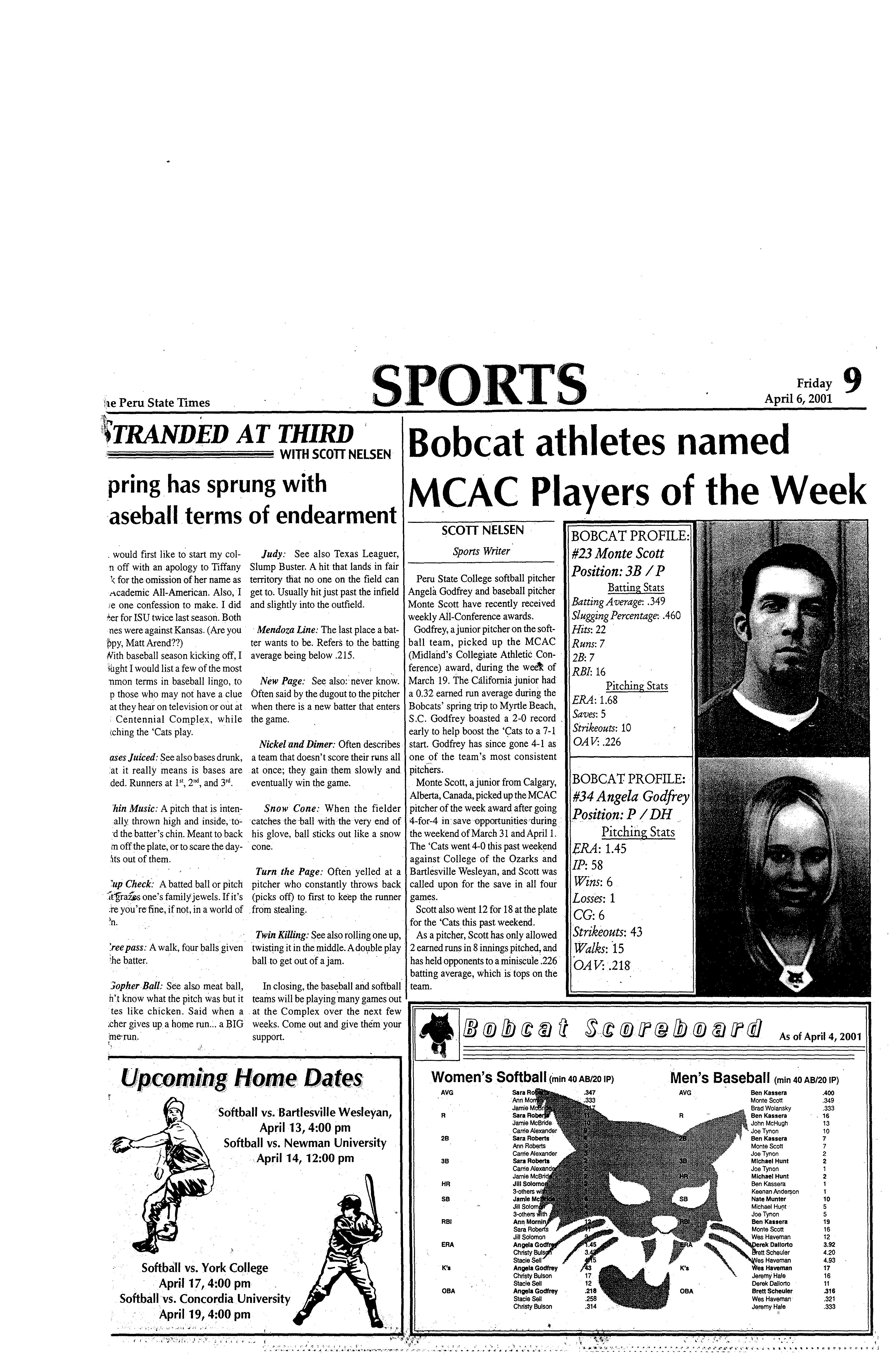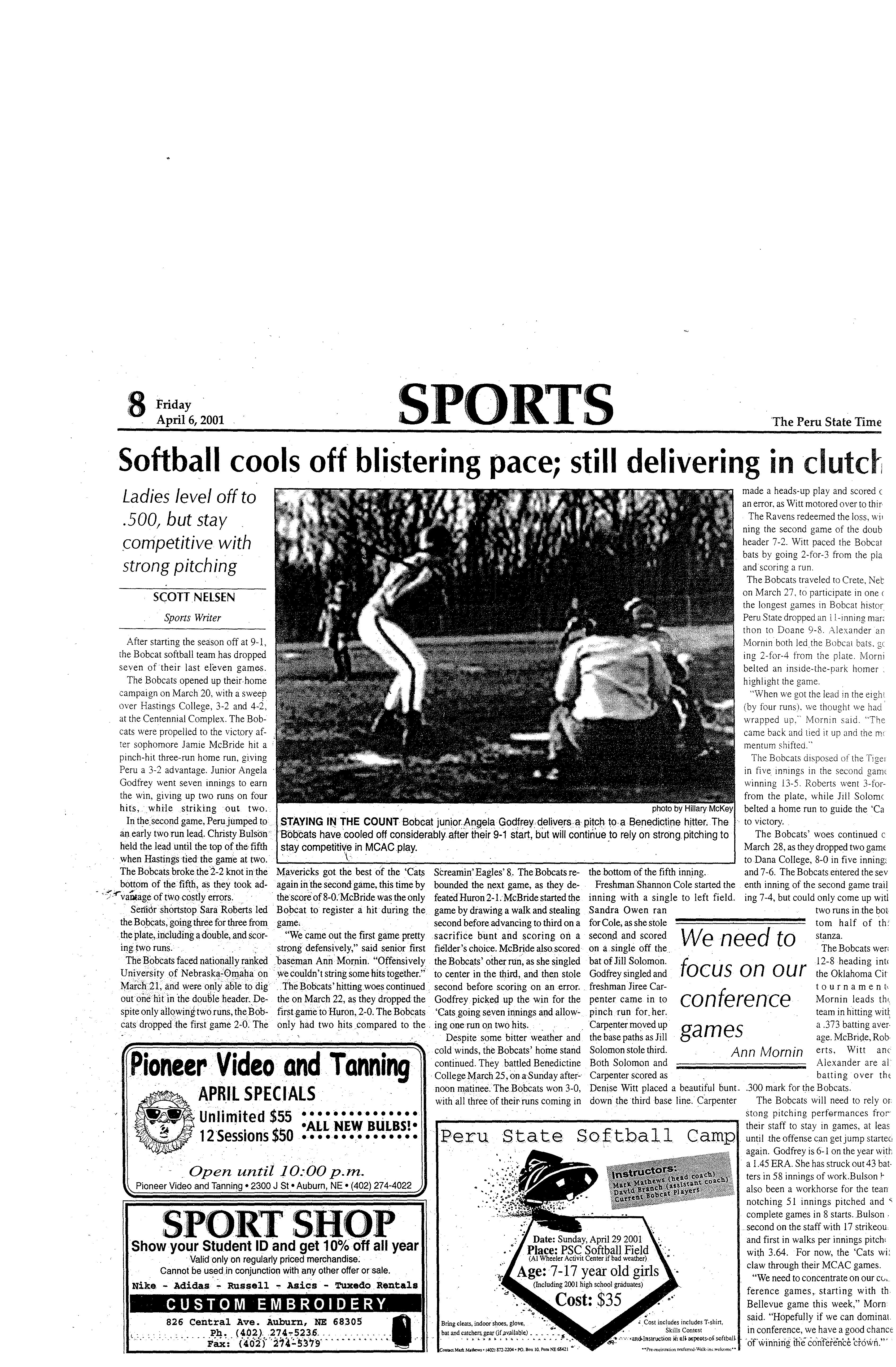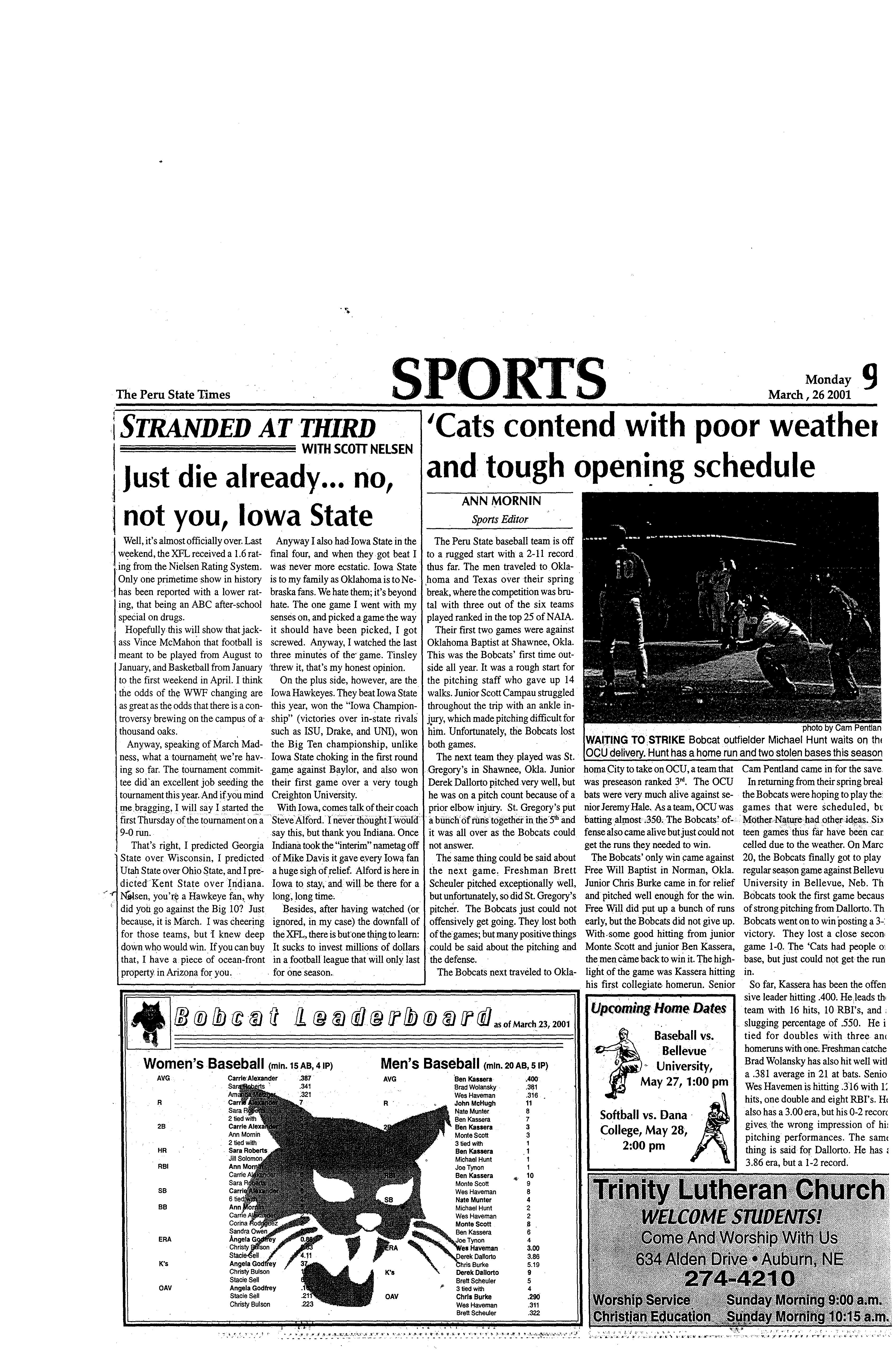 "I've met a lot of networking people ball is the national pastime; every year scholarship to find a new school, or here," .said McGuire. trust millions of kids across the nation lace decide to stay at Iowa State. me and I have a good friendship with I.Ip their cleats to play this beautiful Don't get me wrong, I feel bad for the athletes." She said that she will game, and now ISU thinks that they the swimmers/divers at ISU, UNL, miss the small town atmosphere that can dispose of the program like and !he University of Kansas, but what Peru has to offer. yesterday's newspaper. they're doing at Iowa State is just