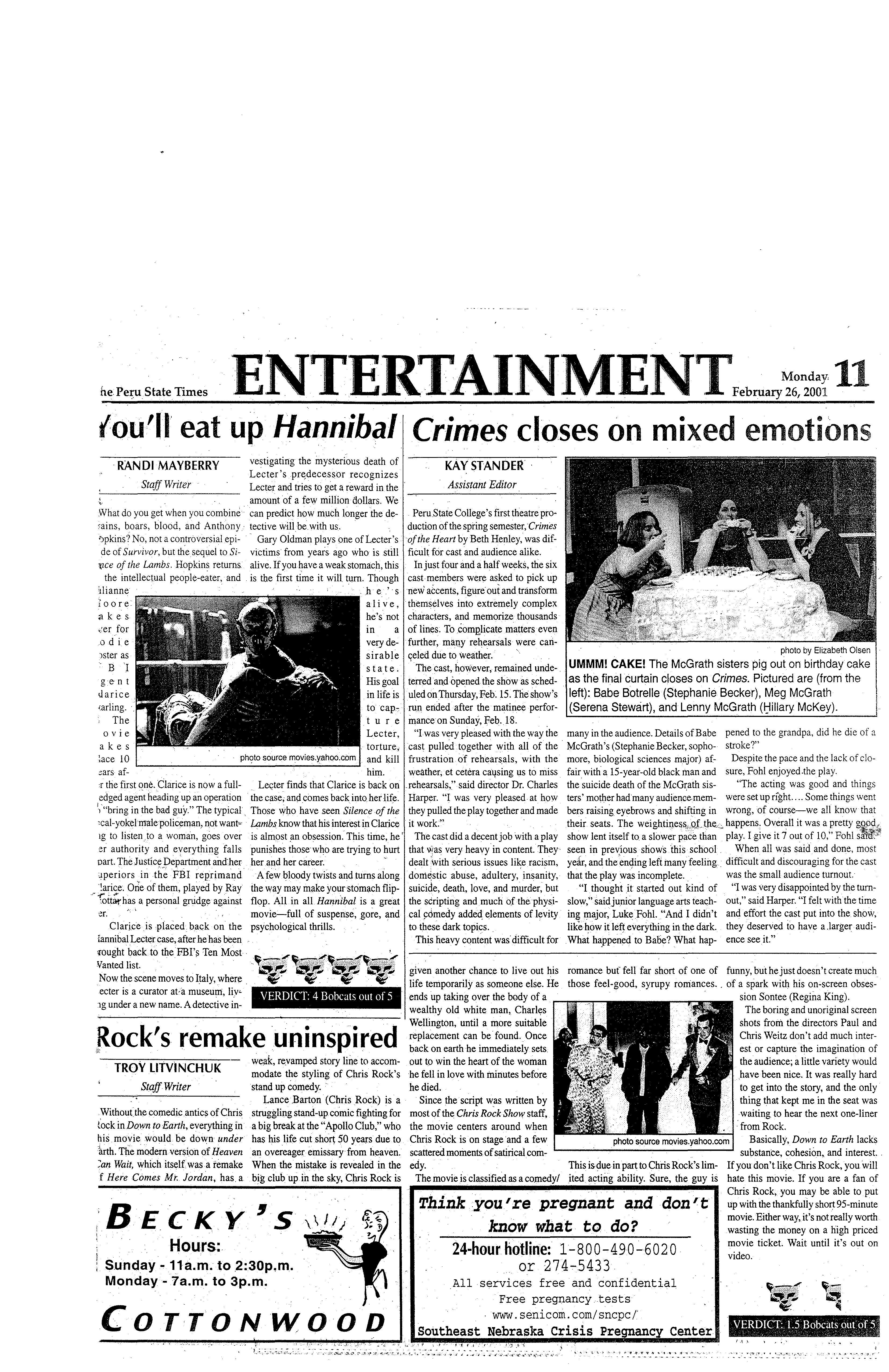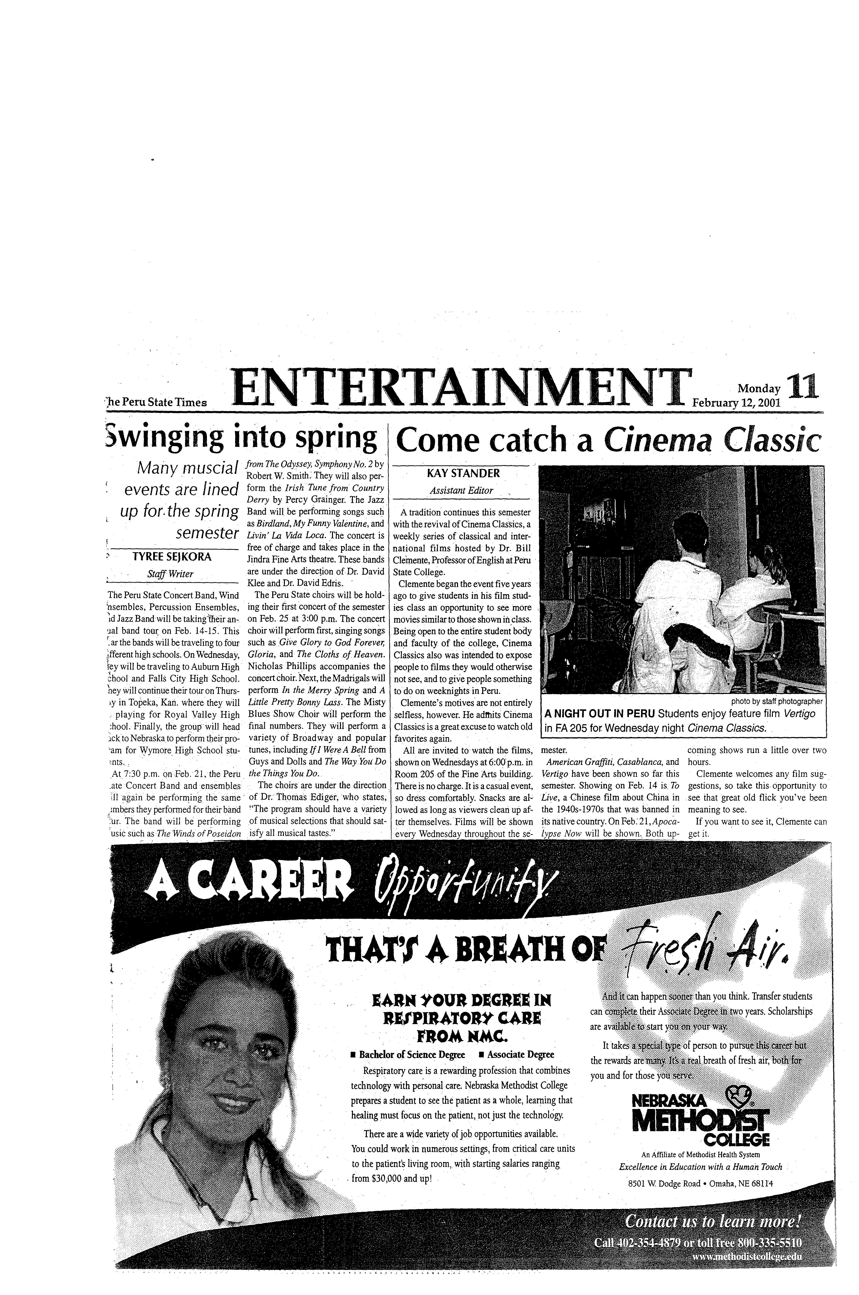 After Osceola, the tour headed to Louisville for their last concert. This time, the whole school, grades K-12, got to watch the performance. The show had a great response from the students of all ages. This was also a great opportunity for the music depart- uos1;;ipuy .IOSS?JOld lJBlUO:) ment to get the name of Peru State ff6-m:::9 College out to prospective students.