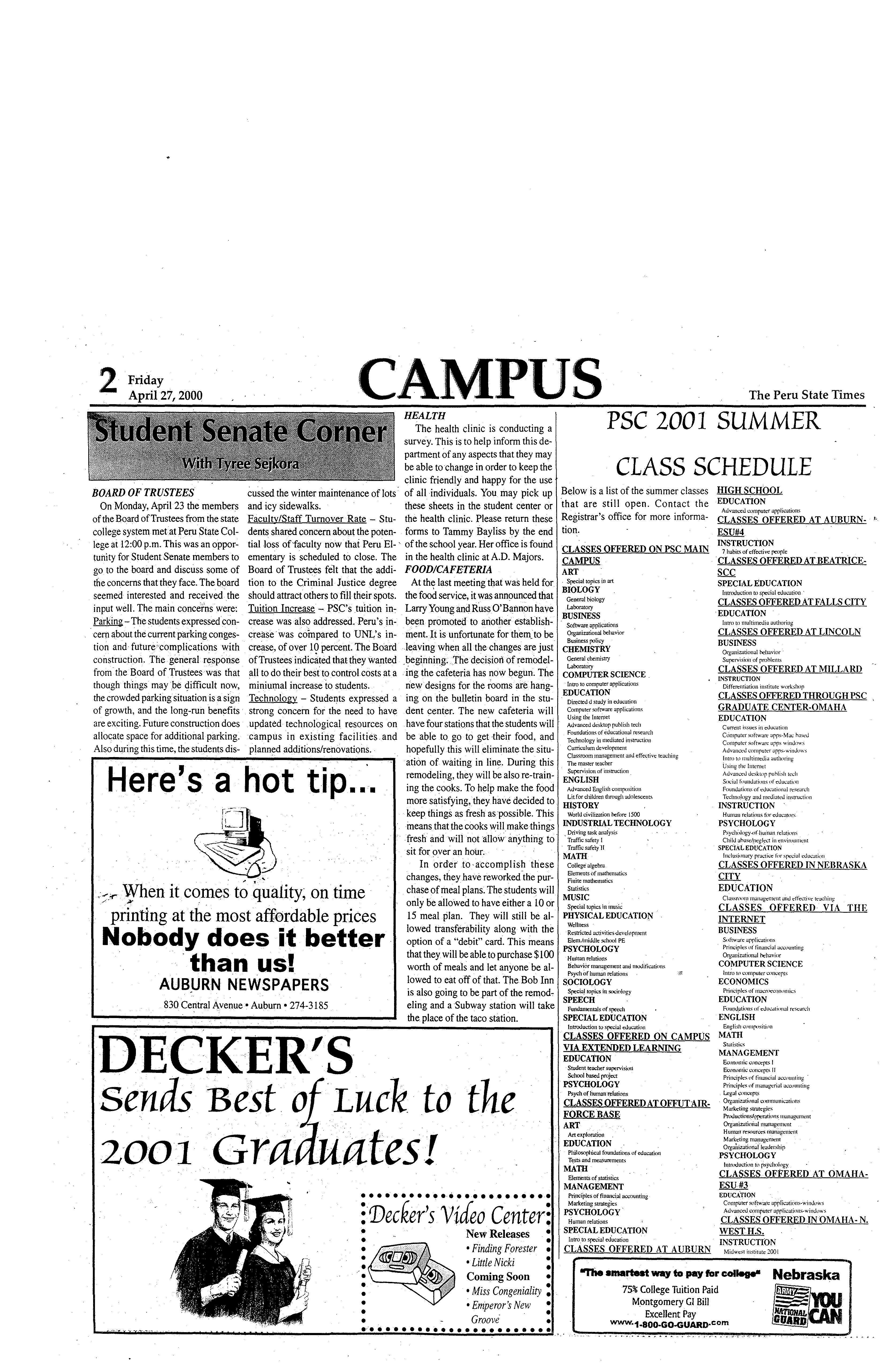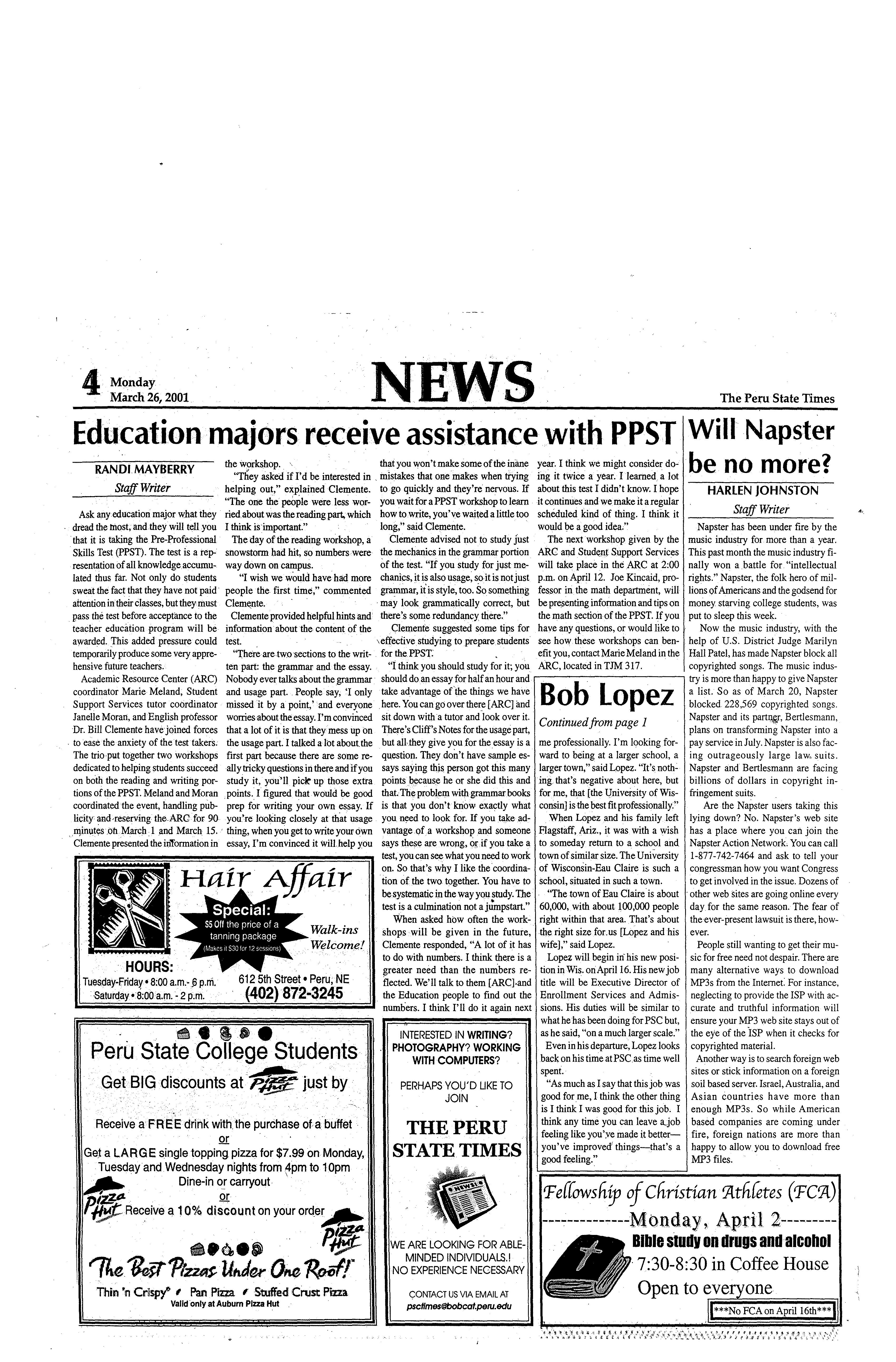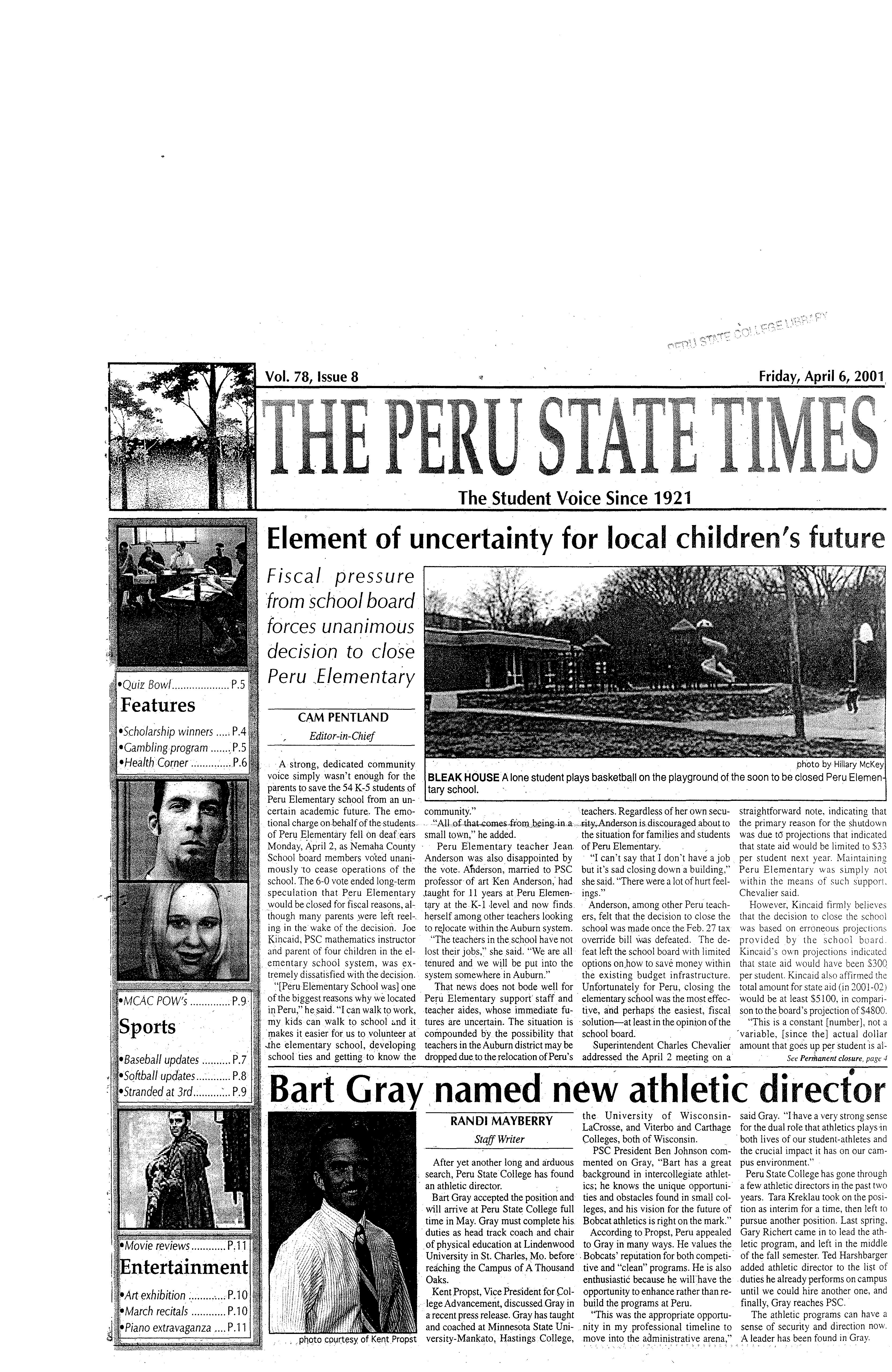 In the April 28, 2000 edition of the Peru State Times, in the article, "50 years ago the book was closed," the Peru State Times reported that Paul Clark Maxwell was to recieve a plaque from Peru State College. The · plaque was in honor of his ·father's• contributions to the. schooL