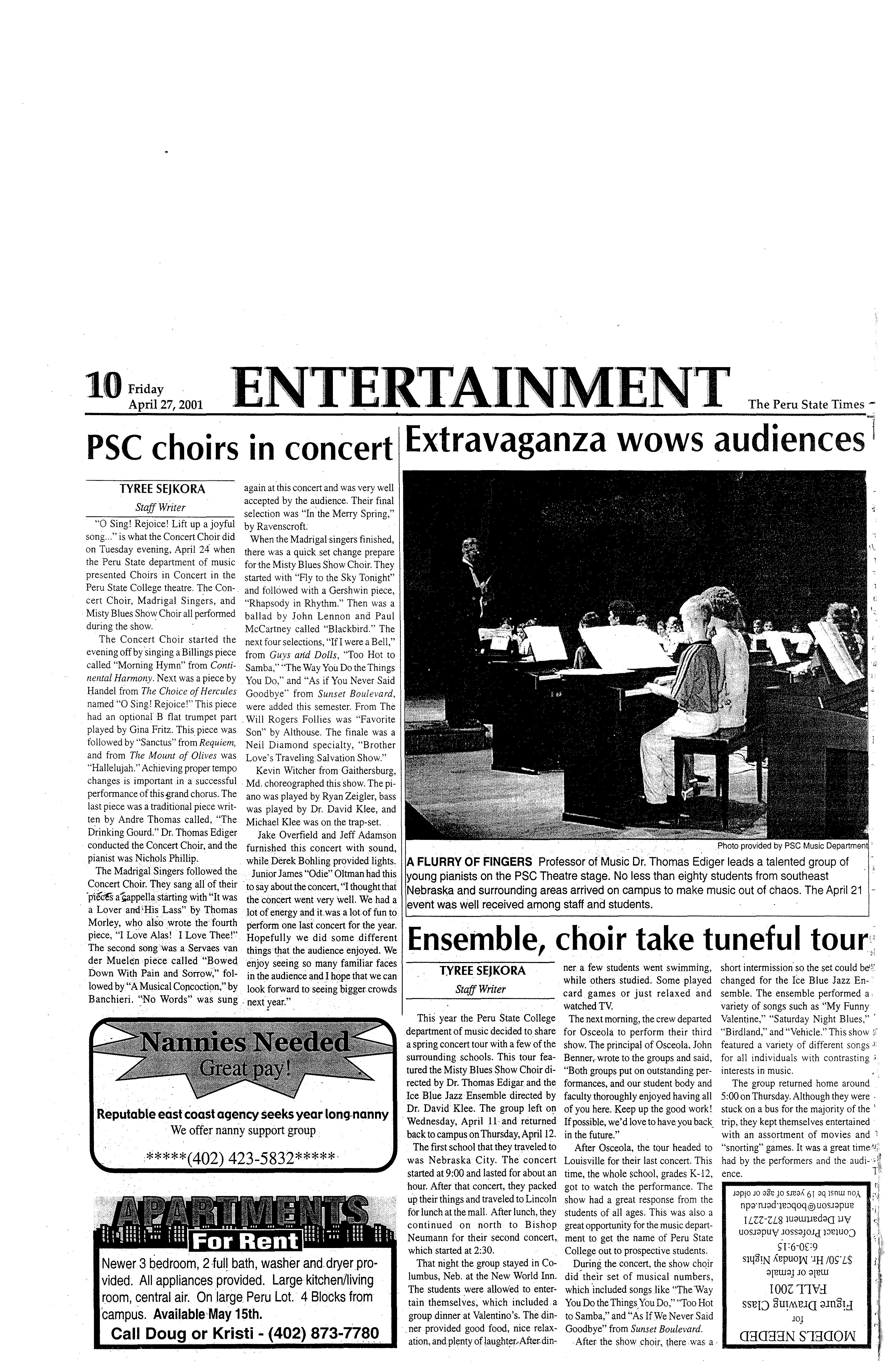 This year the Peru State College department of music decided to share a spring concert tour with a few of the surrounding schools. This tour featured the Misty Blues Show Choir directed by Dr. Thomas Edigar and the Ice Blue Jazz Ensemble directed by Dr. David· Klee. The group left on Wednesday, April 11 ·.and returned back to campus on Thursday, April 12. The first school that they traveled to was Nebraska City. The concert started at 9:00 and lasted for about an hour. After that concert, they packed up their things and traveled to Lincoln for lunch at the mall. After lunch, they continued on north to Bishop Neumann for their second concert, which started at 2:30.