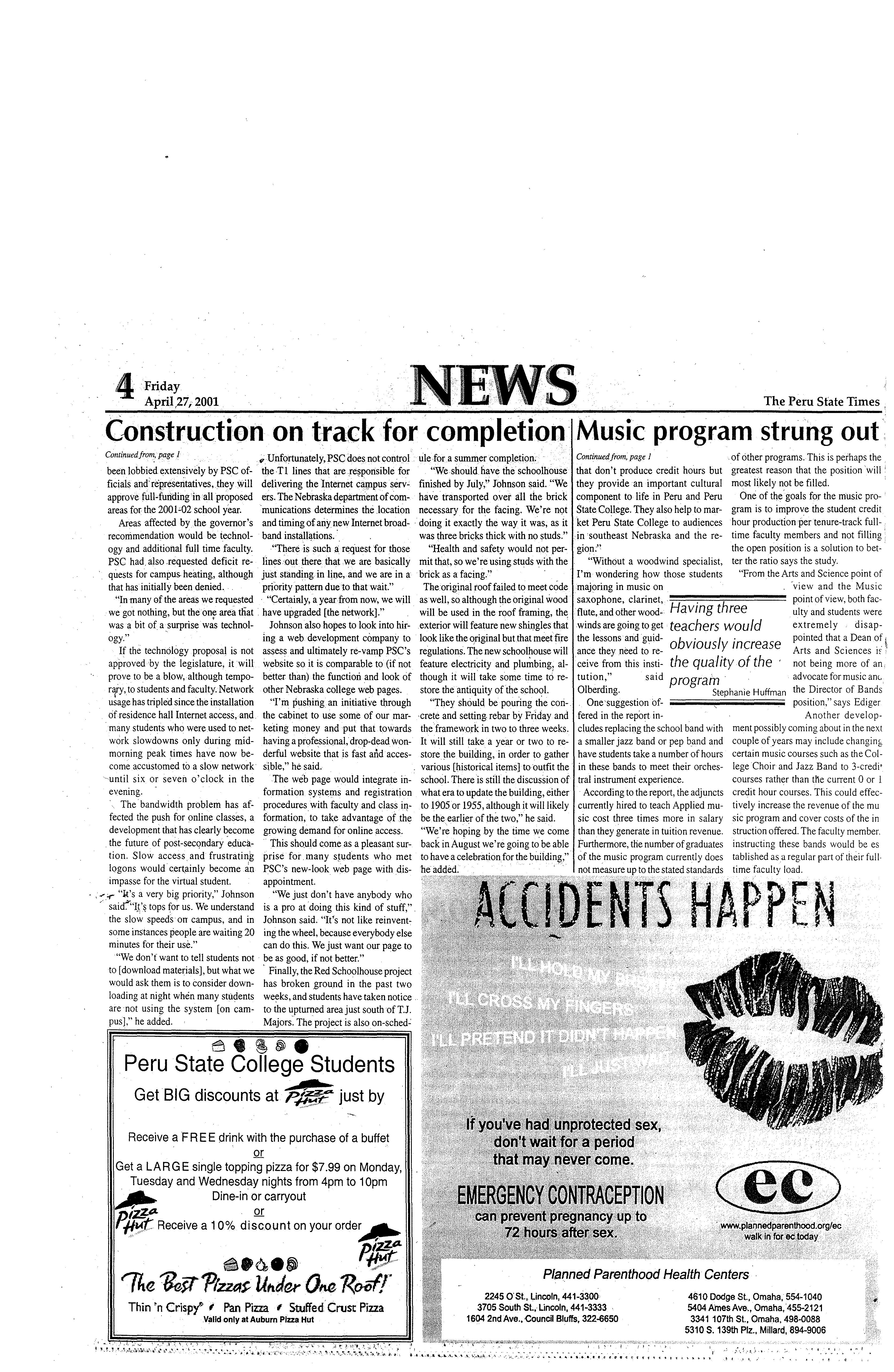 Delzell Hall, and the Complex are also nal carpet. Both Erin Sayer and Sue receiving in-room telephone and Bauer commend Rogge-Davis and Internet services, along with new cable feel "they have done the college television lines. According to Erin good!' They will be on campus periSayer, the Director of Residence Life, odically for the next 12 months to ful"This is the best thing that has hap- fill their site management responsibilipened to Peru State College housing since tht;y built Centennial Complex." Erin Sayer feels strongly about the However, the· delays in the wiring positive things renovation is bringing project are an inconvenience. Going and the. bond money the Financial into the sixth week in the semester, the Trustees are raising. "'this is the most residents still didn't have phone or moneythathasgoneintotheresidence