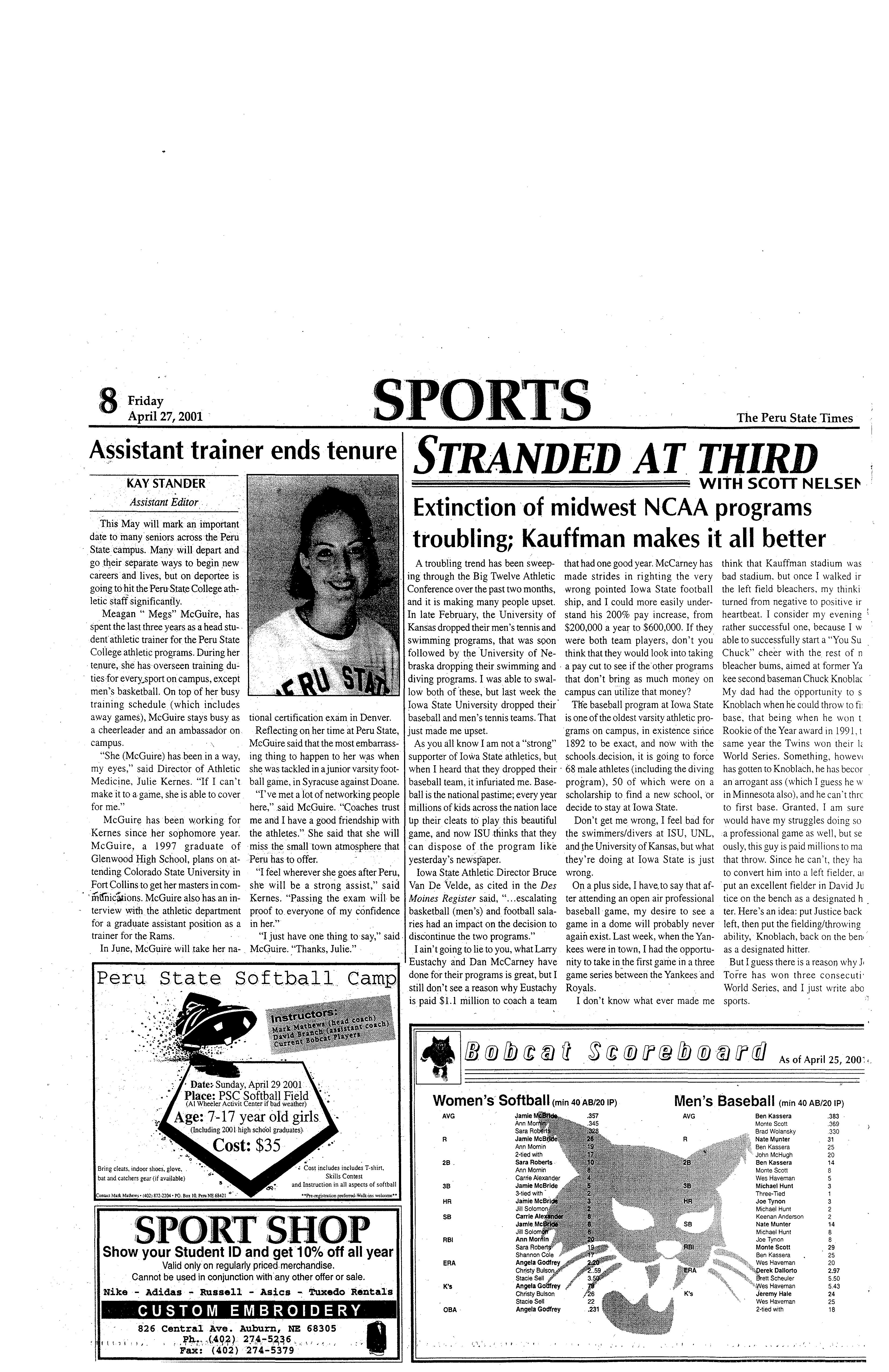A troubling trend has been sweep- that had one good year. McCamey has ing through the Big Twelve Athletic made strides in righting the very Conference overthe pasttwo months, wrong pointed Iowa State football and it is making many people upset. ship, and I could more easily underIn late February, the University of stand his 200% pay increase, from Kansas dropped their men's tennis and $200,000 a year to $600,000. If they swimming programs, that was soon were both team players, don't you followed by the ·university of Ne- think that they would look into taking braska dropping their swimming and · a pay cut to see if the other programs diving programs. I was able to swal- that don't bring as much money on low both of ·these, but last week the campus can utilize that money? Iowa State University dropped their· Tlfo baseball program at Iowa State tional certification exam in Denver. baseball and men's tennis teams. That is one of the oldest varsity athletic proReflecting on her time at Peru State, just made me upset. grams on campus, in existence sirice McGuire said that the most embarrass- As you all know I am not a "strong" 1892 to be exact, and now with the ing thing to happen to her w.as when supporter of Iowa State athletics, but_ schools decision, it is going to force she was tackled in a junior varsity foot- when I heard that they dropped their · 68 male athletes (including the diving ball game, in Syracuse against Doane. baseball team, it infuriated me. Base- program), 50 of which were on a