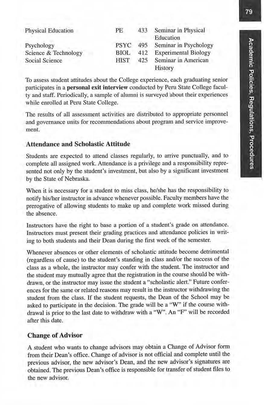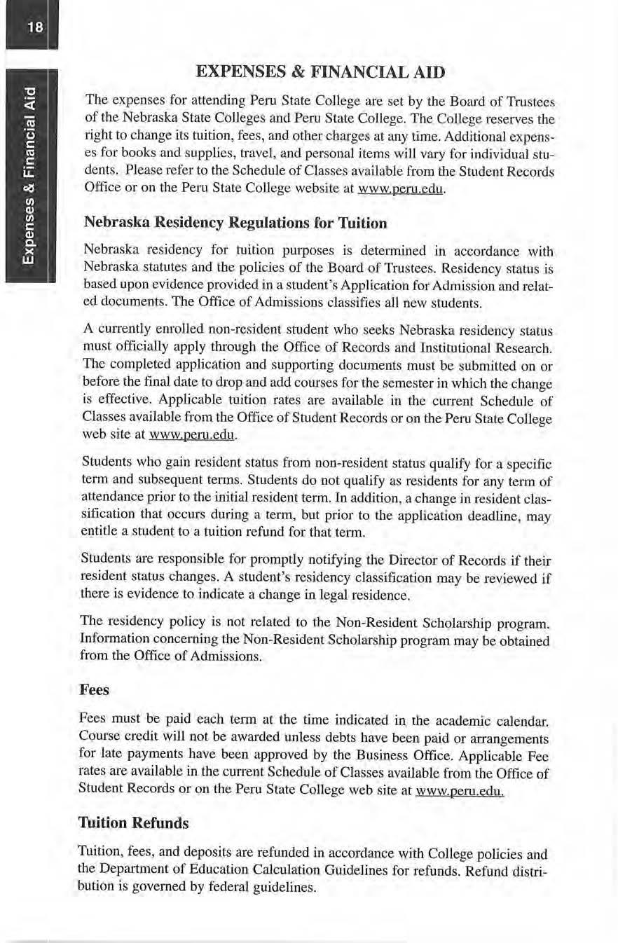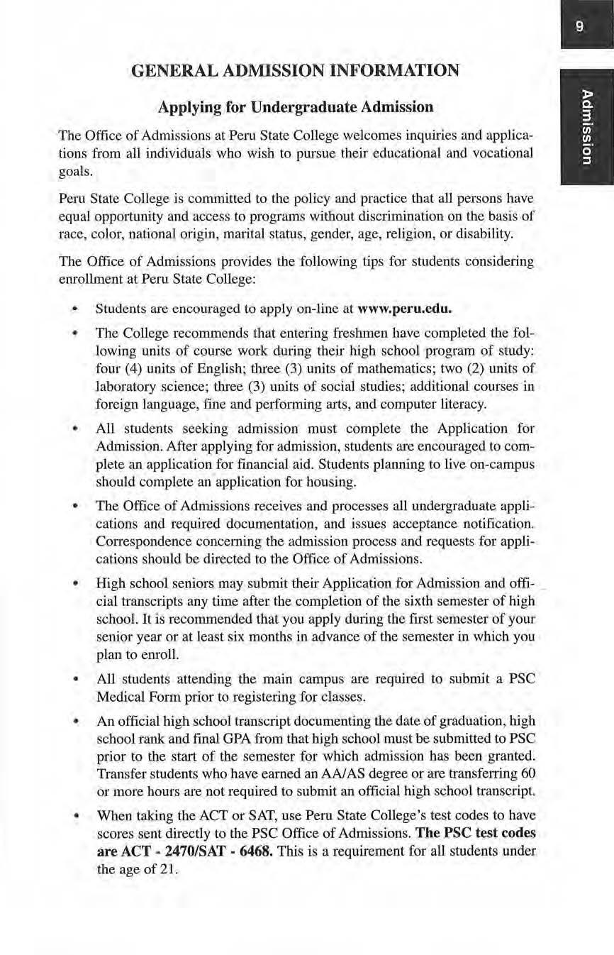 Flunily Education Rights an<l Privacy Act of 1974 ..56 Federal Finnnci aJ Aid Programs • • 23 r-c.,,, . 18 Fiaal Bxams . . ... . .. ...... .. ...... , . . , .. ..81 Pinancial Aid , • 20, 21, 43 Food Service .42 Freedom ofAccess .. . , . .. . . , . . , ... . ...... , .51 Fn.'Cdom of Associatio n , , , .52 Freedom of Expression "_. A 52 Freedotn &om Unreasonable Search/Seizure 51 Pu ll-Time S llldent Status 81 G Geography Course Descriptions ..•. 196 Geology Course Descriptions • • , , , , I97 Goneral Admission lnformnlion . , ... • , .. , .. , . .9 Gencrol Science Course Descr iptions , 196 General S tudies • , .•. 62, 84 General Studies and Major ....•. • , , , , 62 Goa.ls of the College , , ? Grade Appeal PoHcy , 73 Grade Poinl Average , 63 Grading System .. , ... . . . .... ........ . .... .81 Graduate Studies , • , 68 Graduation Honors , • , , • , 82 Graduation Requirements .... . ..... • .. • .. , . .61 H Helllth Center , , , , , , .46 High School Credit , ,71 History Course Dl'>(:riptions , , , • , • , , 198 History Minor 117 History of the College , 5 Honorary SQCieties , , , .49 Honors Program , , , , • , 89 Housit\g , .43, 45 How to Detem1ine Credit , 7 I Humanities Course Descriptions , , 20 I I lncomplete Coursework , , , • , 71 lndependellt Study , 68 lnslilutional Loans and Awards • • 39 In.stitutional Scholarships , , , 21 Internation al Student Admission • •. • , J 5 Jnttoruunlls and Recreation , 43 lnleruatioual Students , 15 lutemship , 69 Internet Courses , 66 Introduction to Peru State • , 5 J Journalism Uiurse Description.• . . , , . • .•. .. . . 202 L Liberal Arts Majo, , , , , .99 Library , • • , , • , .60 Lincoln Center l':x.tension Program , , , 66 Lonn• •. • , , , 39, 43 M Majors • , , 87 Major Grade Point Average , 63 Mathematics Course Descript ions , 203 Math too ... .. ...........................67 MaO,ematics Major , , , • • • 101 Mathematics Minor , 102 Maymcste r Session , 19 Medical Technology ... . ... , .......... . .. .126 Memberships and Accreditations , • 7 Midwest StudeJll Exchange Program 23 Mid-year Admis~ions , 10 Military Science Cowse Descriptions • .• , , • .207 Minors , , , , 87 Mis.sion or the College 6 Music Course Dcscri,ptions , • , , , , , ,2 1l Mu~ic Major , l 03 Music Minor , , 110 Music Organizations ... .. . . , .. . .... . ... ... .49 N Natur~J Resources 2 Plus 2 Agreement , ,127 Natural Science Major , • I I 1 Nebraska Emotional and Mental Incapacity Status •.. , , , , , .132 Nebr;;ska Felony aod Misdemeru10r Pol.icy , ... . 1.3 1 Nebraska Residency Regufo liong for Tuition 18 Newspaper 50 Non-Academic PoHcies . , .... . .. . .. • . , . . . • . .56 Non-High Sc),ool Graduates (Freshmen) , 12 NonreS'ident Working Fulllime in Nebr. Progmms 23 Notification of Admission , , • , JO 0 Offutt Ex tension Programs , •. , 66, 13(1 Orientation , , .4.3 Other Sources of Financial Aid , • , .21 Overload , , , .82 p P'.irking , , , , , , ••. , .• .59 PEP ,, , , , 73 Personal Curriculum Guide , 86 Persona l Enrichment or Recertificauon .• . • ..... 14 Peru Srate Credits , , , , , 63 Peru S~ue Times .50 Petition , .... ..... . .. . • .. • . . • . • .. • .. , ... ..82 Philosophy of the College , , 6 Philosophy Course Descriptions , 2 15 Physical Education Course Descriptions • 216 Physical .Education Major , • , , 140 Physics Course Descriptions • , 221 Political Science Course Descriptions 222 Pre-Professional Programs .. . . . . . . , . . , ..69, 119 Pre-Dental and Pre-Medical , , 120, 121 Pre-Dental Hygiene 121 Pre-Enginee ring .. ....... , . . . . .. . . .. , . . , .. 121 Pre-Forestry 121 Pre, Law Study , I I 9 Pre-Monuary ........... . . ... , . . . ... .. , .. 122 Pre-Nuroing •.• 122 Pre-Optometry , , i 23 Pre-Osteopathic Medicine , , 123 Pre-Pharmacy , , , • 123 II I