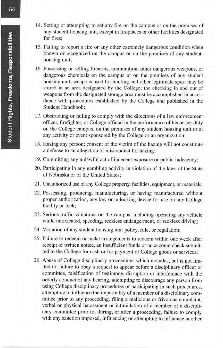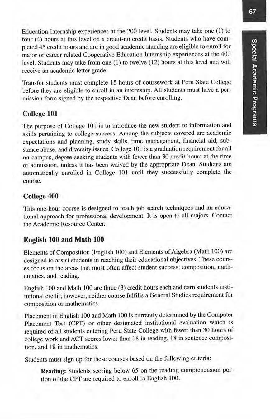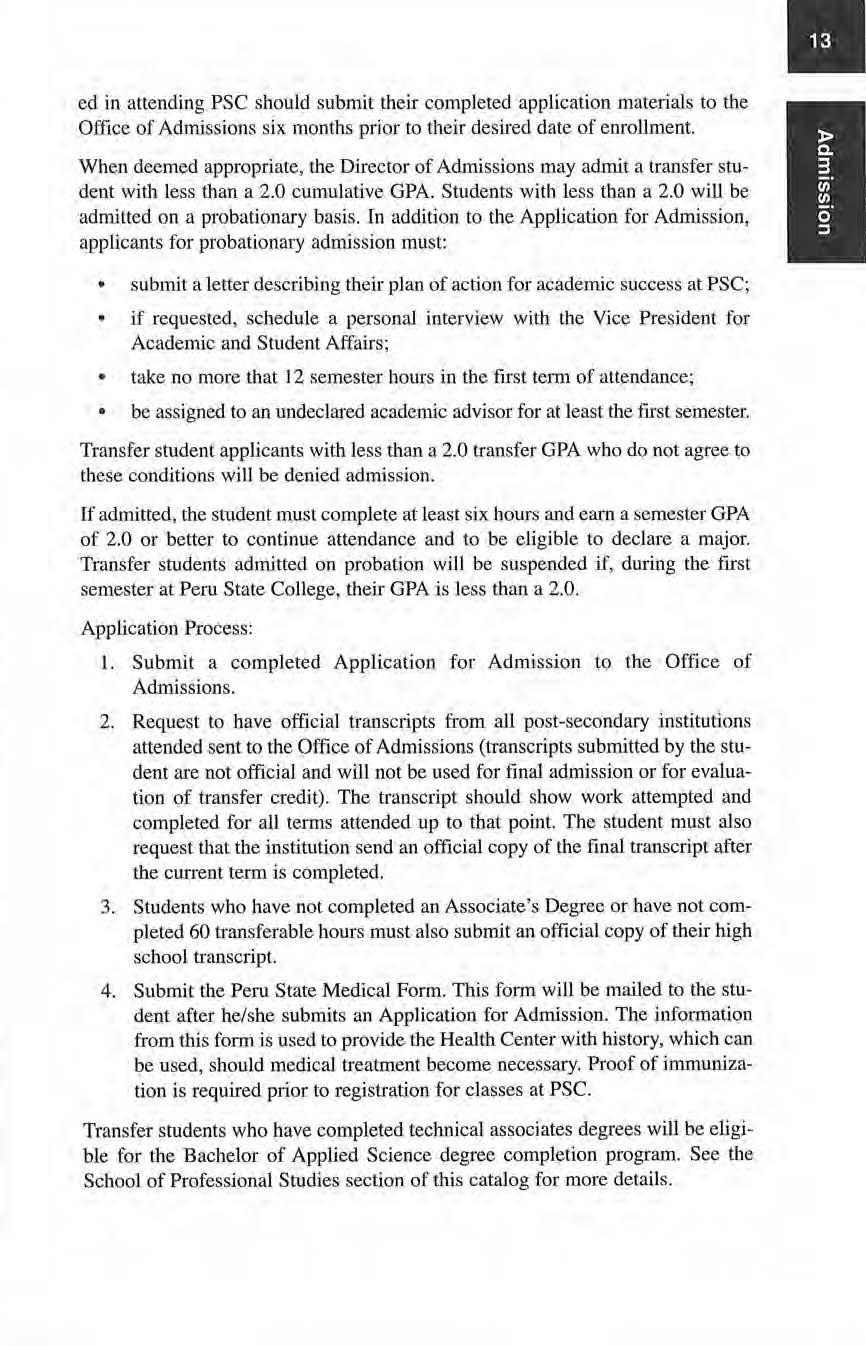 Flunily Education Rights an<l Privacy Act of 1974 ..56 Federal Finnnci aJ Aid Programs • • 23 r-c.,,, . 18 Fiaal Bxams . . ... . .. ...... .. ...... , . . , .. ..81 Pinancial Aid , • 20, 21, 43 Food Service .42 Freedom ofAccess .. . , . .. . . , . . , ... . ...... , .51 Fn.'Cdom of Associatio n , , , .52 Freedom of Expression "_. A 52 Freedotn &om Unreasonable Search/Seizure 51 Pu ll-Time S llldent Status 81 G Geography Course Descriptions ..•. 196 Geology Course Descriptions • • , , , , I97 Goneral Admission lnformnlion . , ... • , .. , .. , . .9 Gencrol Science Course Descr iptions , 196 General S tudies • , .•. 62, 84 General Studies and Major ....•. • , , , , 62 Goa.ls of the College , , ? Grade Appeal PoHcy , 73 Grade Poinl Average , 63 Grading System .. , ... . . . .... ........ . .... .81 Graduate Studies , • , 68 Graduation Honors , • , , • , 82 Graduation Requirements .... . ..... • .. • .. , . .61 H Helllth Center , , , , , , .46 High School Credit , ,71 History Course Dl'>(:riptions , , , • , • , , 198 History Minor 117 History of the College , 5 Honorary SQCieties , , , .49 Honors Program , , , , • , 89 Housit\g , .43, 45 How to Detem1ine Credit , 7 I Humanities Course Descriptions , , 20 I I lncomplete Coursework , , , • , 71 lndependellt Study , 68 lnslilutional Loans and Awards • • 39 In.stitutional Scholarships , , , 21 Internation al Student Admission • •. • , J 5 Jnttoruunlls and Recreation , 43 lnleruatioual Students , 15 lutemship , 69 Internet Courses , 66 Introduction to Peru State • , 5 J Journalism Uiurse Description.• . . , , . • .•. .. . . 202 L Liberal Arts Majo, , , , , .99 Library , • • , , • , .60 Lincoln Center l':x.tension Program , , , 66 Lonn• •. • , , , 39, 43 M Majors • , , 87 Major Grade Point Average , 63 Mathematics Course Descript ions , 203 Math too ... .. ...........................67 MaO,ematics Major , , , • • • 101 Mathematics Minor , 102 Maymcste r Session , 19 Medical Technology ... . ... , .......... . .. .126 Memberships and Accreditations , • 7 Midwest StudeJll Exchange Program 23 Mid-year Admis~ions , 10 Military Science Cowse Descriptions • .• , , • .207 Minors , , , , 87 Mis.sion or the College 6 Music Course Dcscri,ptions , • , , , , , ,2 1l Mu~ic Major , l 03 Music Minor , , 110 Music Organizations ... .. . . , .. . .... . ... ... .49 N Natur~J Resources 2 Plus 2 Agreement , ,127 Natural Science Major , • I I 1 Nebraska Emotional and Mental Incapacity Status •.. , , , , , .132 Nebr;;ska Felony aod Misdemeru10r Pol.icy , ... . 1.3 1 Nebraska Residency Regufo liong for Tuition 18 Newspaper 50 Non-Academic PoHcies . , .... . .. . .. • . , . . . • . .56 Non-High Sc),ool Graduates (Freshmen) , 12 NonreS'ident Working Fulllime in Nebr. Progmms 23 Notification of Admission , , • , JO 0 Offutt Ex tension Programs , •. , 66, 13(1 Orientation , , .4.3 Other Sources of Financial Aid , • , .21 Overload , , , .82 p P'.irking , , , , , , ••. , .• .59 PEP ,, , , , 73 Personal Curriculum Guide , 86 Persona l Enrichment or Recertificauon .• . • ..... 14 Peru Srate Credits , , , , , 63 Peru S~ue Times .50 Petition , .... ..... . .. . • .. • . . • . • .. • .. , ... ..82 Philosophy of the College , , 6 Philosophy Course Descriptions , 2 15 Physical Education Course Descriptions • 216 Physical .Education Major , • , , 140 Physics Course Descriptions • , 221 Political Science Course Descriptions 222 Pre-Professional Programs .. . . . . . . , . . , ..69, 119 Pre-Dental and Pre-Medical , , 120, 121 Pre-Dental Hygiene 121 Pre-Enginee ring .. ....... , . . . . .. . . .. , . . , .. 121 Pre-Forestry 121 Pre, Law Study , I I 9 Pre-Monuary ........... . . ... , . . . ... .. , .. 122 Pre-Nuroing •.• 122 Pre-Optometry , , i 23 Pre-Osteopathic Medicine , , 123 Pre-Pharmacy , , , • 123 II I