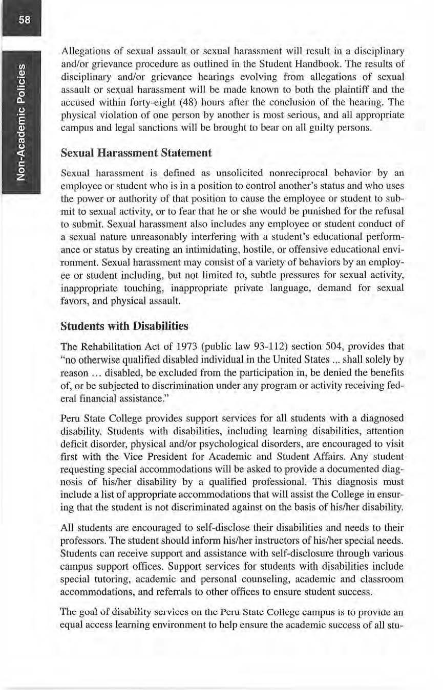 No person attending Peru State College shall, on the grounds of race, color, nationalorigin,handicap, orgender,beexcludedfromparticipationin,bedenied of, orbesubjectedtodiscriminationunderanyprogramor activityreceivingfederal financial assistance. Inquiries regarding these matters should be directed to theVicePresident forAdministration andFinance.