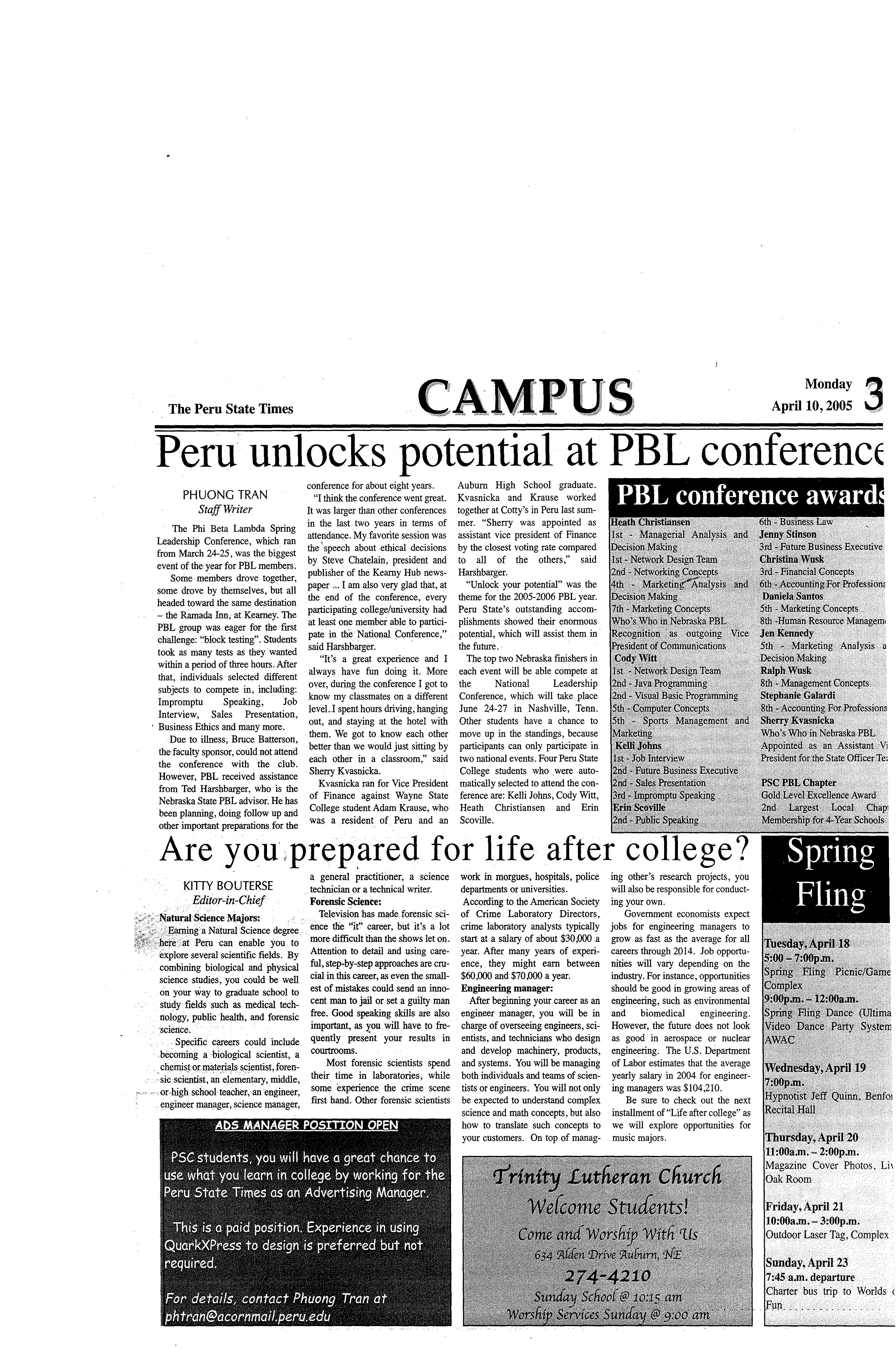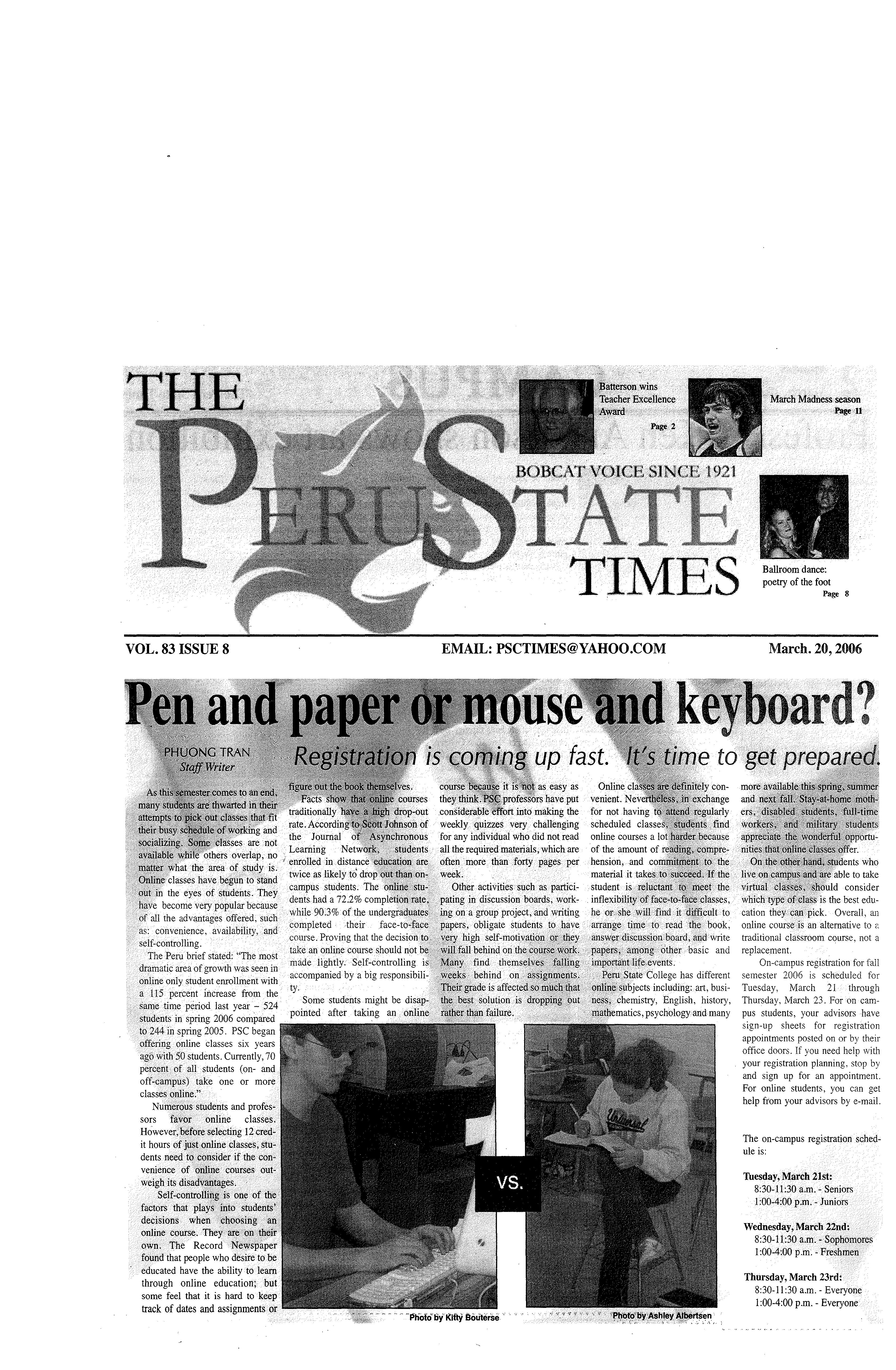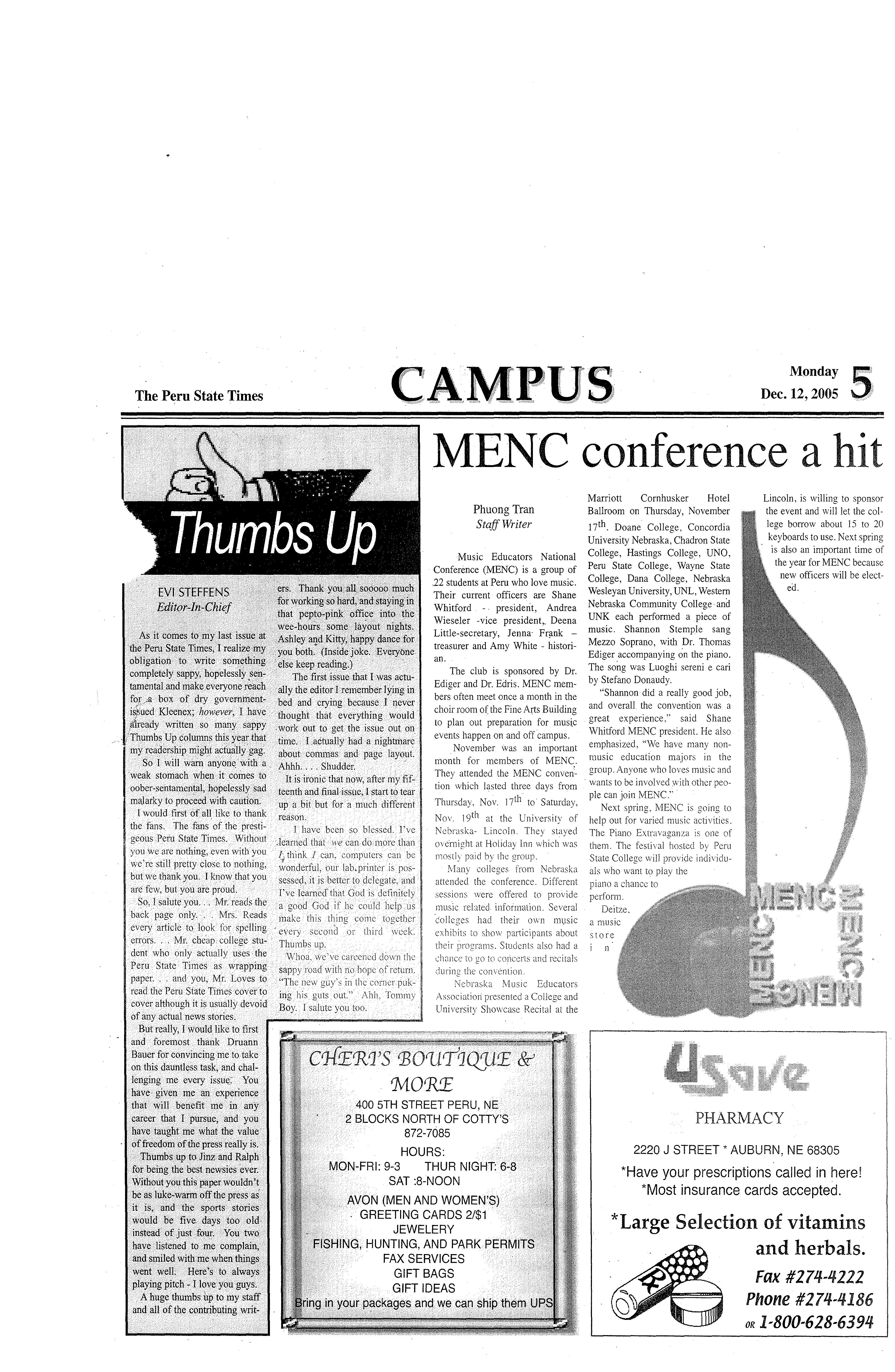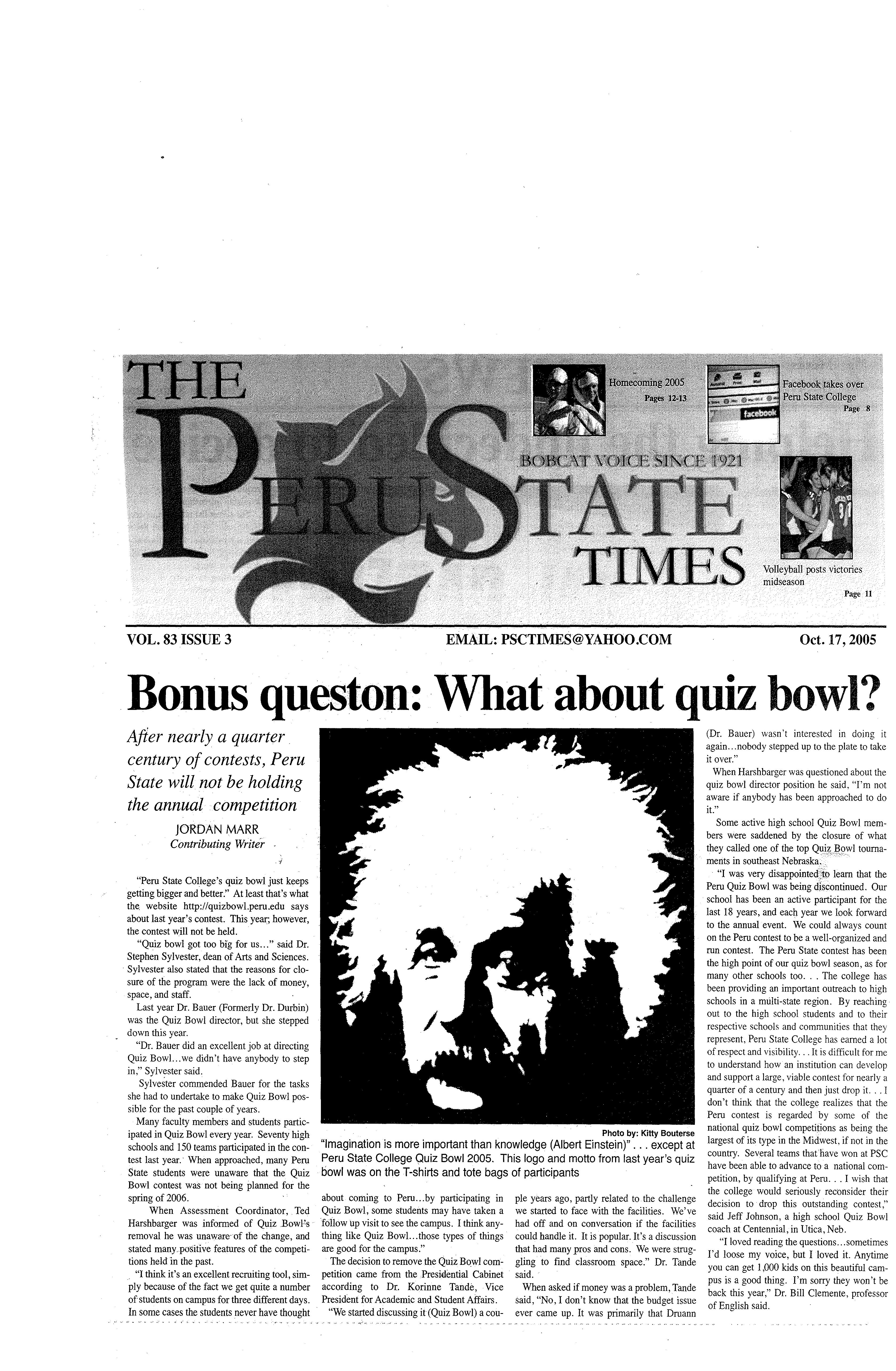 To reach the Times, cal.I us at (402)872-2260, e-mail us at psctimes@yahoo.com, or send material to the Peru State Times, Campus Mail, Peru State College, Peru, NE 68421. View us on the web at http://www.peru.edu- keyword: Peru State Times.