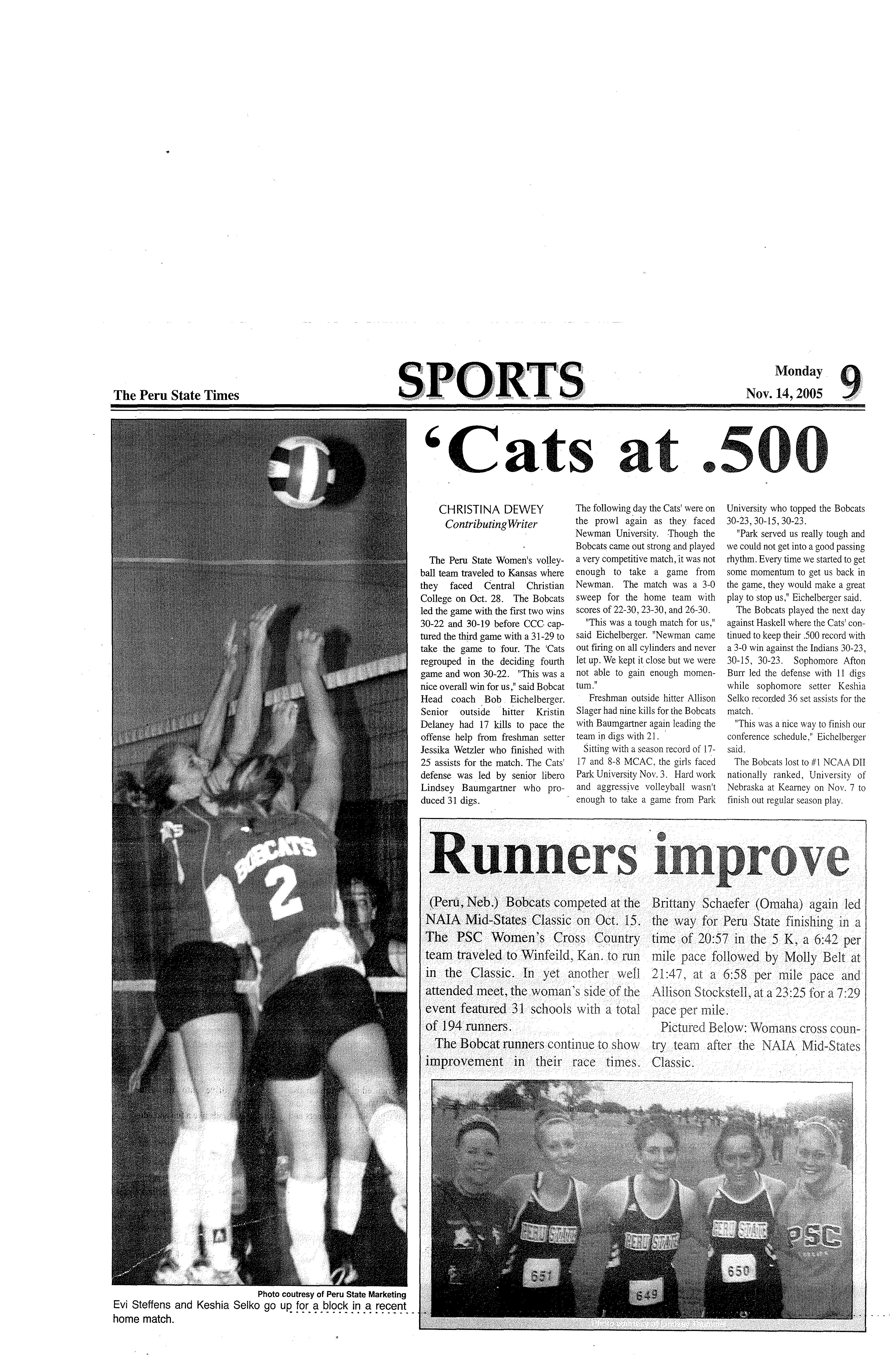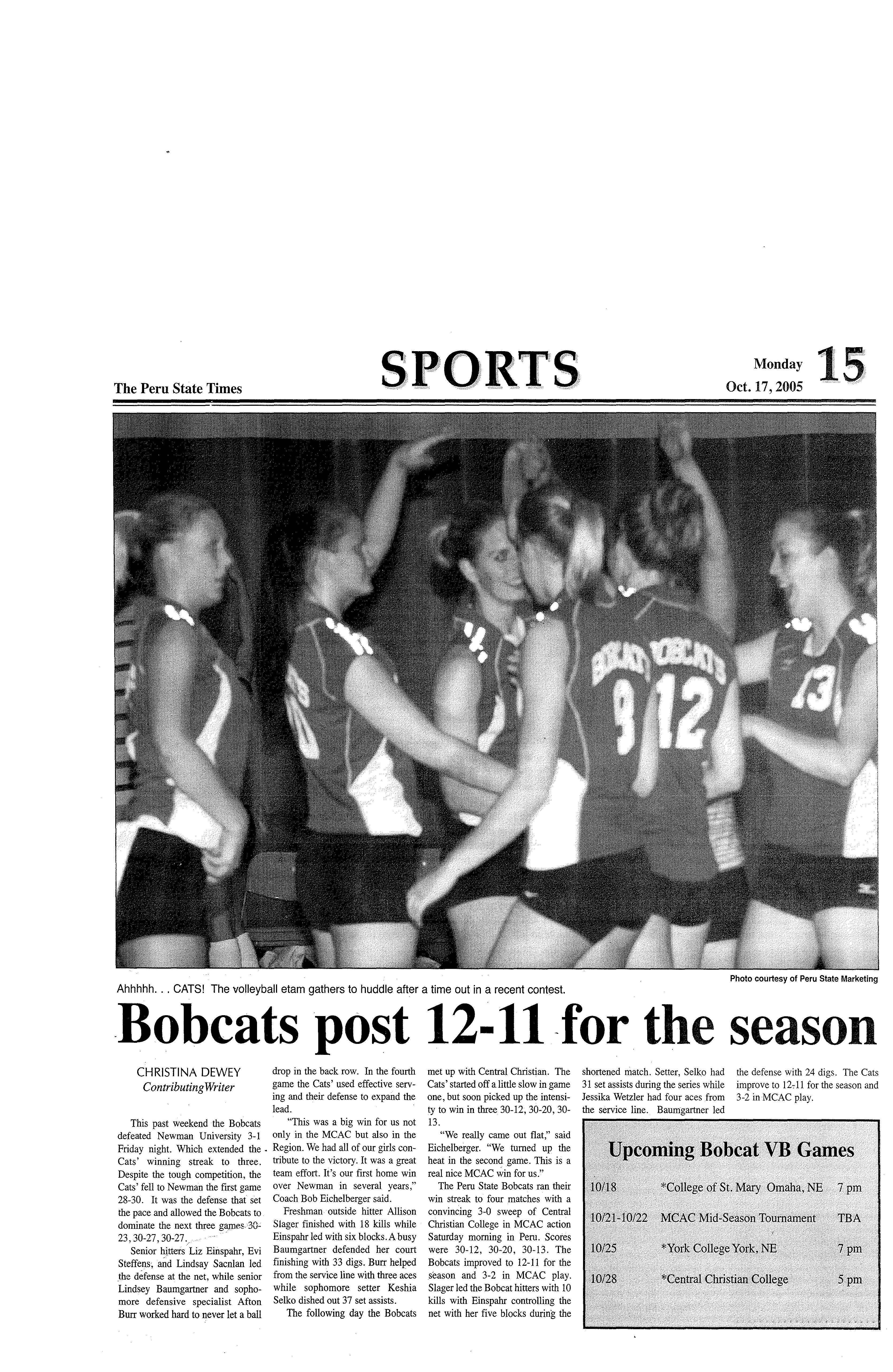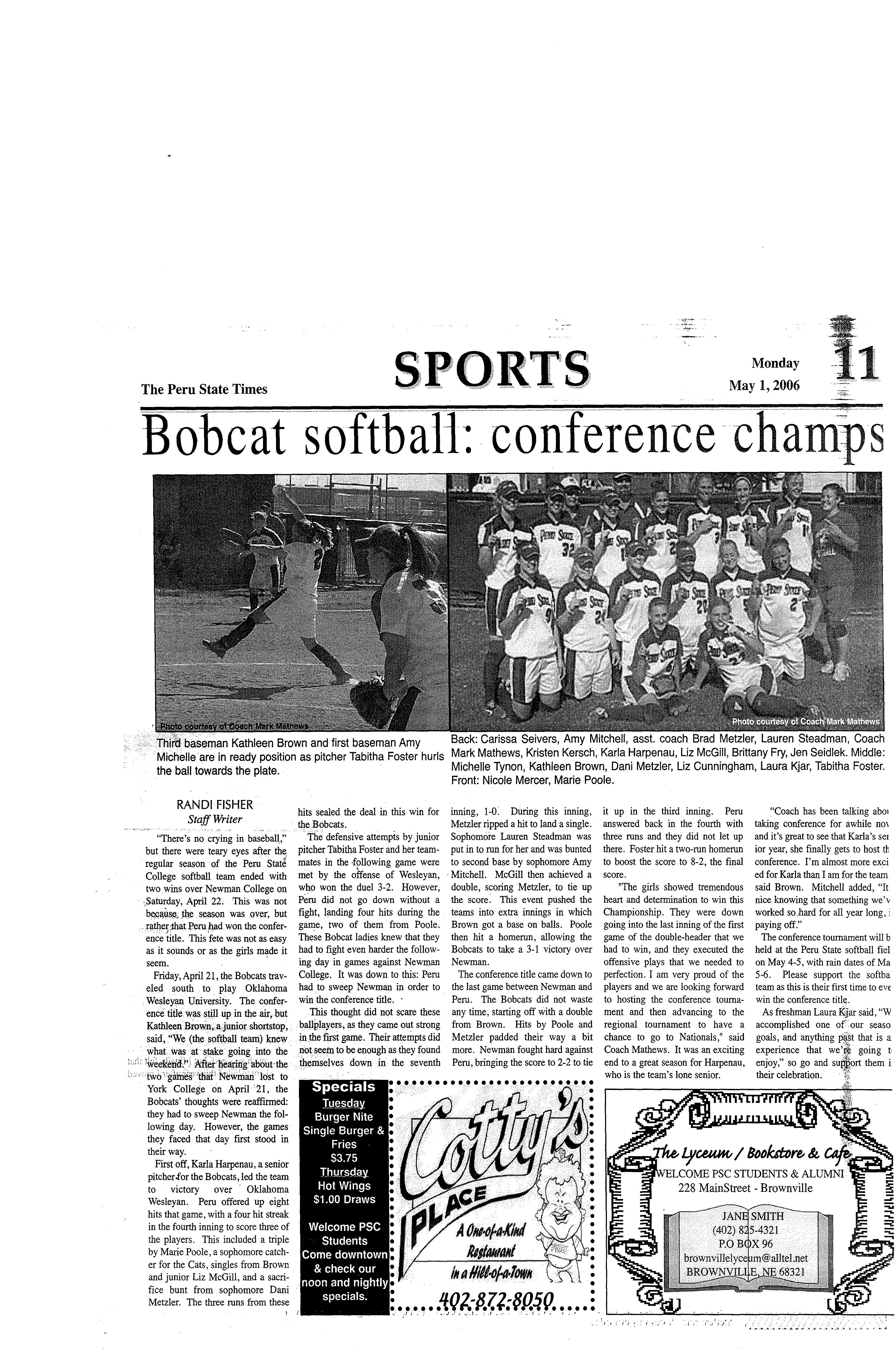 · The defensive attempts by junior pitcher Tabitha Foster and her teammates in the ·fpllowing game were met by the offense of Wesleyan, who won the duel 3-2. However, Peru did not go down without a fight, landing four hits during the game, two of them from Poole. These Bobcat ladies knew that they had to fight even harder the following day in games against Newman College. It was down to this: Peru had to sweep Newman in order to win the conference title. · This thought did not scare these ballplayers, as they came out strong in the first game. Their attempts did not seem to be enough as they found themselves down in the seventh