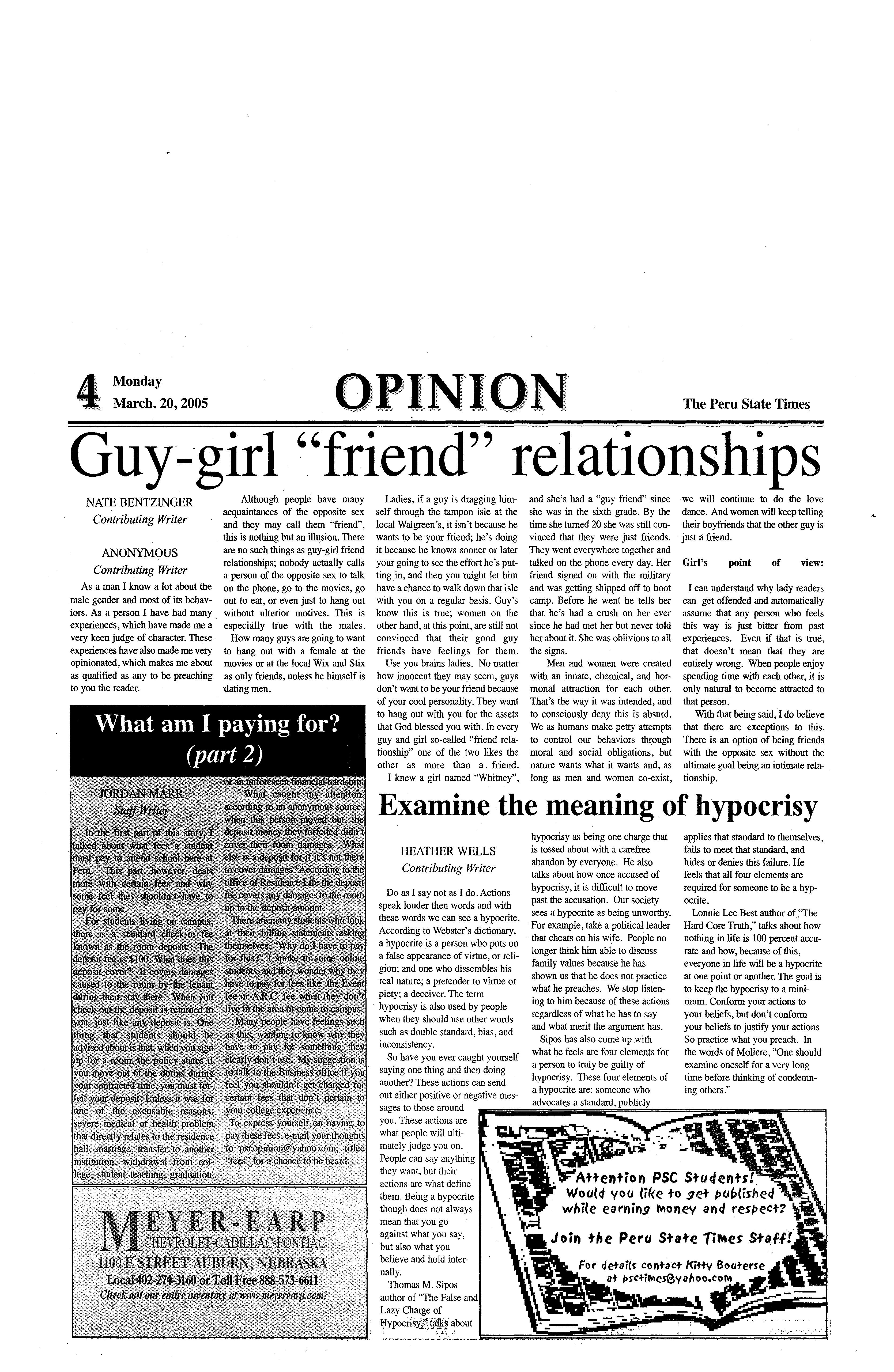 The opinions expressed in the Times may not be those of the entire editorial staff. The Peru Heather Wells ·State Times is an student publication funded by student publication fees. The Kristen Delaney views expressed in this publication do not necessarily reflect the views of the c;.::lministration, Heather Hlirst faculty or staff of Peru State College.
