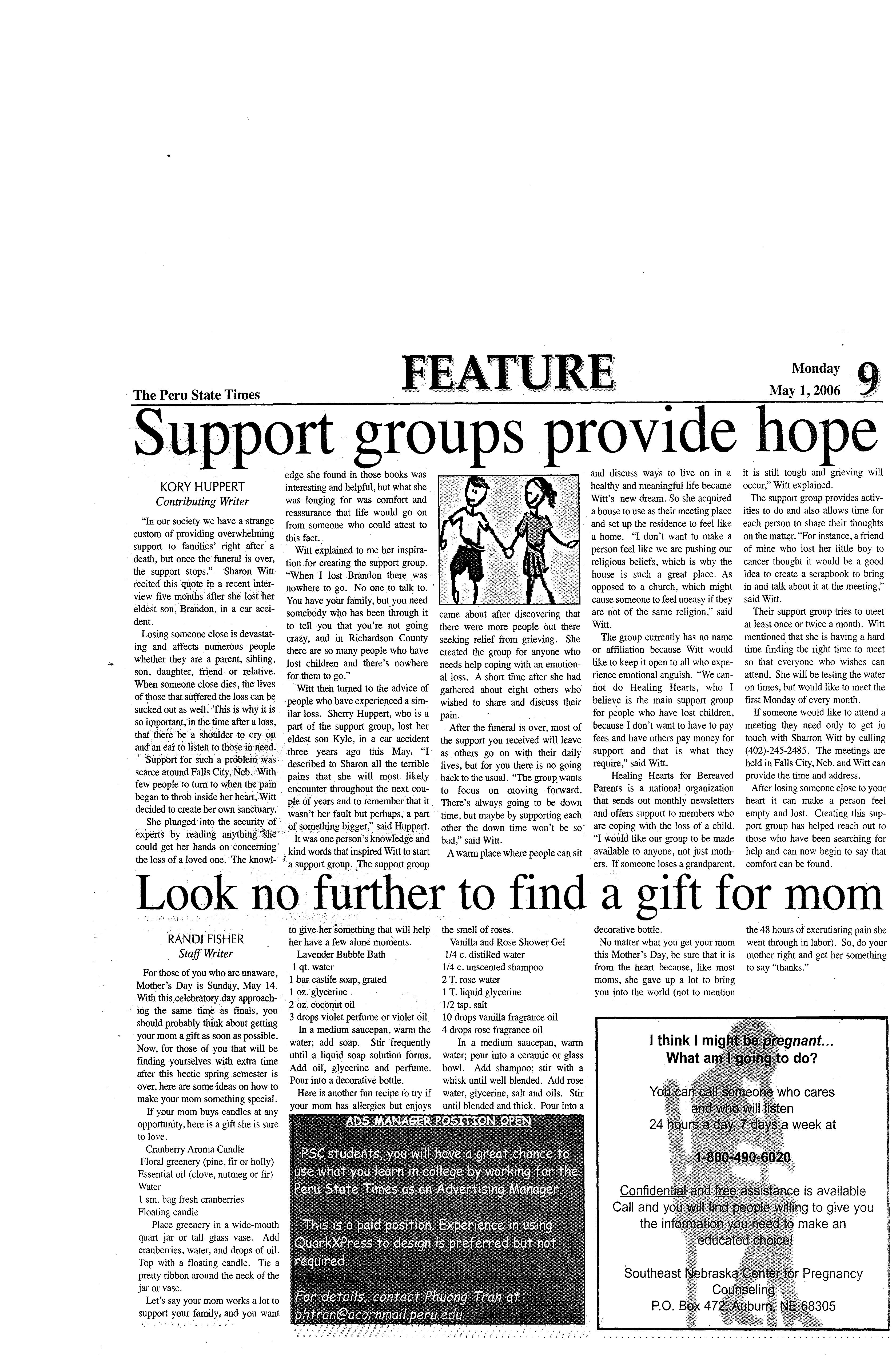 "When I lost Brandon there .was· house is such a great place. As idea to create a scrapbook to bring nowhere to go. No one to talk to. opposed to a church, which might in and talk about it at the meeting," You have yohr family, but.you need cause someone to feel uneasy if they said Witt. somebody who has been through it came about after discovering that are not of the same religion," said Their support group tries to meet to tell you that you're not going there were more people out there Witt. at least once or twice a month. Witt crazy, and in Richardson County seeking relief from grieving. She The group currently has no name mentioned that she is having a hard there are so many people who have created the group for anyone who or affiliation because Witt would time finding the right time to meet lost children and there's nowhere needs help coping with an emotion- like to keep it open to all who expe- so that everyone who wishes can for them to go." al loss. A short time after she had rience emotional anguish. "We can- attend. She will be testing the water Witt then mmed to the advice of gathered about eight others who not do Healing Hearts, who I on times, but would like to meet the people who have experienced a sim- wished to share and discuss their believe is the main support group first Monday of every month. sucked out as well. This is why it is ilar loss. Sherry Huppert, who is a pain. for people who have lost children, If someone would like to attend a so il)lportant,in thetime after a loss, part of the support group, lost her After the funeral is over, most of because I don't want to have to pay meeting they need only to get in