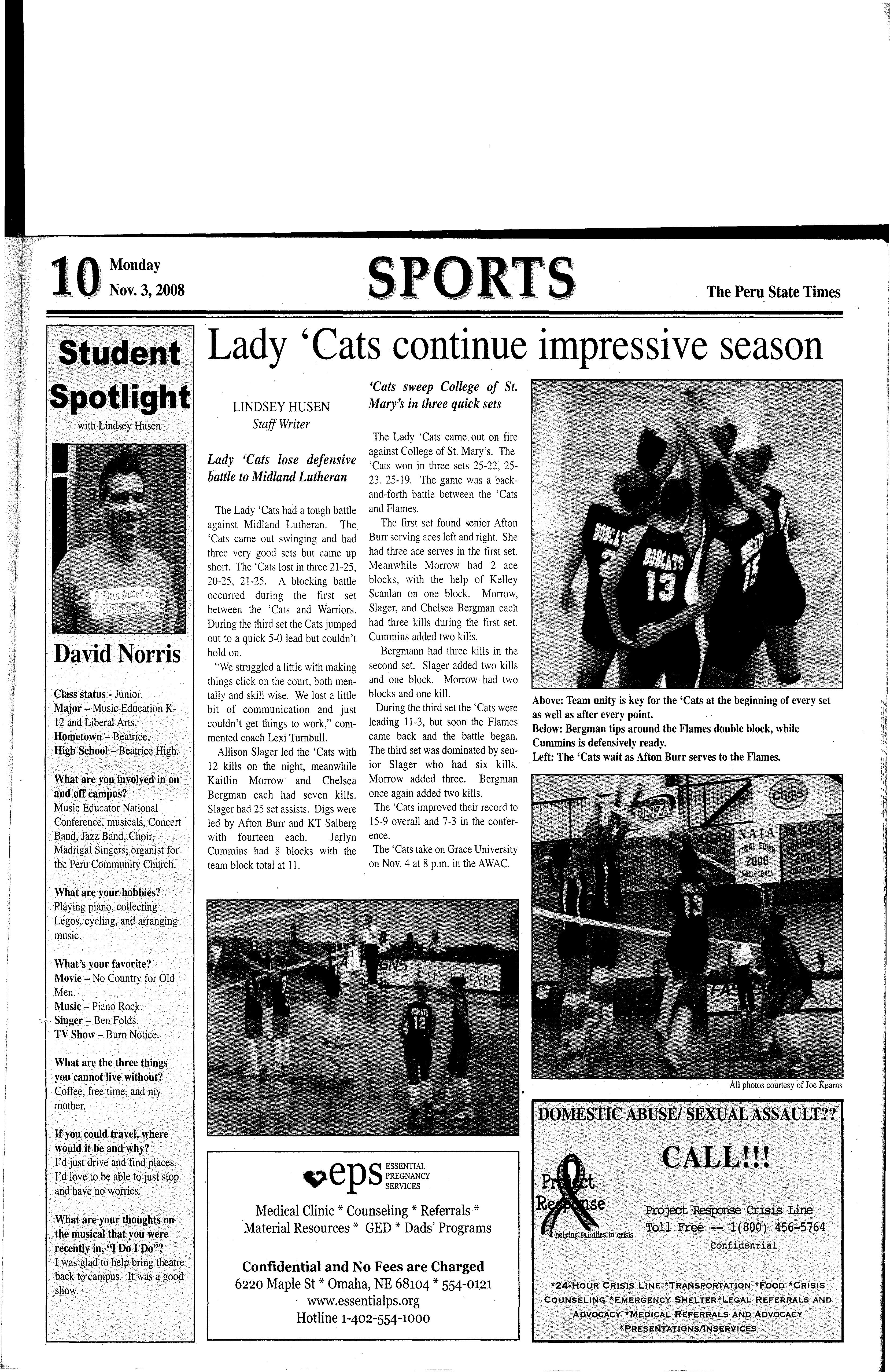 added two hit for the team. In game two, Doane's bats came alive as they broke a 3-3 tie after the third inning to capture a 10-5 victory over the Bobcats. Peru's five runs came off 11 hits as they left seven runners on base. Lyndsay Drumm started the game for the Cats as she threw five innings and received the loss. Natalie Zabel