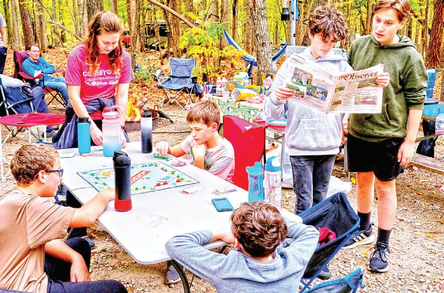 Nick Jamieson and friends Olivia and Alex Rudolph, Kellen Harding, Connor LeCompte and Will Jamieson paused their Monopoly game to read the article about the Honor Run in the Northwest Observer while on a camping trip at Falls Lake. Nick organized the Honor Run last October for his Eagle Scout project and his friends volunteered at the event.