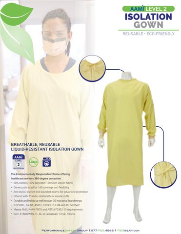The Environmentally Responsible Choice offering healthcare workers 360-degree protection • 60% cotton / 40% polyester 150 GSM woven fabric • Generously sized for full coverage and flexibility • Anti-static, low lint and bounded seams for advanced protection • Offered with 2” white stockinette or elastic cuffs • Durable and holds up well to over 25 industrial launderings • ISO 9001, 14001, 45001, 10993-10, FDA and CE certified • Meets ANSI/AAMI PB70 and ASTM F3352-19 requirements • Item #: ISOGWRY / L, XL or Universal / 10/pk, 100/cs