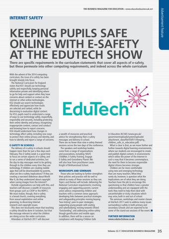 in Education (KCSIE) (www.gov.uk/ government/uploads/system/uploads/ attachment_data/file/550511/Keeping_ children_safe_in_education.pdf) What is clear is that, as we move further and further towards digital learning environments, where our students are encouraged to create and publish digital content, in environments which utilise the power of the Internet in such a way that it becomes commonplace, the need for them to become responsible digital citizens becomes stronger. Children are far more comfortable using new and emerging technology than are many teachers. What they rarely do, however, is question what the implications are of what they are doing. Teachers have the job to encourage this questioning so that children have a greater understanding and are equipped with the tools they need to help them deal with uncomfortable or tricky situations which may arise, both in and out of school. The seminars, workshops and master classes at EduTech 2017 seek to address many issues surrounding e-safety in both primary and secondary schools and are expected to be some of the stand-out sessions of the event. L FURTHER INFORMATION www.edutechshow.co.uk