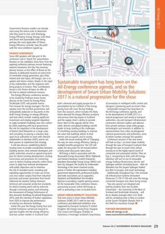 of innovation in intelligent traffic control and Glasgow’s pioneering work on Smart Cities. Sustainable transport has long been on the All-Energy conference agenda, and so the development of SUMS 2017 is a natural progression and aimed at transport authorities, city and transport infrastructure contractors, decision makers and advisors from private ventures, large utility groups, technologists and investors in addition to representatives from cities, local/regional/ national governments and authorities, some of whom number amongst the speakers. Conference sessions in the new event will look on Day 1 at smart urban mobility through the eyes of Transport Scotland; then through the eyes of smart cities; before moving on to the highly topical world of connected and automated vehicles. Then on Day 2, recognising its links with All-Energy, attention will turn to use of renewable energy, fuelling infrastructure, electric and hydrogen vehicles (including buses – after all Aberdeen has the largest hydrogen fuelled bus fleet in Europe); and smart technology. Additionally, throughout Day 1 the Innovate UK Infrastructure Systems Innovation Showcase (11:00-17:30) will cover the energy, connected transport and urban living sectors. Two very special cars designed and built by students from two Scottish Universities – the University of the West of Scotland and Strathclyde University – will be on display amongst other LCVs. Both will be competing later in May in London at the Queen Elizabeth Olympic Park in the Shell Eco-marathon Europe. L FURTHER INFORMATION www.all-energy.co.uk www.smarturbanmobilitysolutions.com