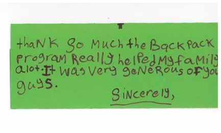 His teacher, seeing the need, enrolls Jacob in the BackPack Program. Now, on Friday afternoon, Jacob gets a bag filled with food that he can eat throughout the weekend; childhood classics like oatmeal, cereal, mac and cheese, PB&J, and pasta and sauce. He is now confident that he will have food to eat all weekend, and can return to school on Monday ready to learn. Jacob knows that the school and the community care about him and want to help him to reach his potential, and this food will help him and his family get through tough times.