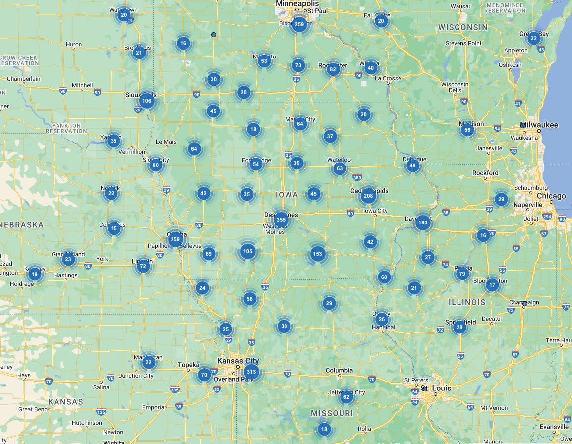 This cluster map depicts the location of all nonprofit organizations that have benefited from Hy-Vee’s “My Heart” Reusable Bag Program since their inception on October 26, 2019. These organizations provide important services to their communities in areas including civic, education, health and wellness, hunger relief, and military/veterans. The PSIM team works throughout the year to research, vet and regularly validate every nonprofit found or received by outside submission.