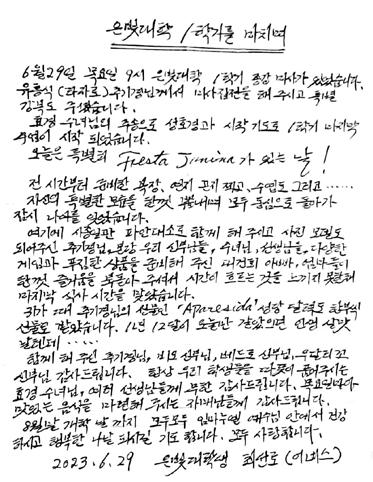 Agradeço ao Cardeal, padre Pio, padre Pedro, padre Uldarico que nos acompanharam. Agradeço infinitamente à irmã Hyo-Kyung e aos professores que sempre nos acolhem com muito carinho. Agradeço às irmãs que preparam as comidas deliciosas em todas as quintas-feiras. Rezo para que todos tenham saúde e os dias felizes junto ao Cristo Emanuel até o retorno das aulas em Agosto. Amo todos vocês.